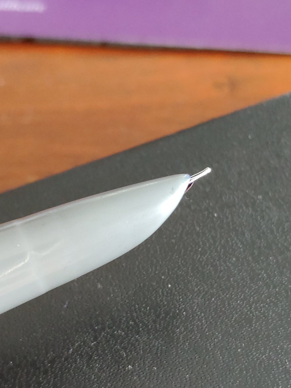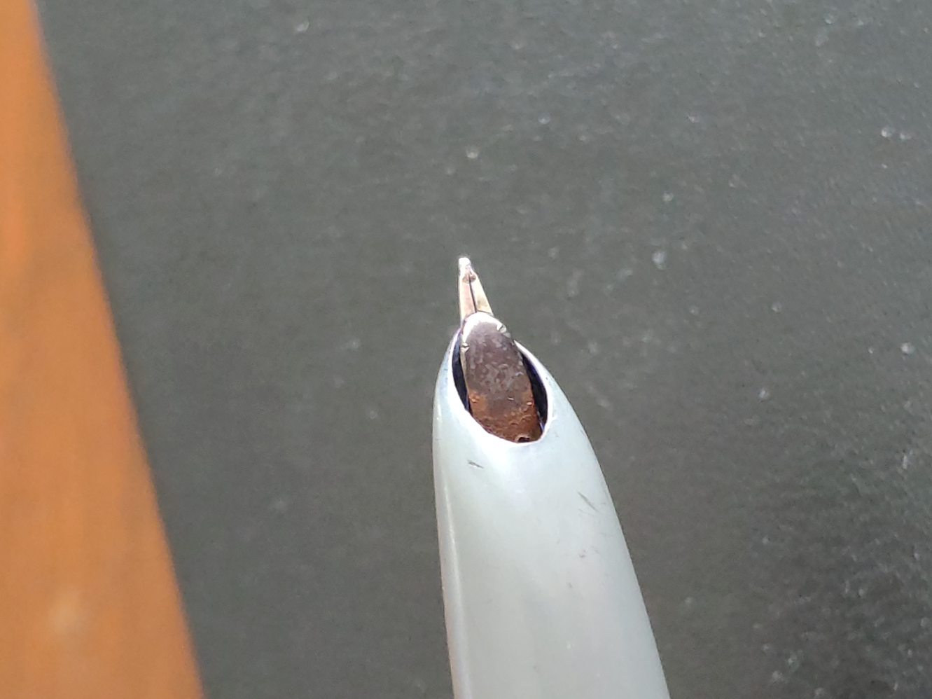 A occhio mi sembra che sia la punta di quel pennino sia più "stretta" (ovvero l'angolo sia più acuto) dell'originale. Inoltre sia il pennino che il conduttore parrebbero essere inseriti meno del normale nel corpo penna, cioè spuntano più del normale.
