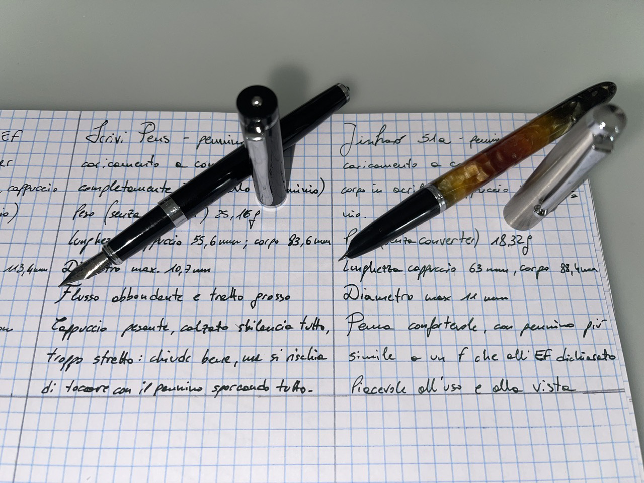 A una prima impressione sono veramente spettacolari: la 316 è un EF europeo super-scorrevole (provata su carta Rhodia e sembra di andare sul velluto). Scrive bene anche con il pennino sottosopra e arriva a EF vero. Quella in metallo è veramente in metallo e pesicchia, ma anche questa è molto scorrevole e piacevole da usare, non sbilanciata, con tratto F ma molto simile al EF dell’altra.