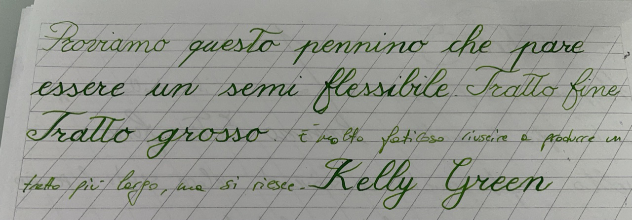Buone notizie per chi era interessato a un cinese molleggiato, perché il pennino sembra essere un pochino più flessibile di tutte le altre che ho provato finora: la prova della bilancia dice 550g e quindi, secondo la classificazione di Maturana Campos, si attesta sul Semi-Flessibile. Ho fatto qualche piccola prova e non è certamente un Brause blue pumpkin, ma si riesce a dare un po' di spessore alla linea.