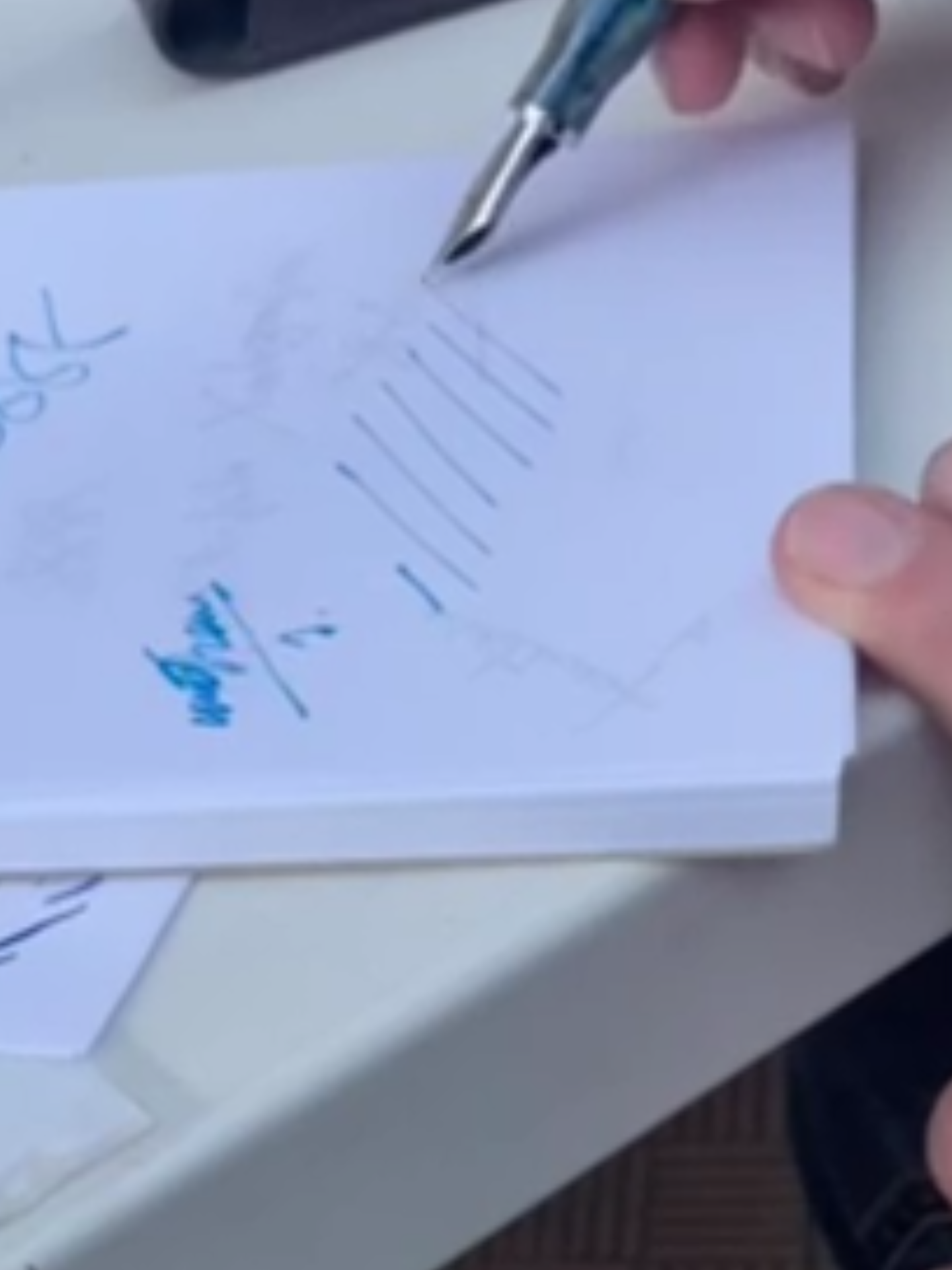Provato recentemente all’ultimo meeting del nostro circolo stilografico. Un gran bel pennino, fine dal lato con cui si scrive usualmente, architect sul lato a rovescio. Differenza tra tratto orizzontale (molto spesso) e tra quello verticale (finissimo) molto ampia (ovviamente sul lato architect). Purtroppo non ho fotografato la mia prova di scrittura.