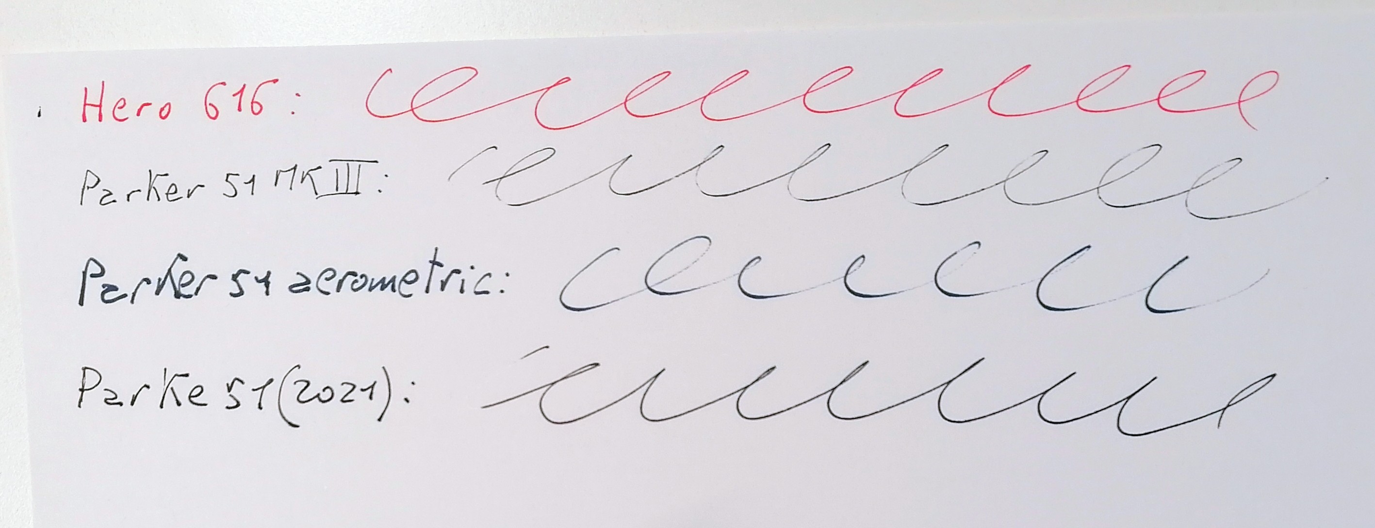 Uso abitaulmente da anni una Hero 616 (cappuccio acciaio, pennino acciaio F) e una Parker 51 MKIII (cappuccio oro, pennino oro F); la prima sempre tenuta con inchiostro rosso, la seconda con blu/nero.