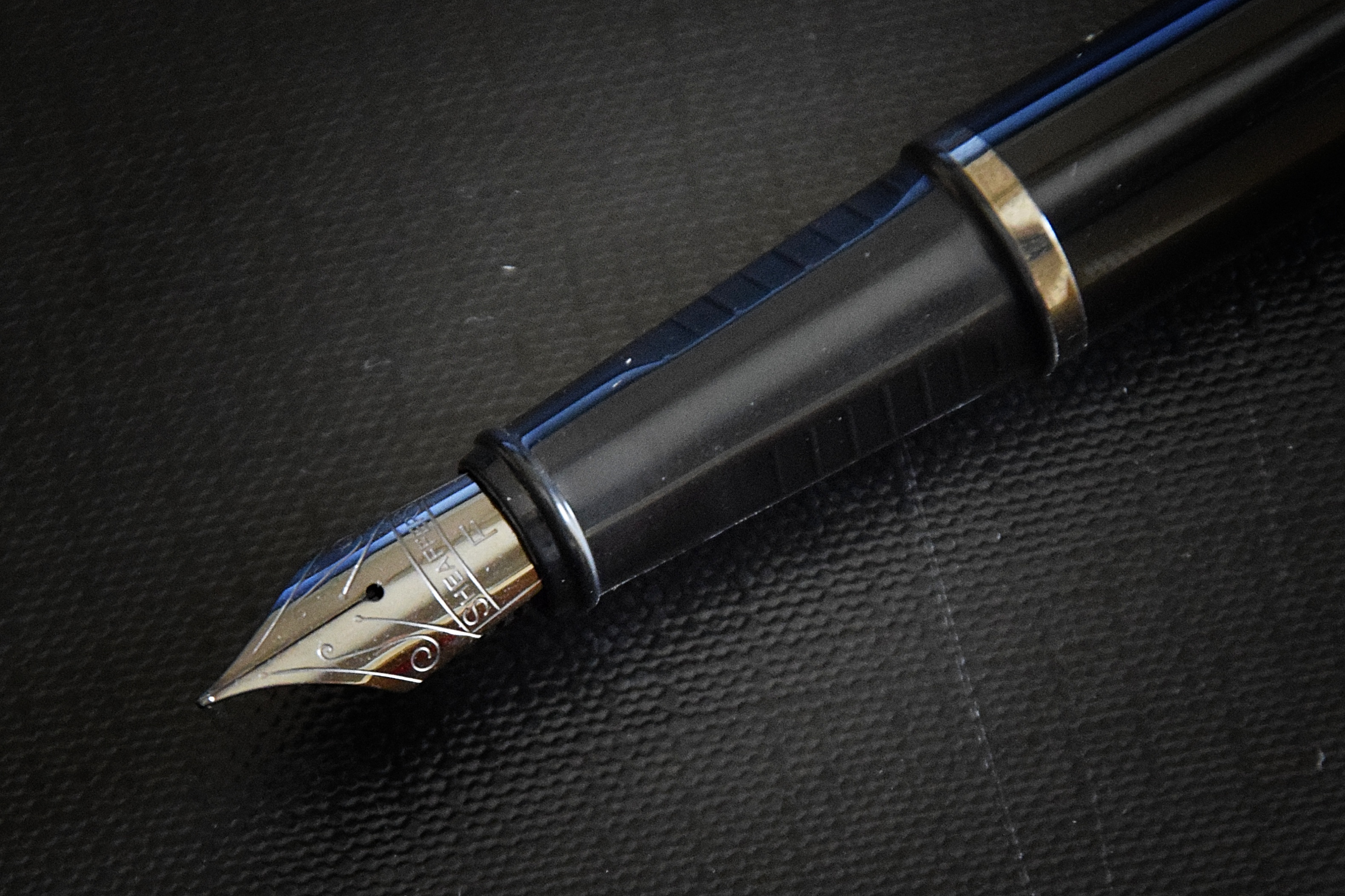 Il pennino, come le altre finiture, è nero brunito e presenta delle incisioni consistenti in un motivo decorativo, nel marchio della penna e nella misura del tratto. A prima vista sembra profondamente “incastonato” nella sezione, il che dà un senso di estrema stabilità.