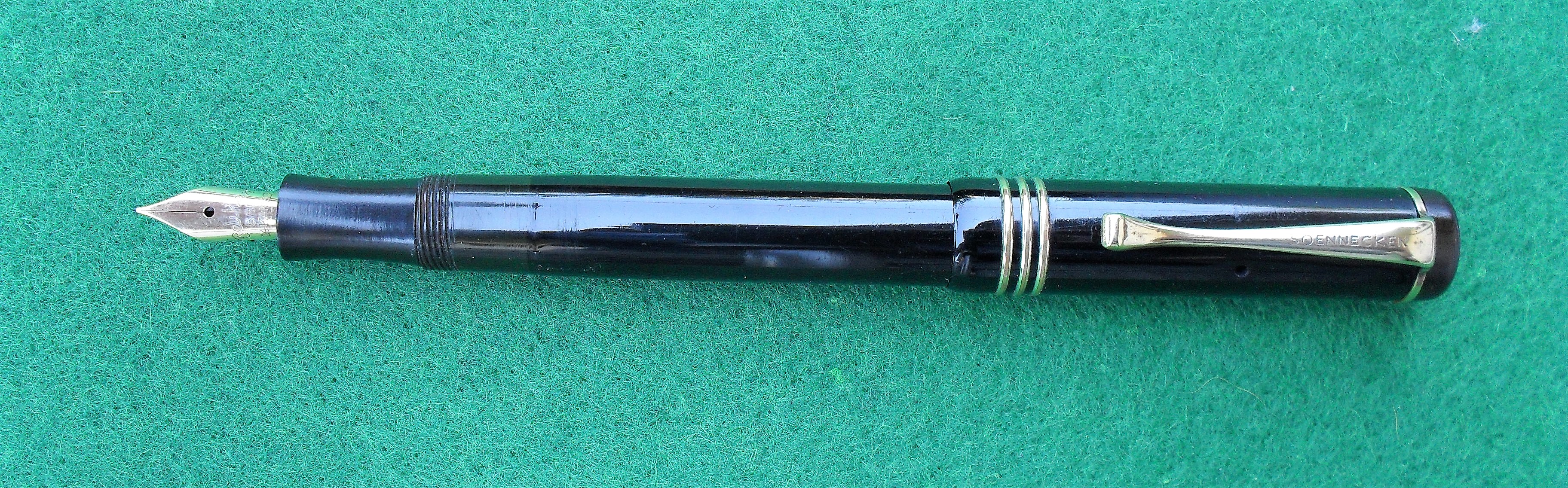 Prendendo in mano la penna, si nota subito che qualcosa la contraddistingue e la fa emergere nettamente dalla produzione media del periodo: il peso e la sensazione di solidità sono davvero peculiari e suggeriscono una qualità produttiva non comune, del resto confermata sia dallo smontaggio della stilografica, sia, esternamente, dalla qualità delle tre verette che adornano il cappuccio. Per non ripetermi sugli altri dettagli, vi rimando al link relativo alla riparazione, aggiungendo però che non mi stupisce affatto sapere che per molti Soennecken rimane il miglior produttore di stilografiche tedesco almeno fino alla seconda guerra mondiale.