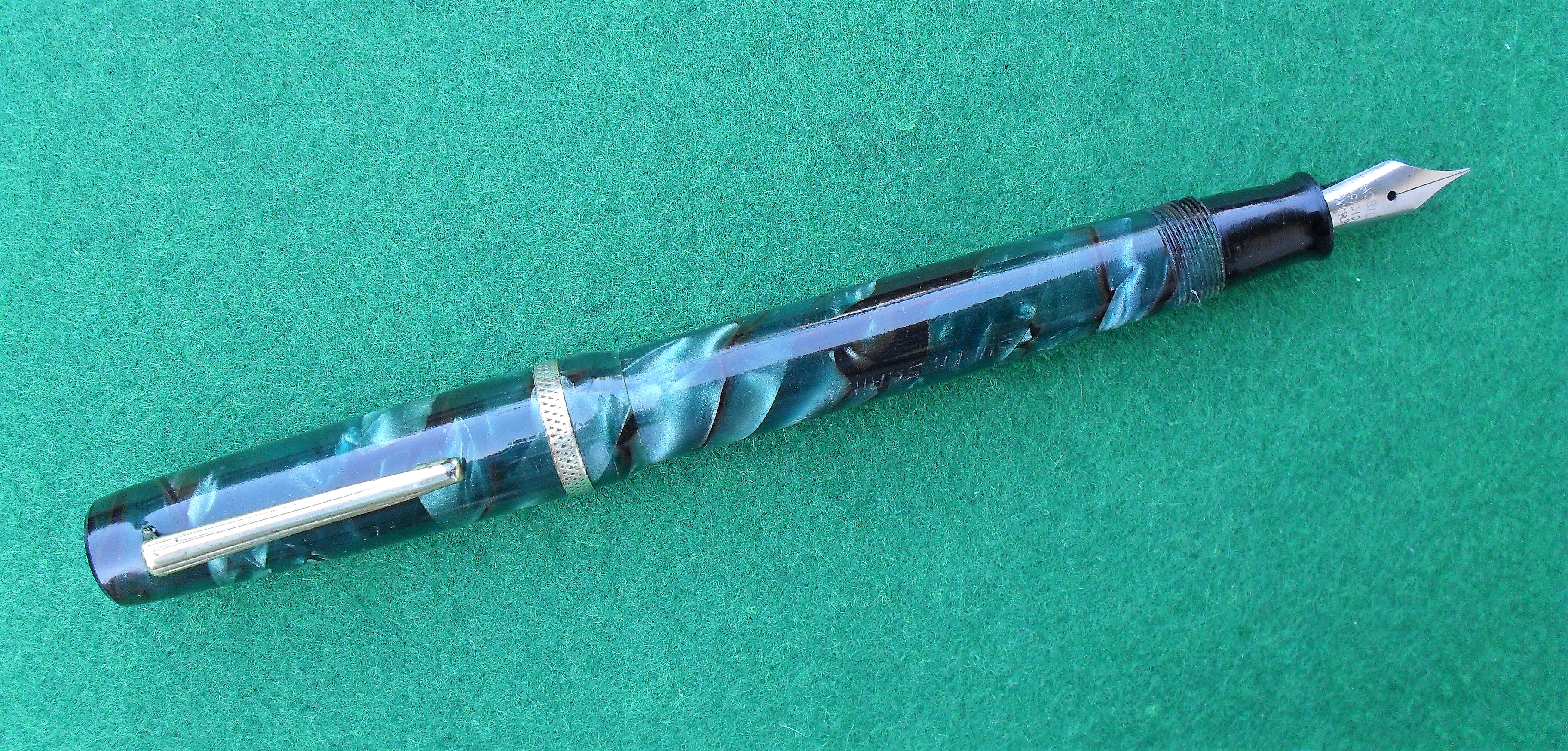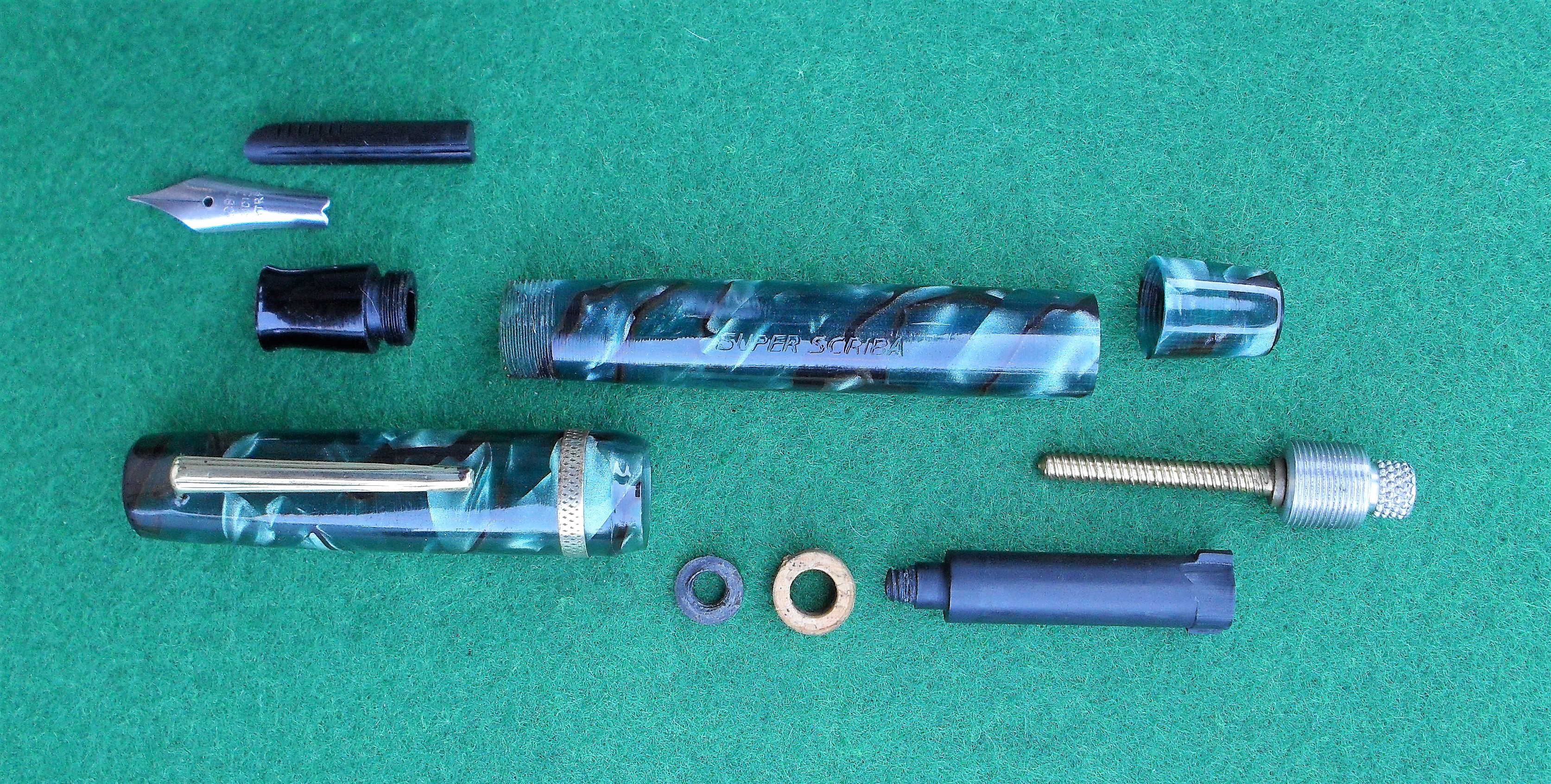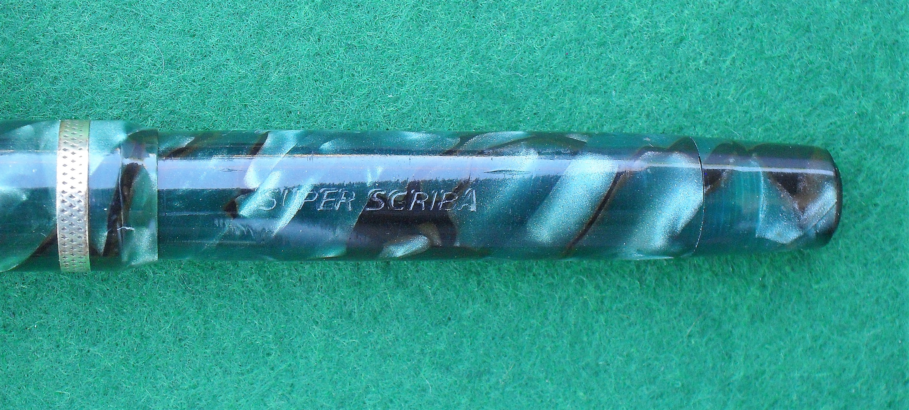 La mia ipotesi, non poi così geniale ma neppure, mi sembra, così fantasiosa, è che la Super Scriba che vedete possa essere stata prodotta negli anni Quaranta e che la penna abbia subito la sostituzione del pennino, che ora è un generico "Nobil iridio extra".