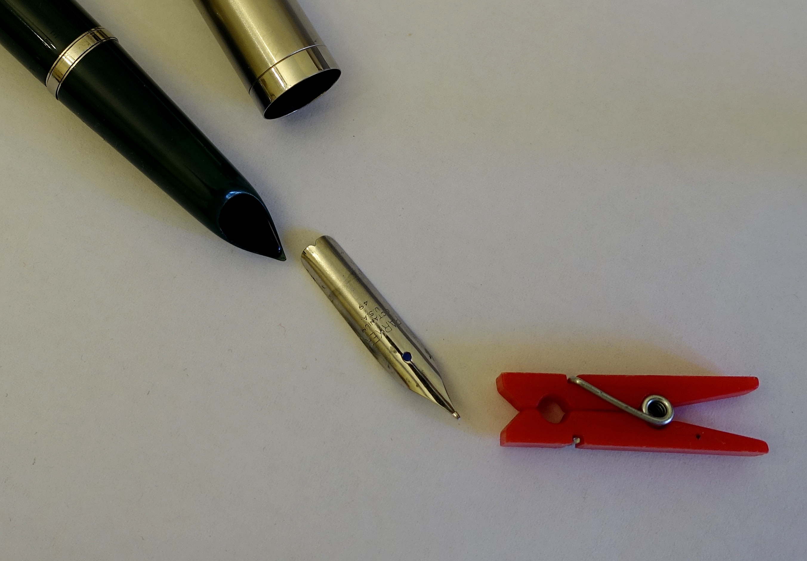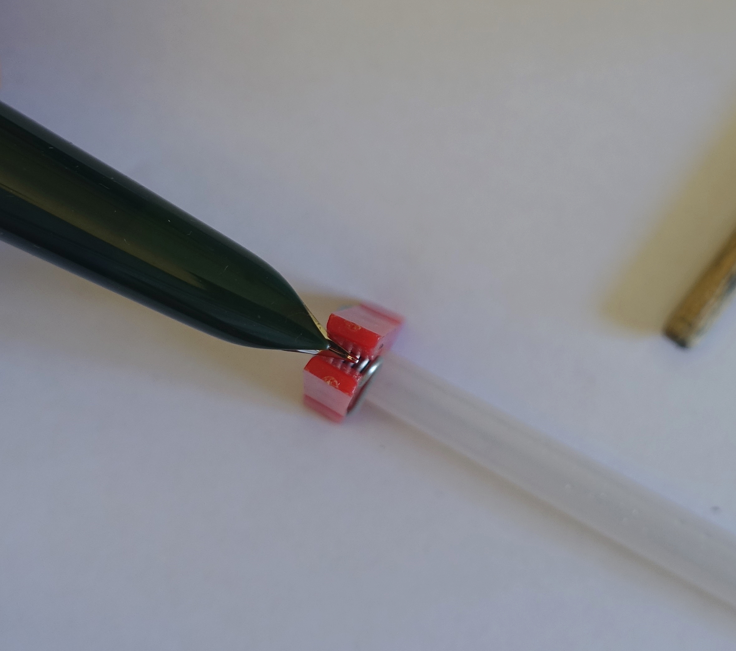 il risultato è che si sfila e si infila senza smontare il gruppo alimentatore. Il problema è che è molto ben ancorato e richiede parecchia forza per le due operazioni, mi sono aiutato con una mollettina, se per sfilarlo si corrono pochi rischi, ad infilarlo c'è da aiutarsi spingendo sulle coste del pennino, ho risolto il problema facendo molta attenzione con la medesima molletta. Da non dimenticare prima di infilarlo di rifilare con carta o limetta finissima i bordi posteriori del pennino per arrotondarli per che non si impunti e farlo scorrere meglio.