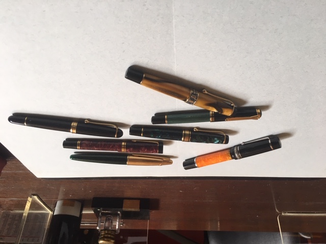 Ecco una panoramica delle penne inchiostrate e, da parte, quelle di maggior uso: Delta Dolce Vita Medium Size Piston, Aurora AfriKa, Aurora Optima in auroloide verde, Parker Duofold Centennial Red Marbre, Aurora 88 big rebbi lunghi, Waterman Edson.
