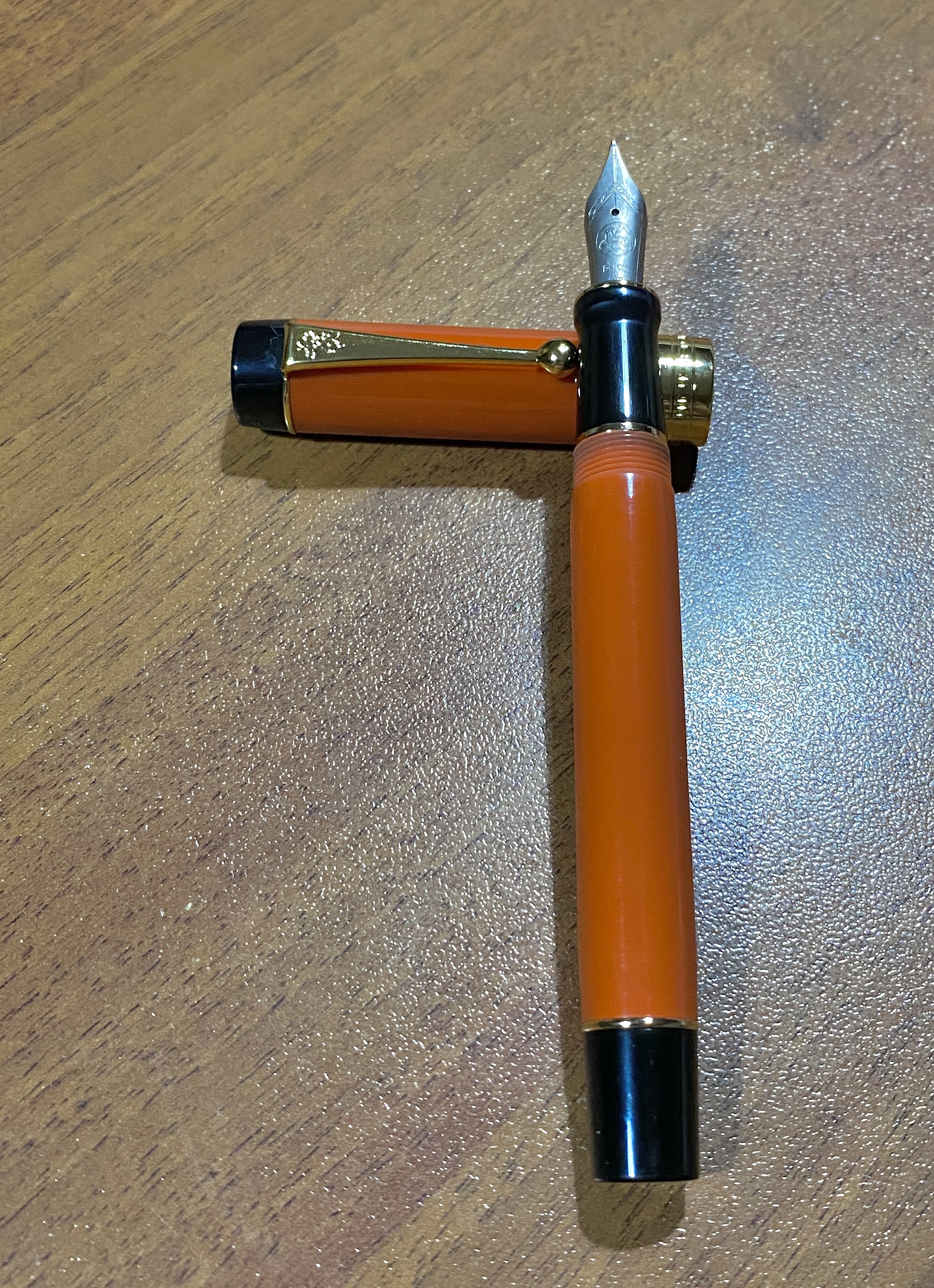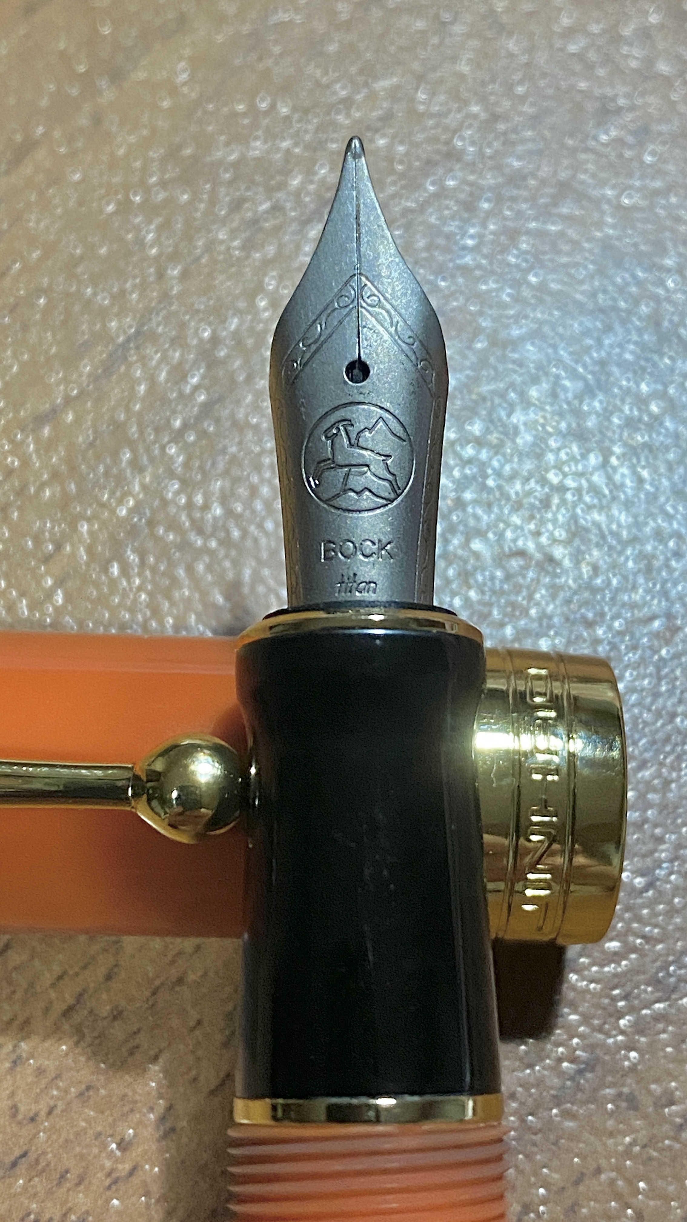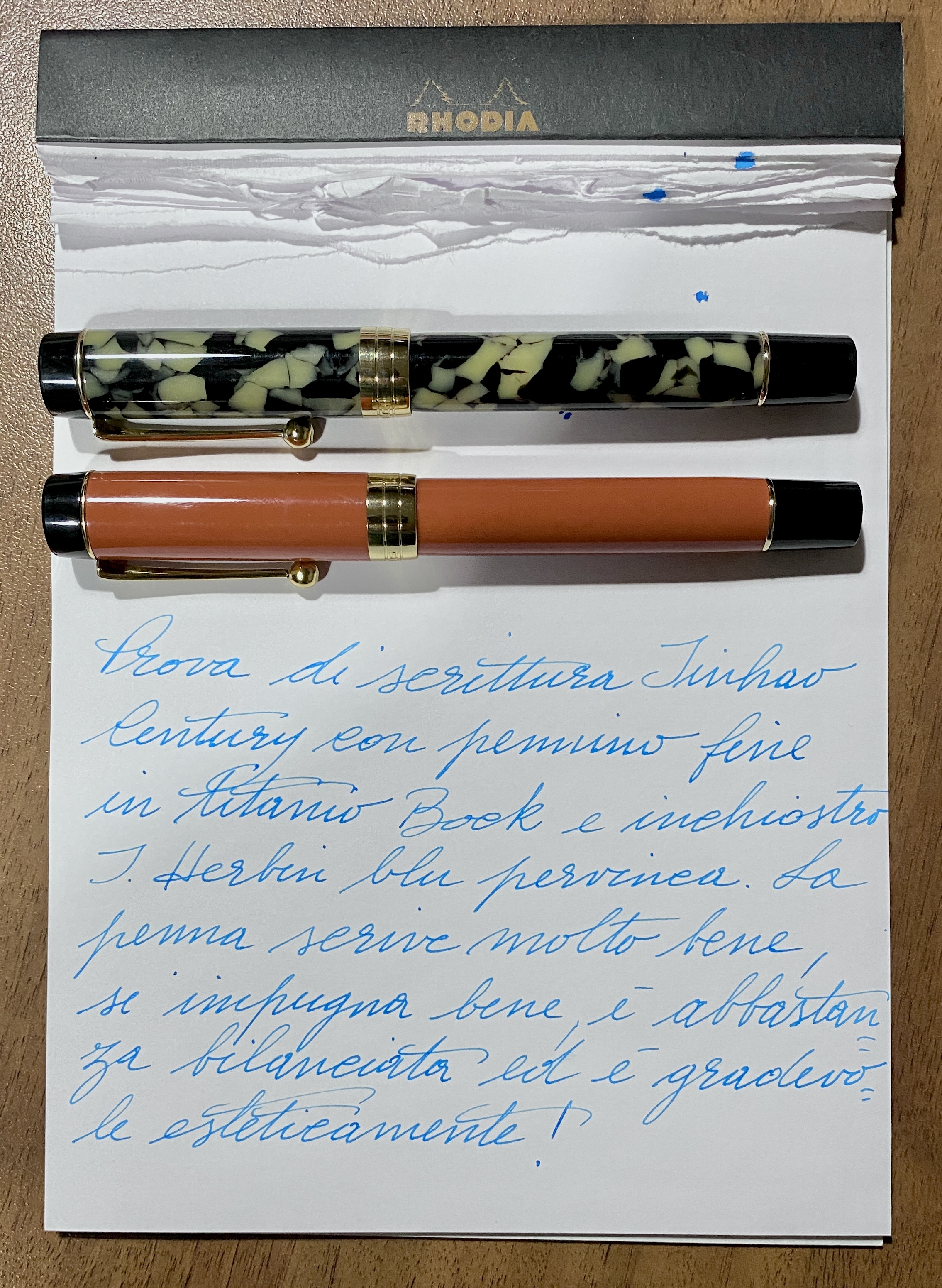 Ciao, il mio ultimo acquisto consiste in due Jinhao Century, una rossa (arancione scuro ?) e una nera a scaglie…. boh… giallo pallido, entrambe con finiture color oro. Appena lavate e asciugate ho cambiato subito i pennini con due Bock, uno bold e uno fine in titanio (lo so… forse non ha molto senso, visto che il solo pennino in titanio costa quanto 5 penne). L’ergonomia mi piace, l’estetica pure e funzionano anche bene.