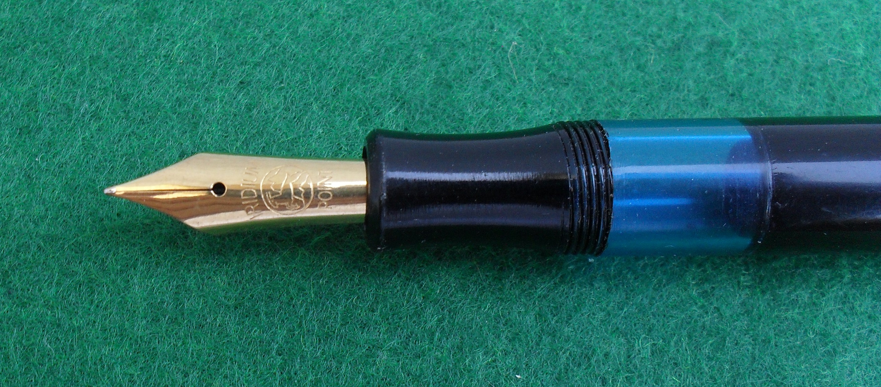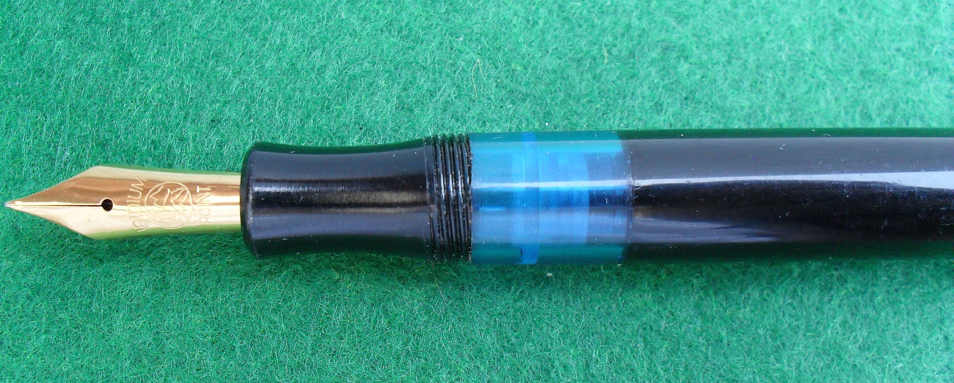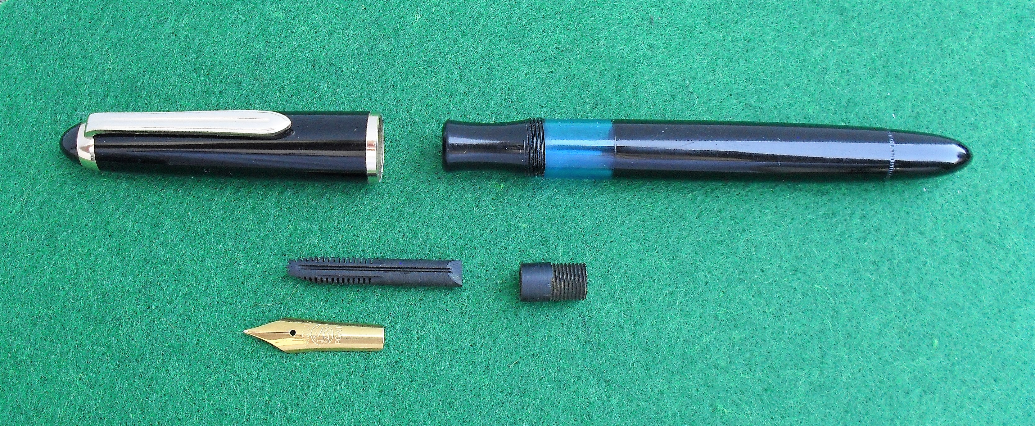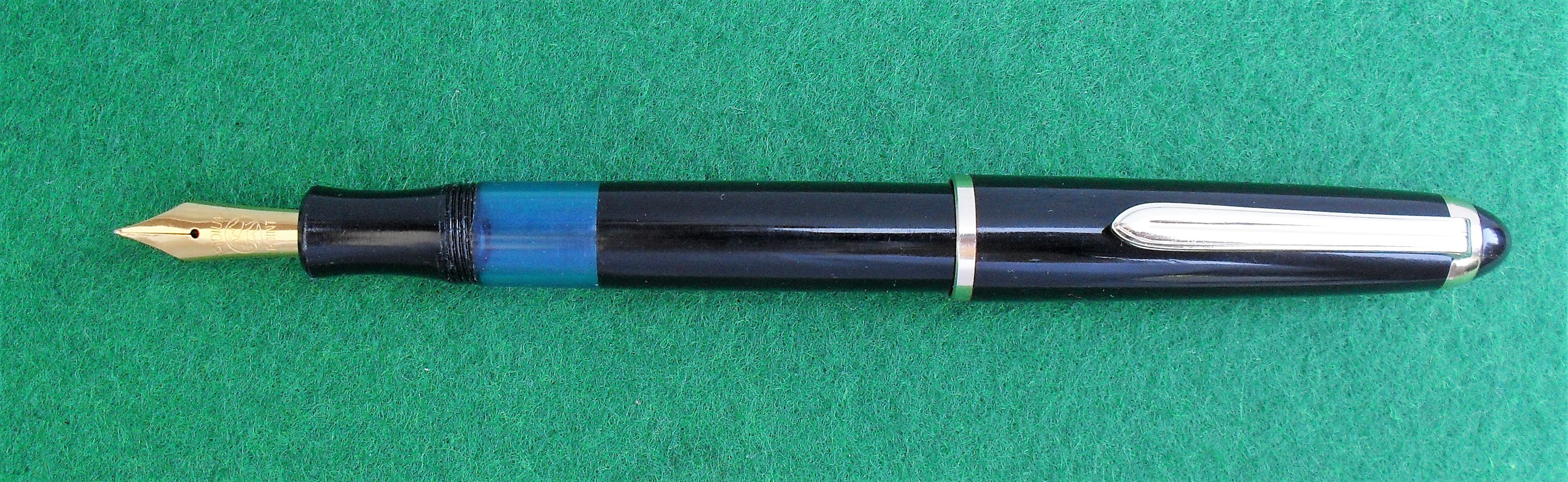 Il caricamento è a stantuffo, il pennino un Bock in acciaio dorato e la finestra azzurra alla base della sezione consente un'agevole verifica del livello d'inchiostro.