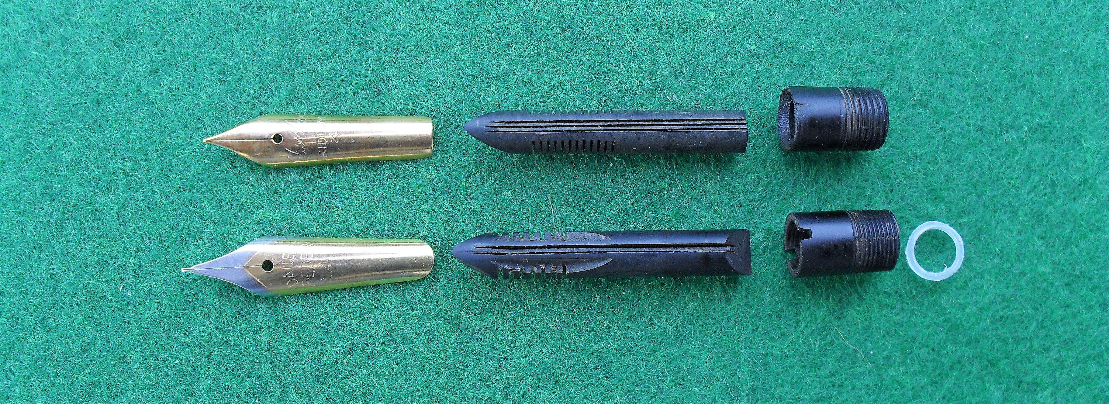 Entrambe a stantuffo, entrambe con il gruppo di scrittura inserito in un collarino che a sua volta si avvita nella sezione, entrambe con pennino in acciaio dorato (quello della Montegrappa immagino sia stato sostituito, perché si tratta di un Dauer Feder n.4 con punte sagomate, senza materiale di riporto), entrambe con finestrella per il controllo del livello d'inchiostro. Sembrano corrispondere ad uno standard nel quale probabilmente possono essere annoverate molte altre penne coeve, inclusa l'anonima che ho presentato un paio di giorni fa (viewtopic.php?f=13&t=24883).
