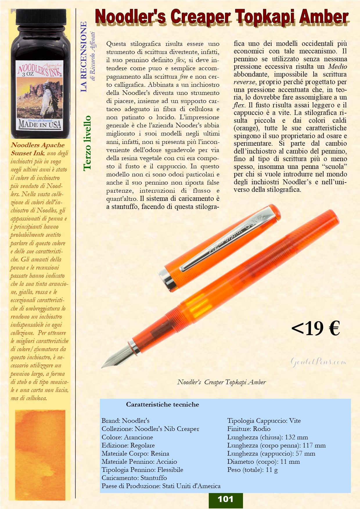 Il fusto risulta assai leggero e il cappuccio è a vite. La stilografica risulta piccola e dai colori caldi (orange), tutte le sue caratteristiche spingono il suo proprietario ad osare e sperimentare. Si parte dal cambio dell’inchiostro al cambio del pennino, fino al tipo di scrittura più o meno spesso, insomma una penna “scuola” per chi si vuole introdurre nel mondo degli inchiostri Noodler’s e nell’universo della stilografica, con un'occhiata anche alla calligrafia.