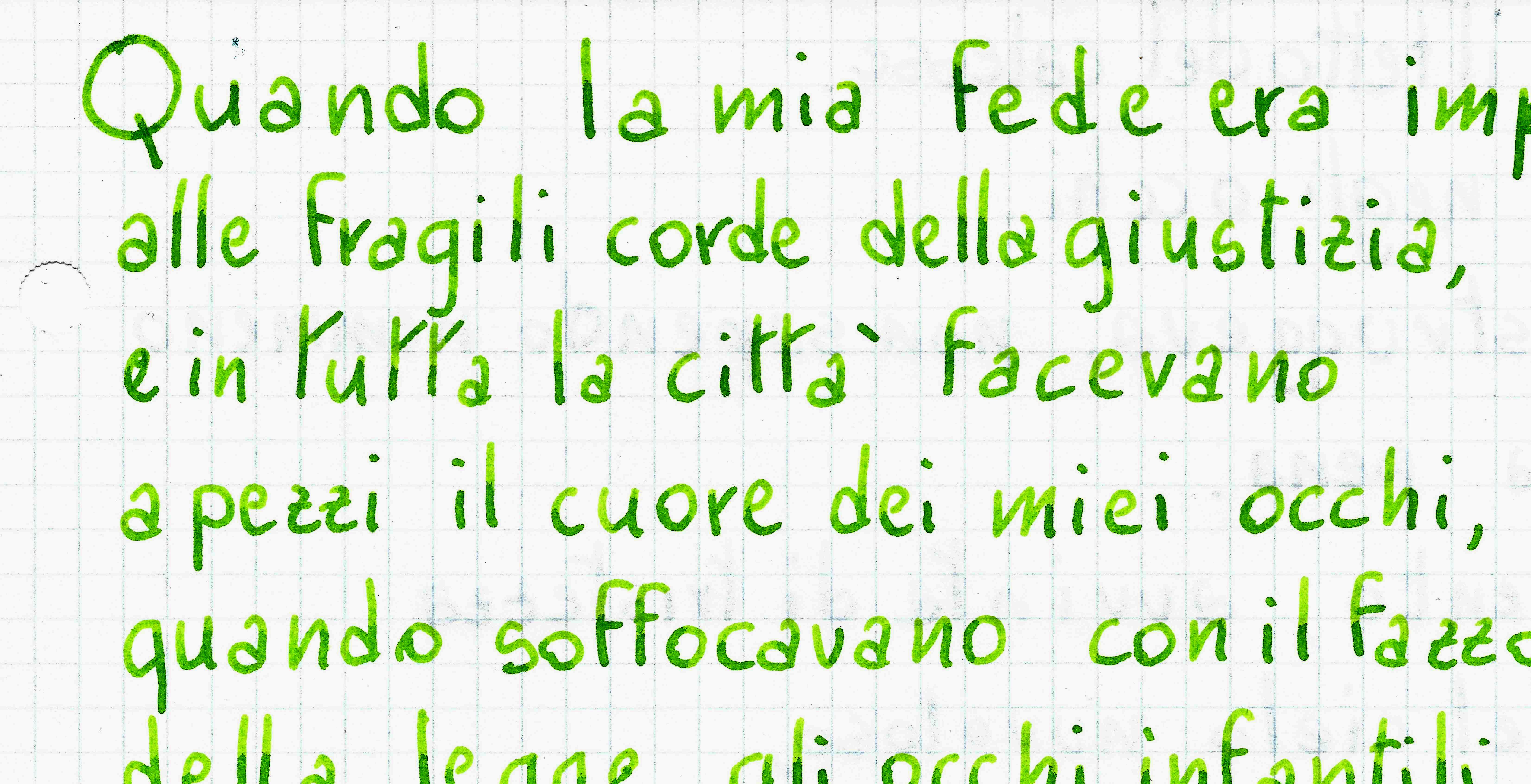 Già da un primo sguardo, si capisce che è un verde chiaro pieno di personalità: come il – per la verità molto simile – Diamine Calligraphy Passion, ha uno shading pronunciatissimo che passa dal verde prato, al giallo, al verde bandiera. Valorizzato appieno da un pennino grande (un B o un M abbondante, direi), crea l’effetto del vento che passa tra l’erba alta. Insomma, questa volta è proprio vero: nomen omen.