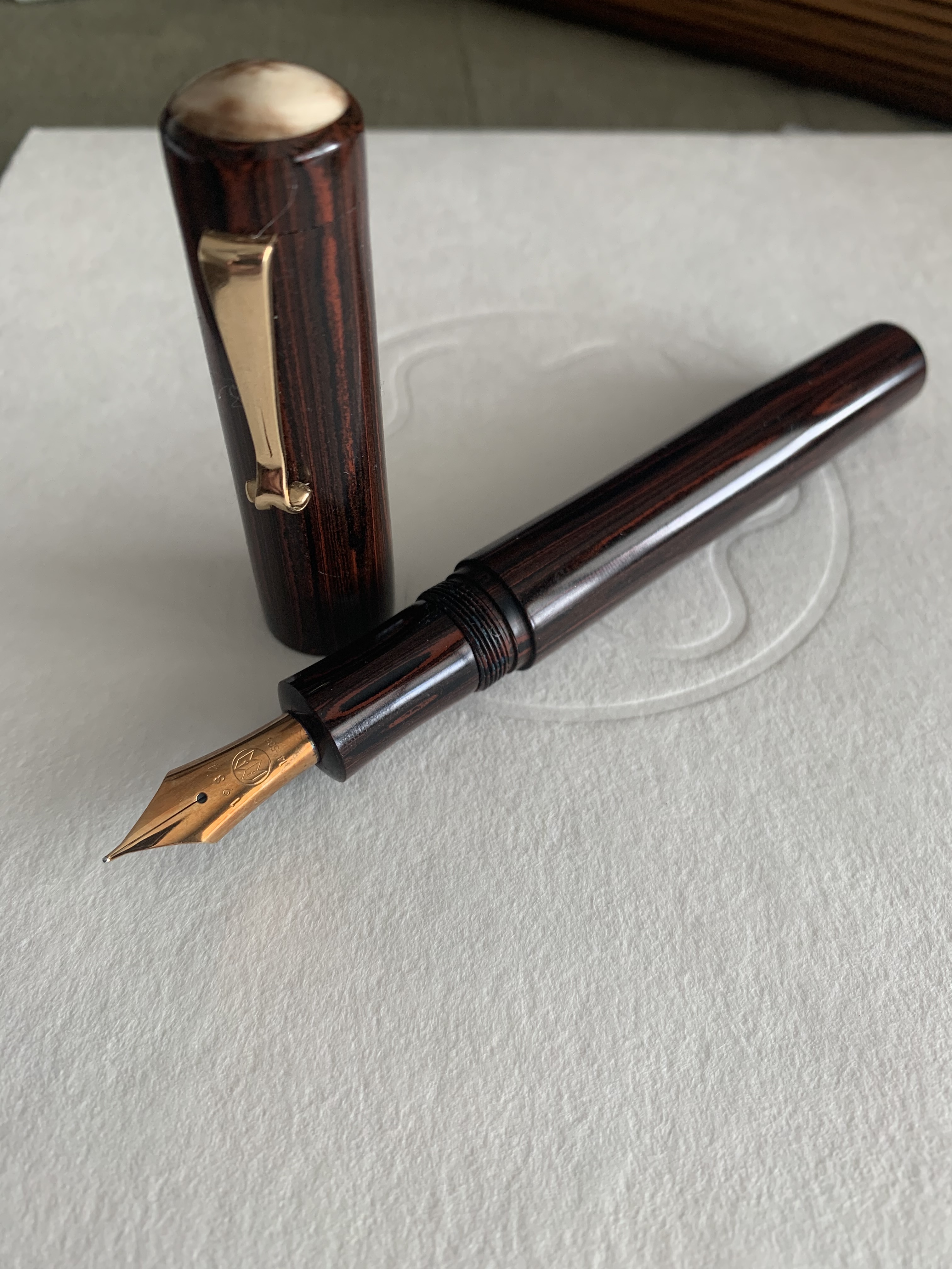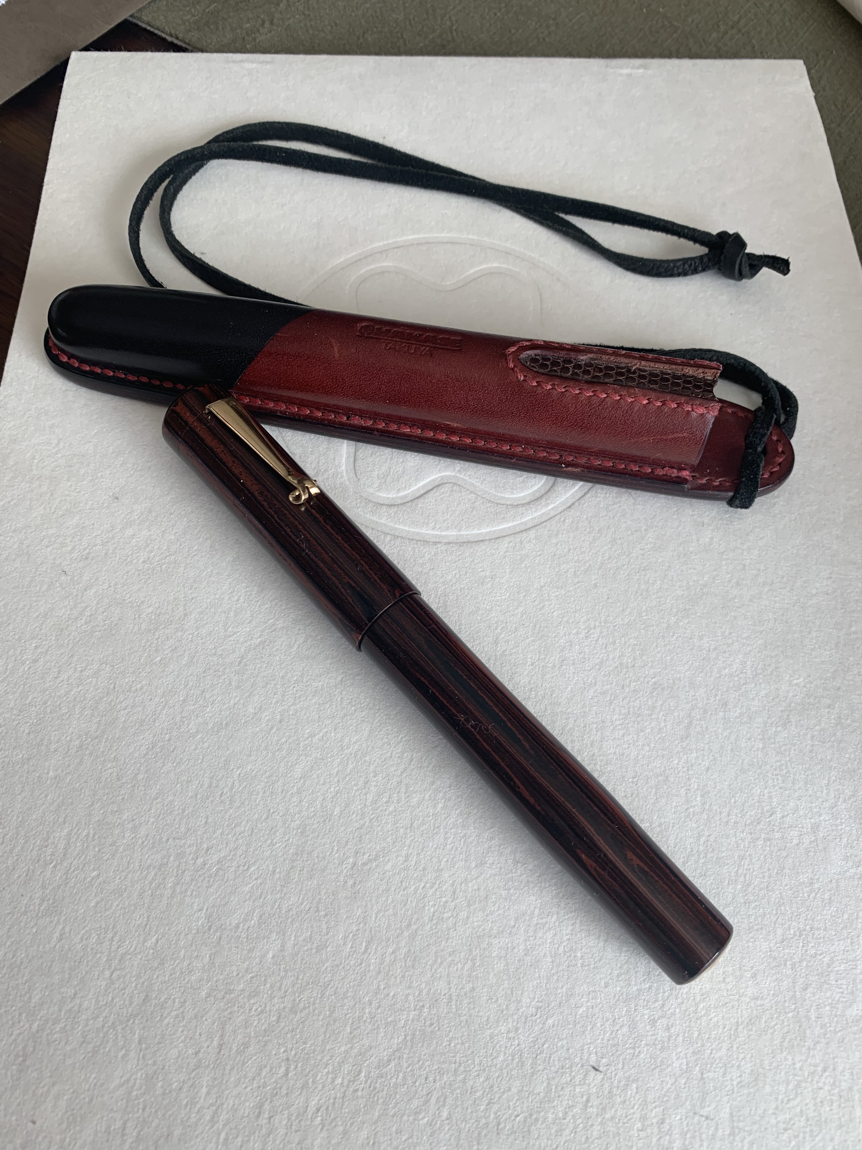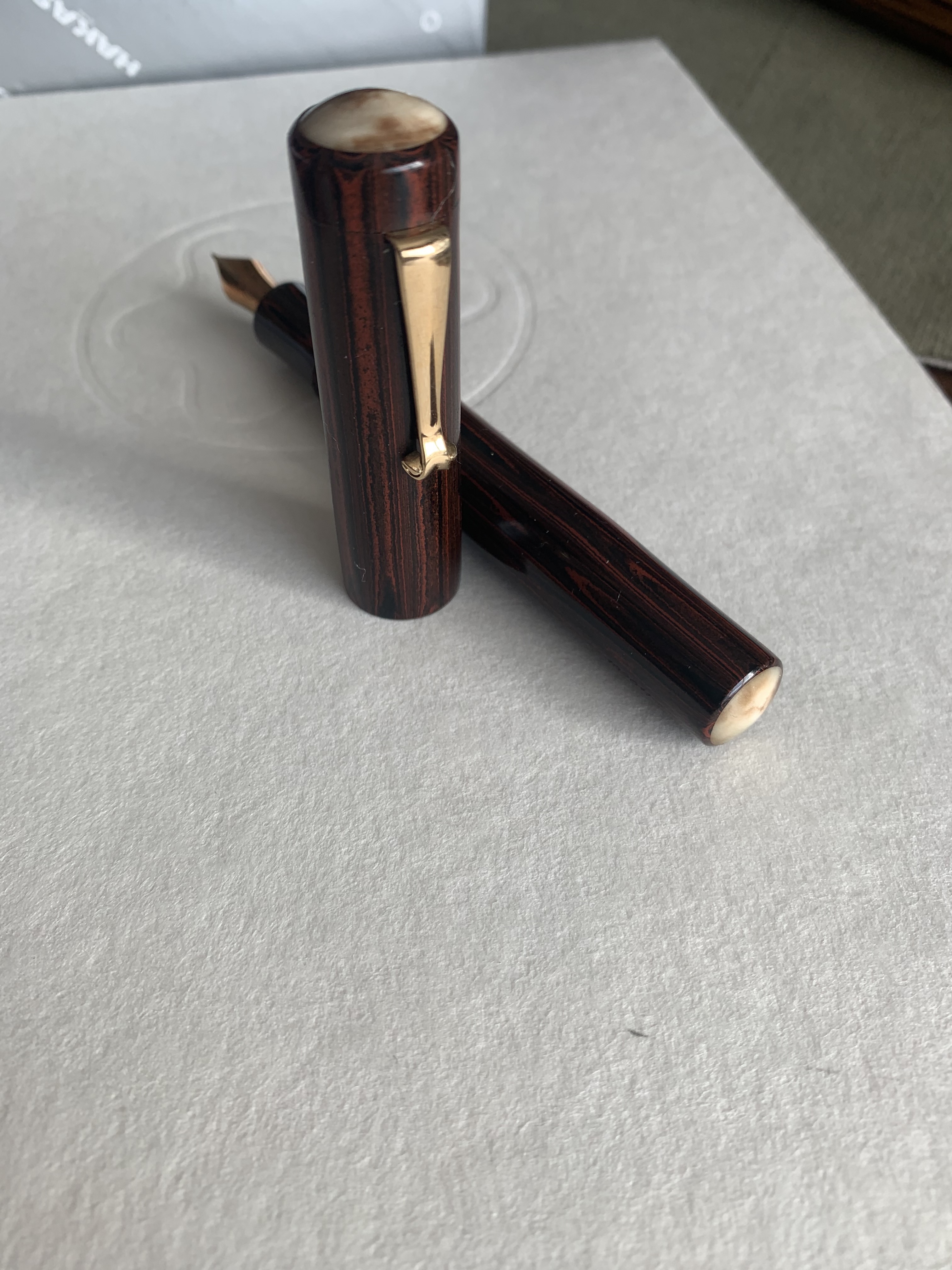 Il corpo e’ in ebonite nero-rosso con estremità in corno, il pennino e’ un Pilot #15 rimarcato Hakase ma che viene customizzato dalla Hakase, la clip e’ in oro 14K.