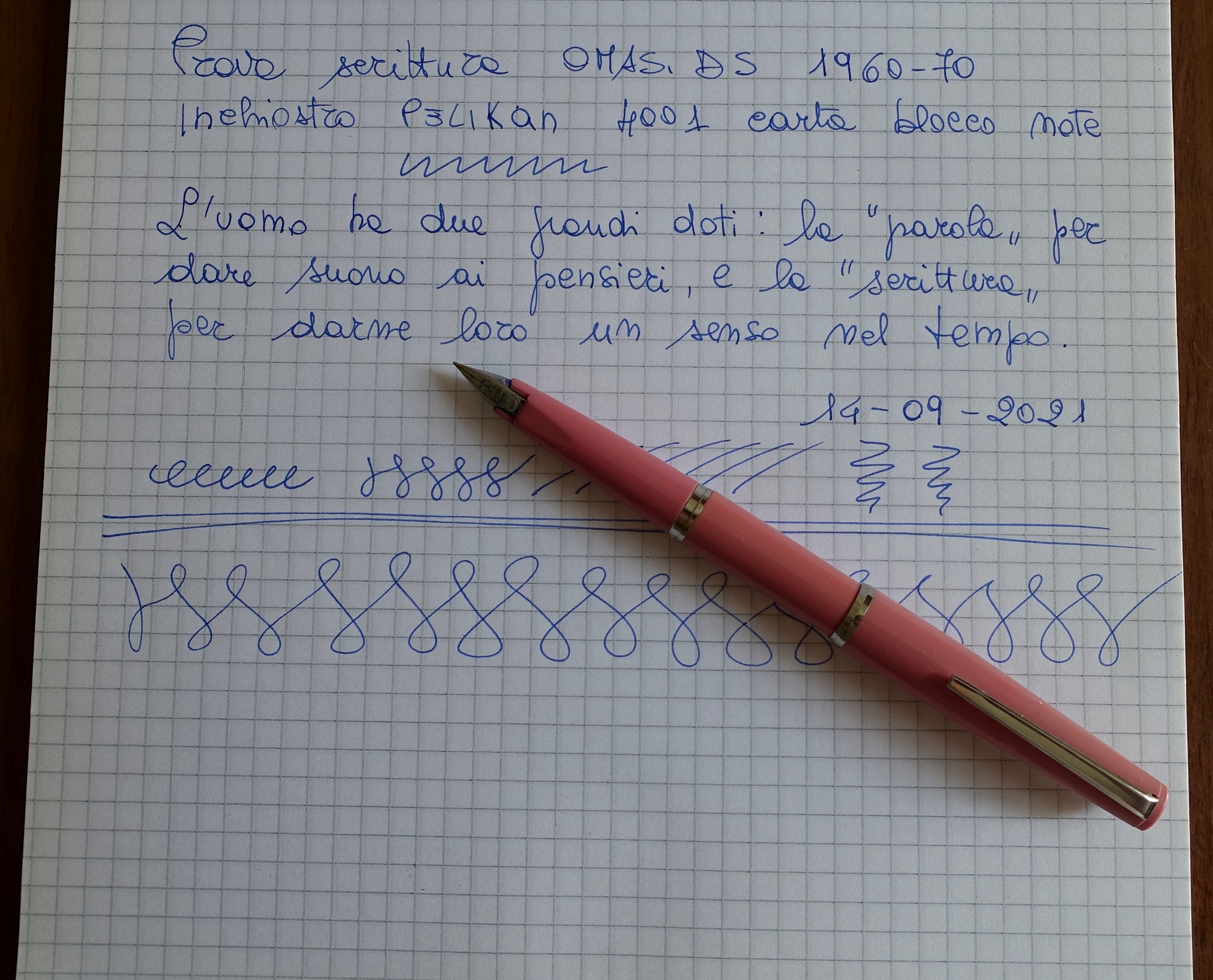 Devo dire che stimo moltissimo la sua concorrente Pelikano Antimacchia (la 465 credo), che ho usato per anni da ragazzo e sporadicamente anche ora, ma il pennino di questa Omas mi sembra un filo più scorrevole. A livello di scrittura, quindi, promossa a pieni voti. Per il corpo, invece, la Pelikan vince a mani basse.