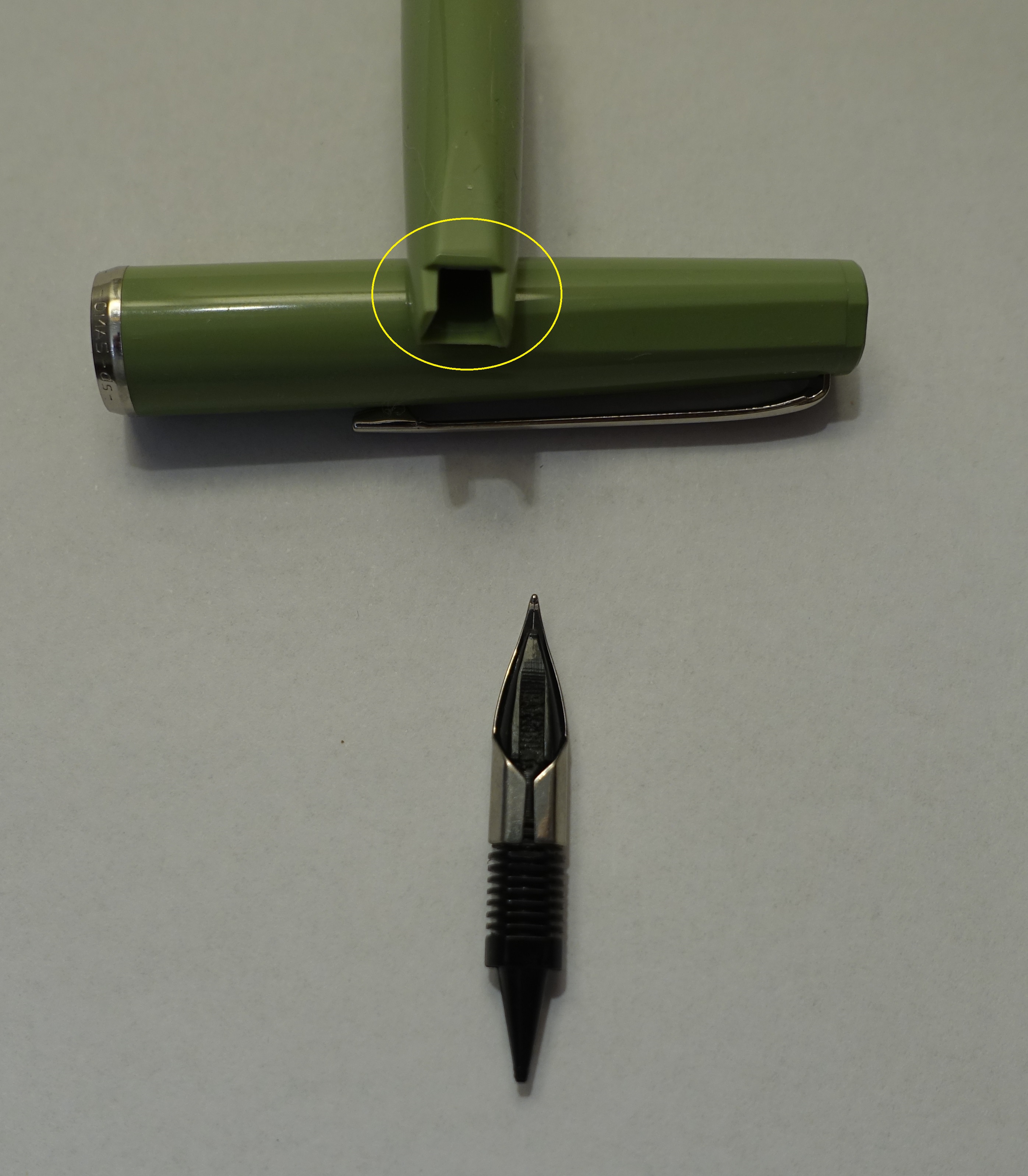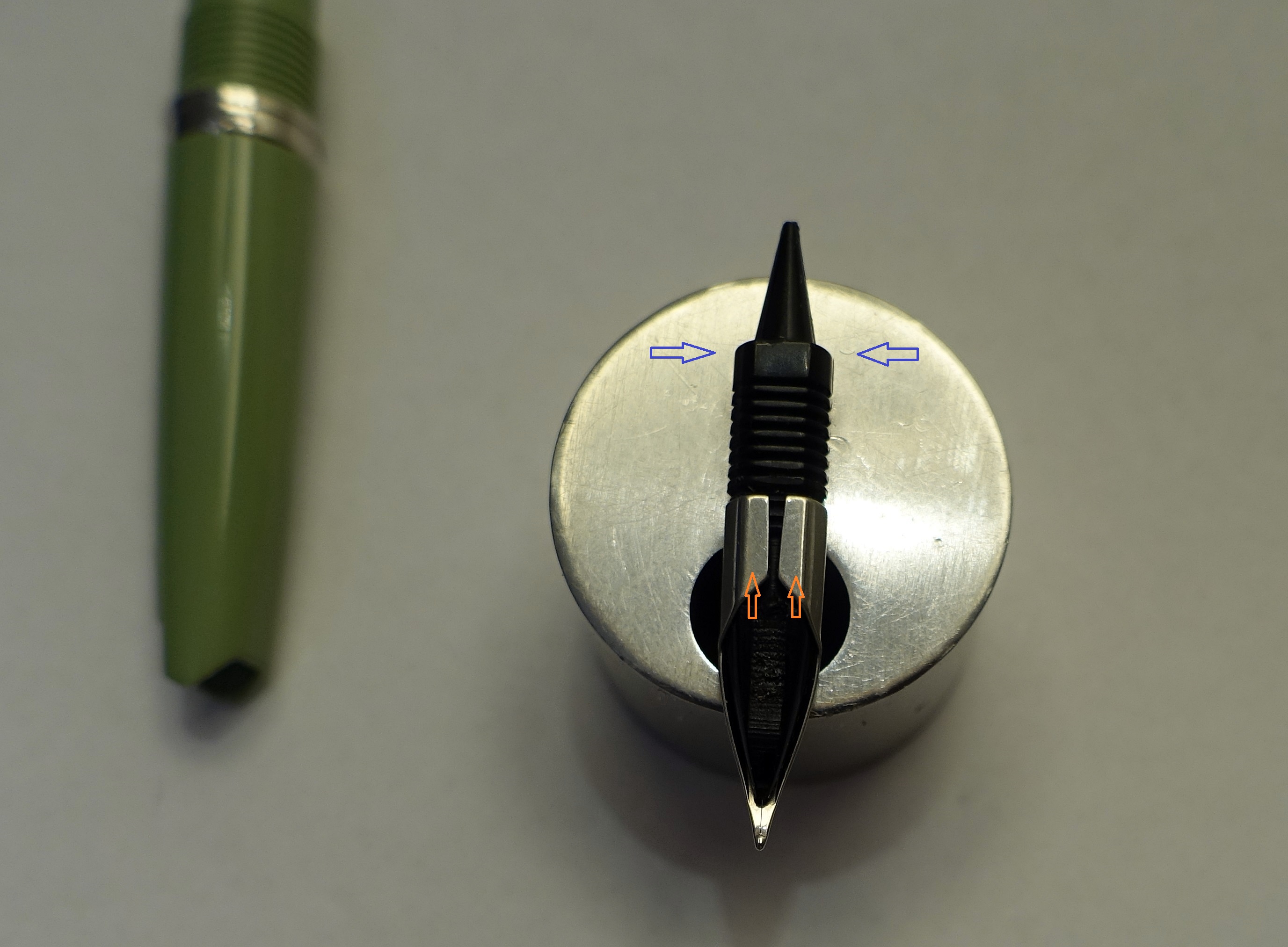 Premesso che le mie penne per ora non hanno questo problema, per estrarre collettore e pennino devo tirare con forza, nel caso capitasse, credo che alzando minimamente le alette del lato inferiore del pennino si possa ripristinare la frizione che serve per bloccarlo.