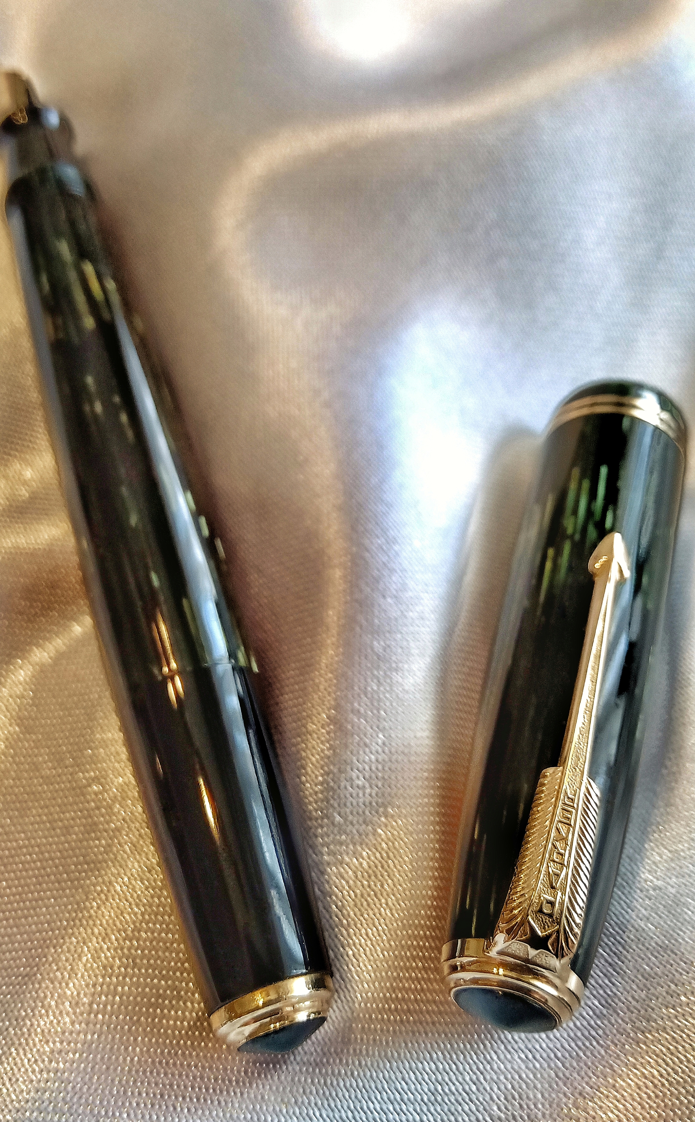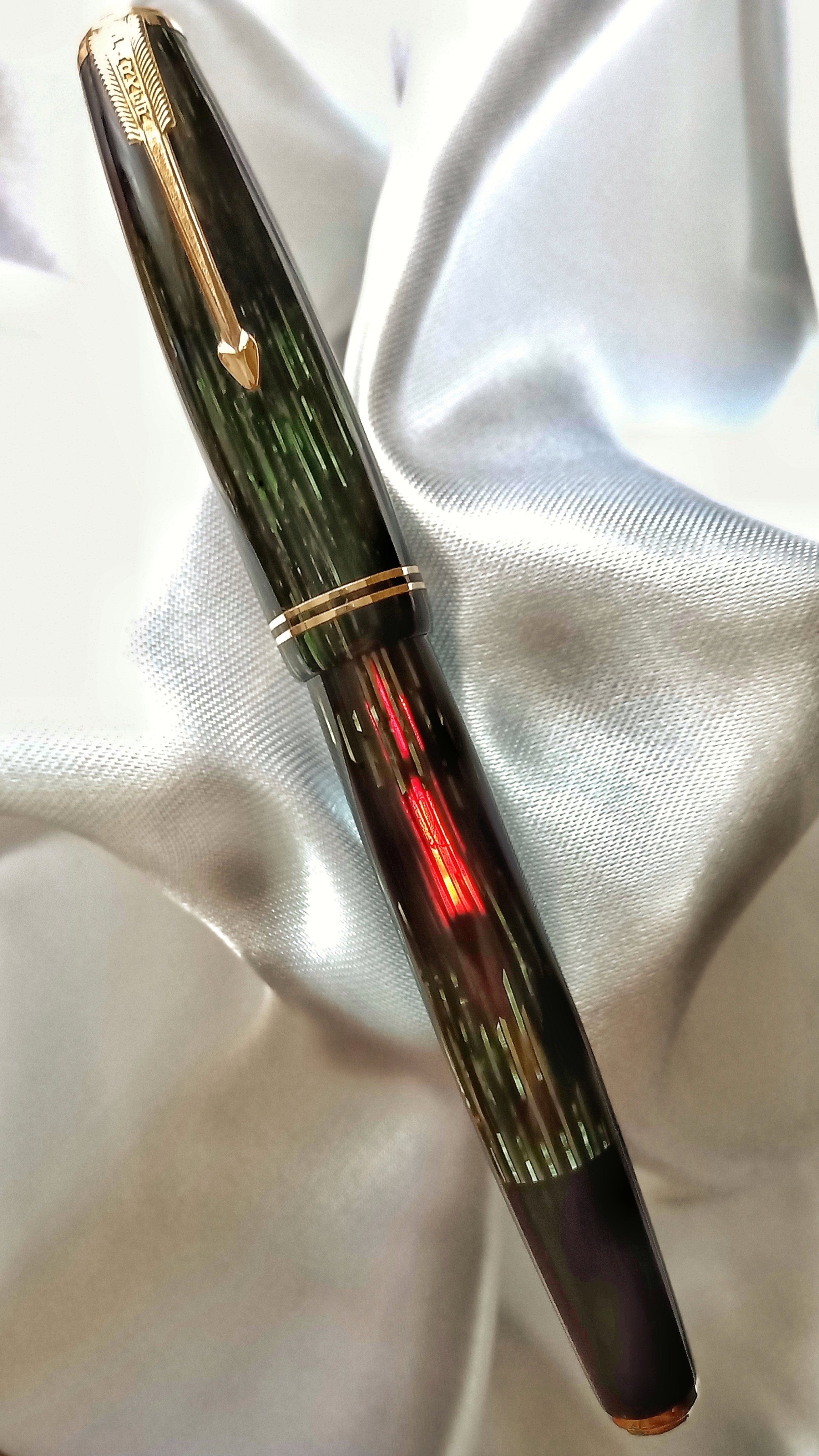 La celluloide del corpo e del cappuccio è del tipo laminato con righe perlate in verde (il mio colore preferito... :thumbup: !!!) e nel caso del fusto è traslucida per permettere di osservare il livello dell'inchiostro... A penna doppia gioiello, dove Parker tramite il suo diaframma (camera d'aria a scomparsa per me) riesce a sfruttare al meglio il volume del corpo per la riserva d'inchiostro...