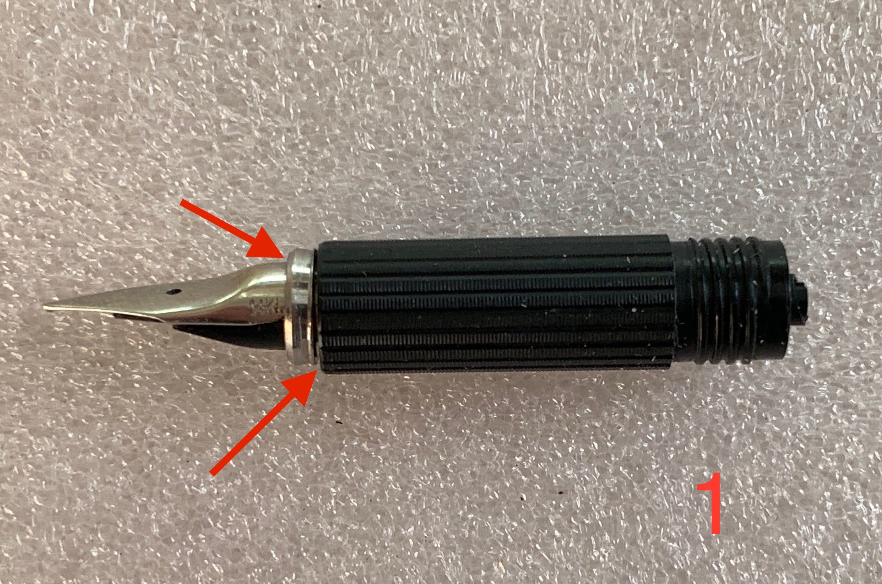 Alla fine funzionava ma presto ha cominciato a trafilare inchiostro in maniera piuttosto consistente, sia fra la sezione e la ghiera di metallo, sia fra la ghiera e il pennino (punti indicati dalla freccia nella foto 1). Scusate se non uso tutti i termini giusti, ma sono proprio nuovo della materia.
