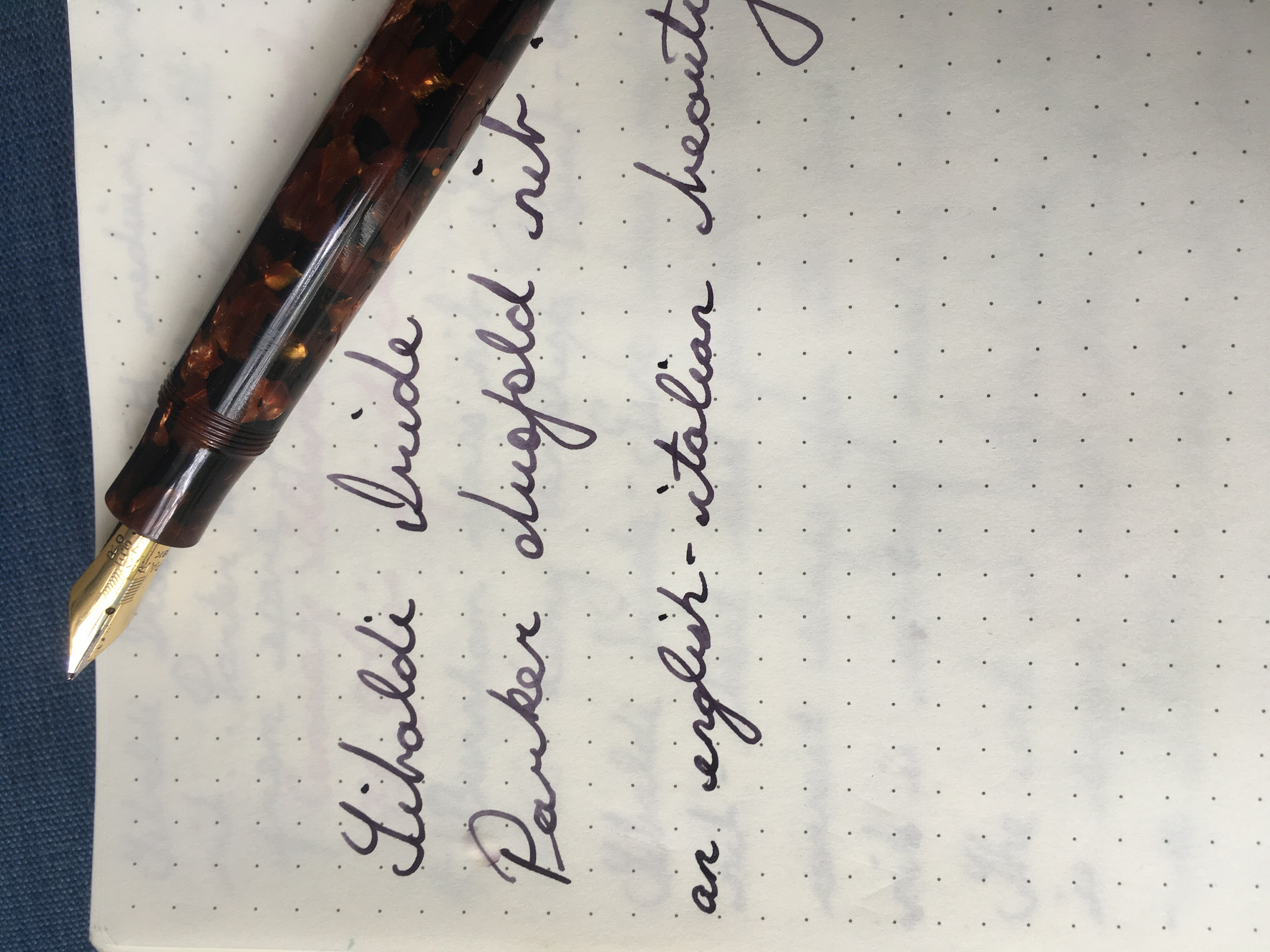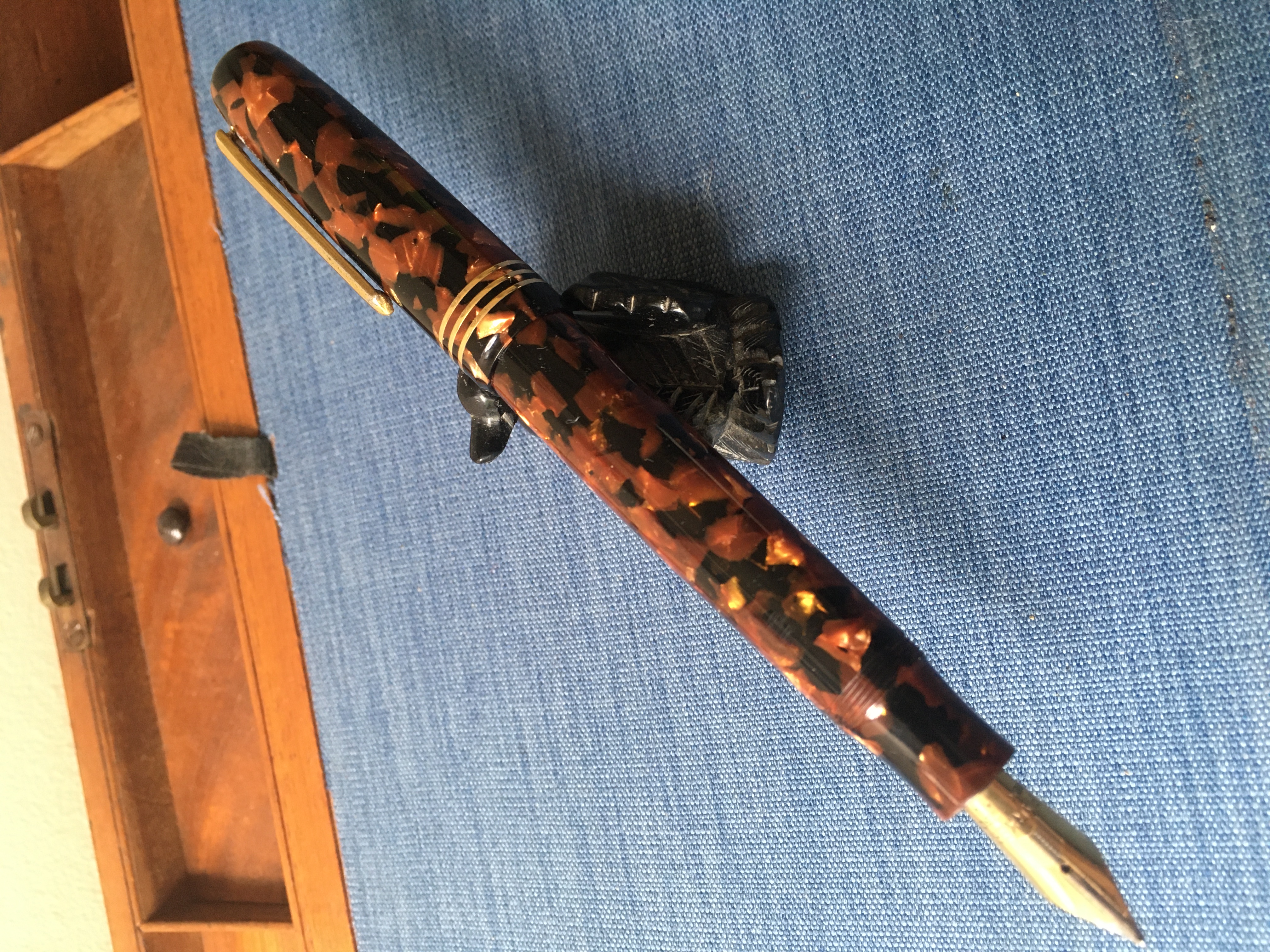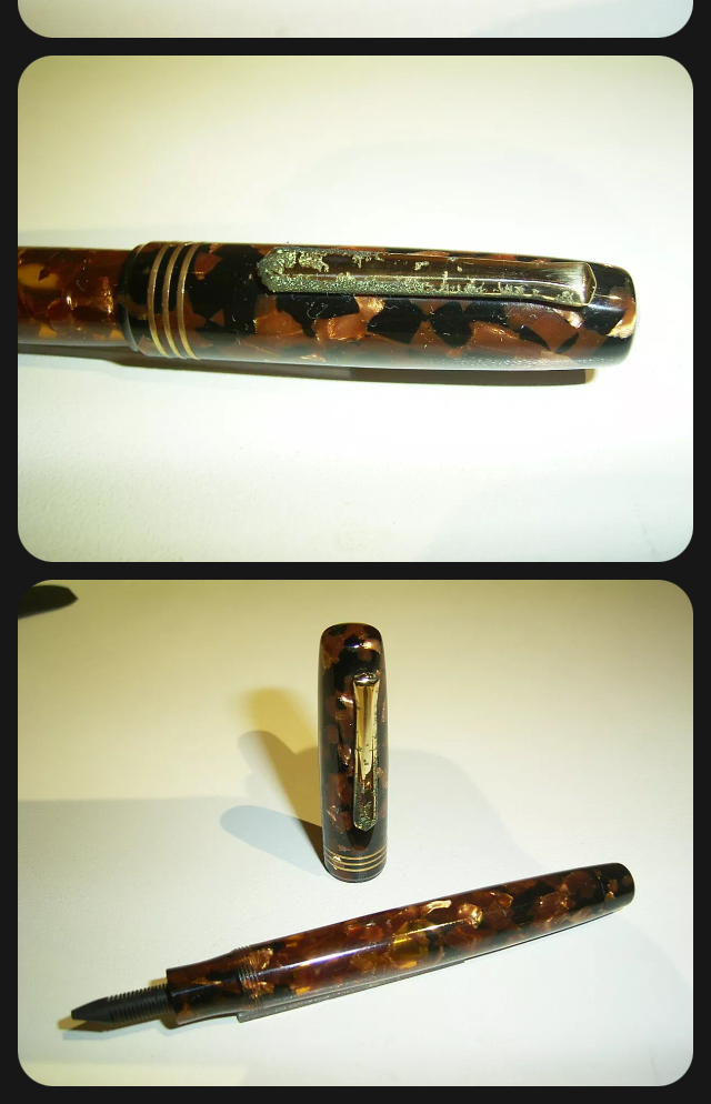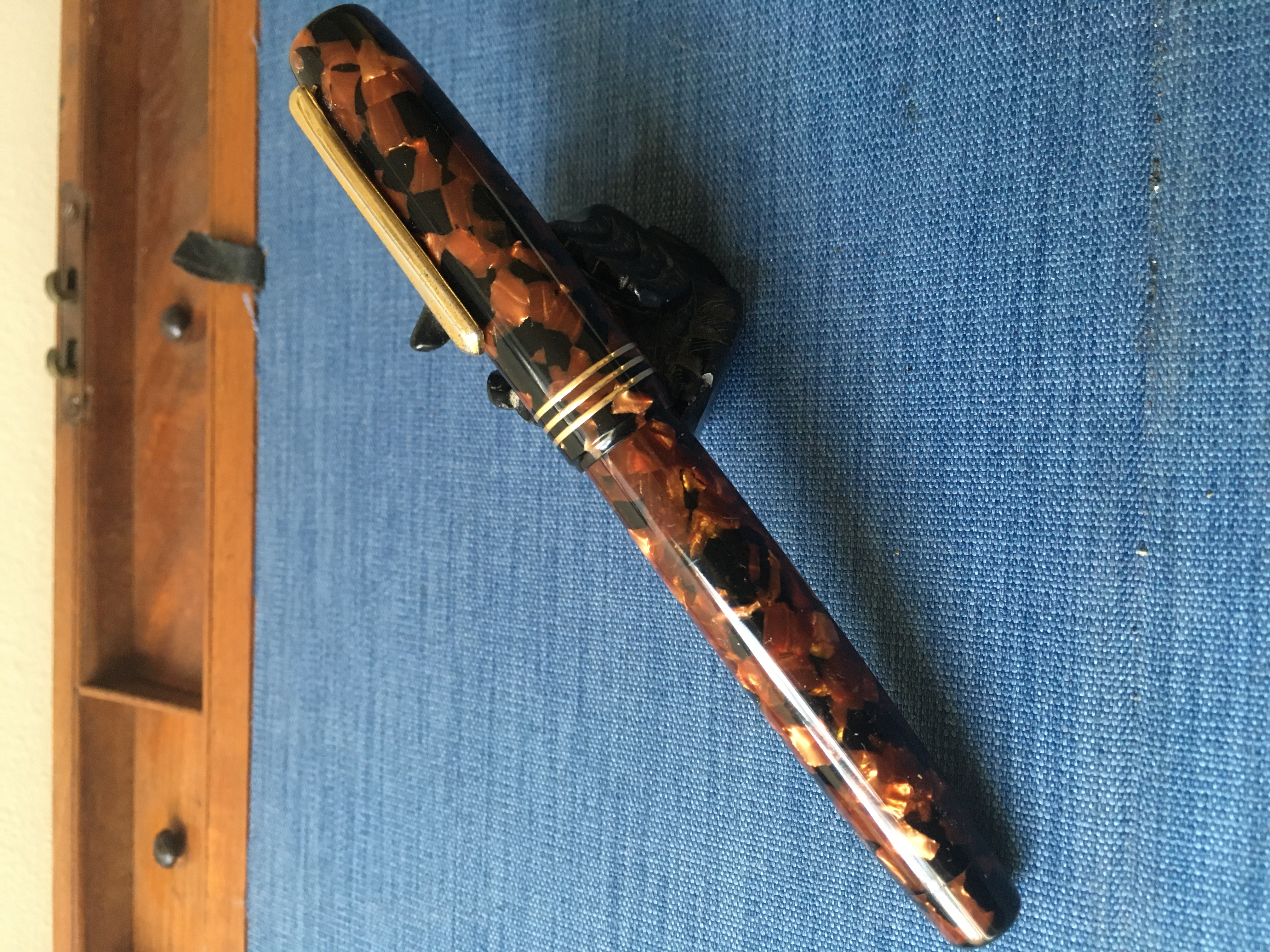 Ho sempre amato l'iride ma le opportunità di trovarne uno qui sono molto limitate. Questa è stata acquistata da un certo sito che tutti conosciamo, una delle ultime fatte non ha nessuna marcatura e nessun pennino, il metallo era abbastanza appannato. La celluloide è bella ma tutto il resto non è così buono. Comunque, ora ha un pennino nuovo, dato da una Parker Duofold International rotta e la clip è stata lucidata. Ora funziona perfettamente.