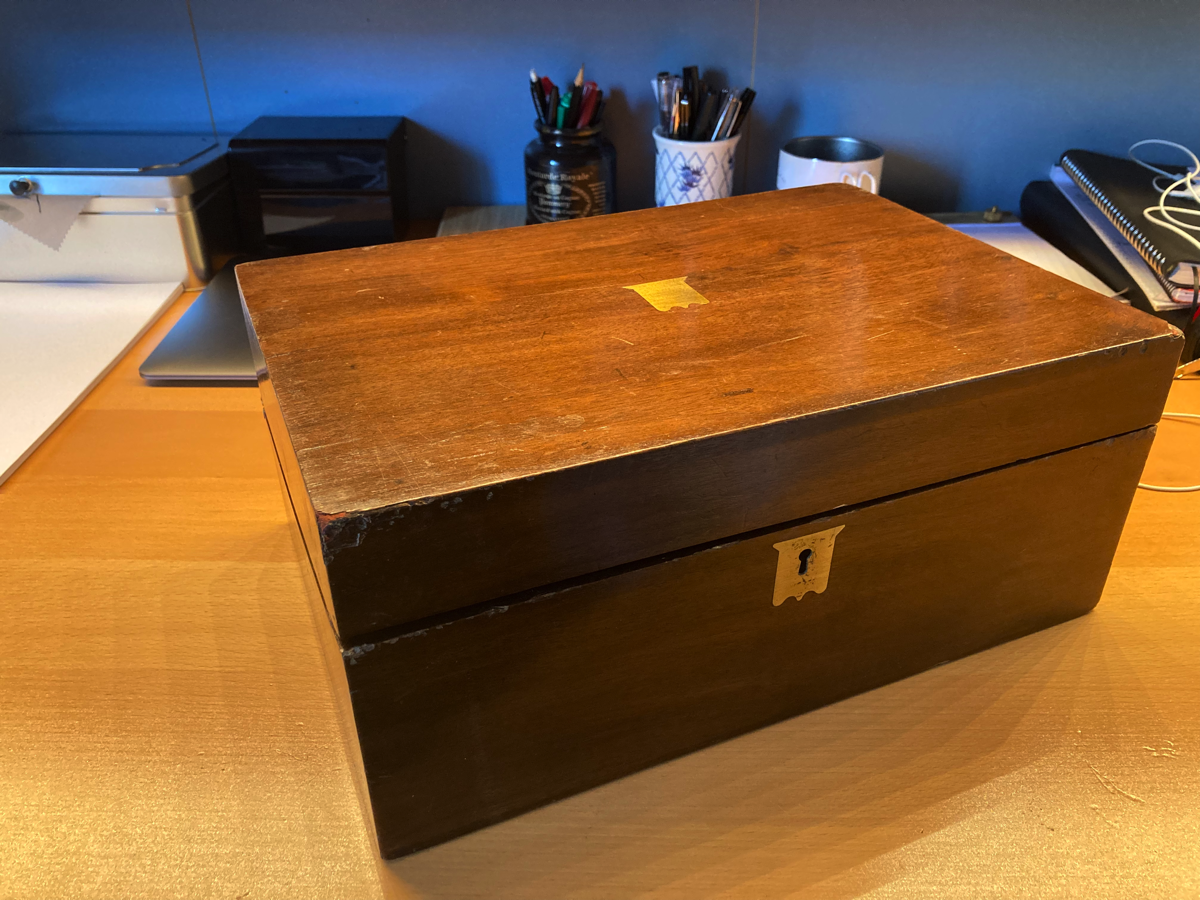 Uno scrittoio da viaggio… (c'è parecchio da fare.. va lucidato, cambiate alcune cerniere, incollata in alcuni punti la stoffa... Ma mi piace molto).