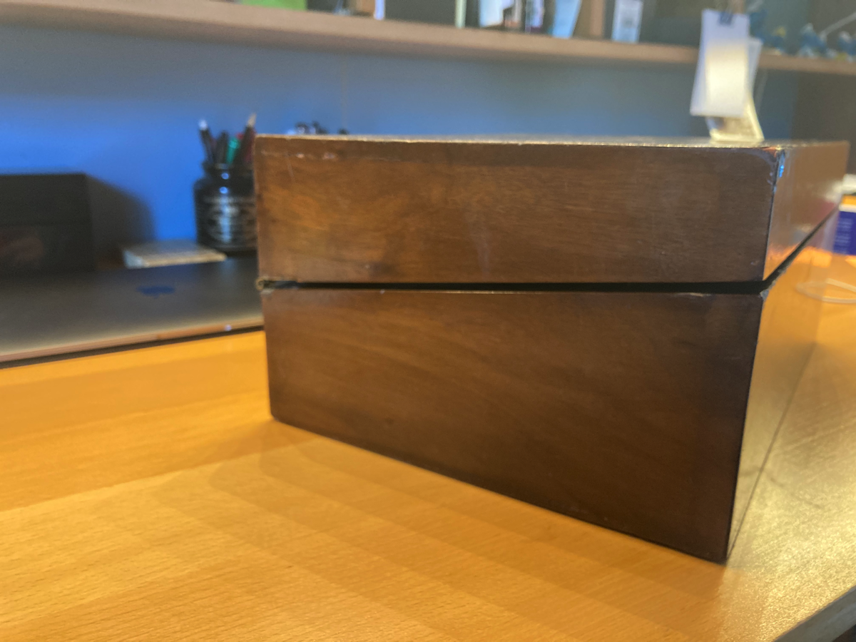 La vista sul lato evidenzia un primo difetto: chiude male, colpa anche della serratura bloccata (e senza chiave, ma a questo si ovvia facilmente): Il fronte è segnato da dei graffi... secondo me con un po' di cera e pazienza l'effetto si può mitigare.