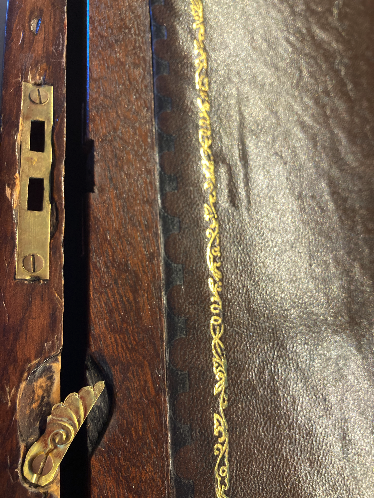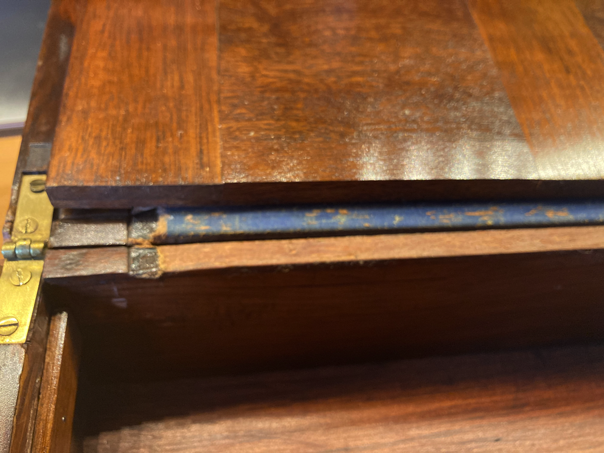 Le cerniere sono storte (e le viti non sono originali... ). Devo provare a rimetterle in ordine, oppure le cambio (vorrei evitare, ma così non si può tenere. Si vede inoltre che i pannelli del piano di scrittura, tenuti assieme dalla pelle, non sono allineati, proprio perché la pelle si è staccata dal telaio del coperchio: Il gancio del piano di scrittura è stato cambiato, e la sua sede rovinata... Peccato. Non saprò mai come era in originale, quindi non so come intervenire per cambiarlo filologicamente...