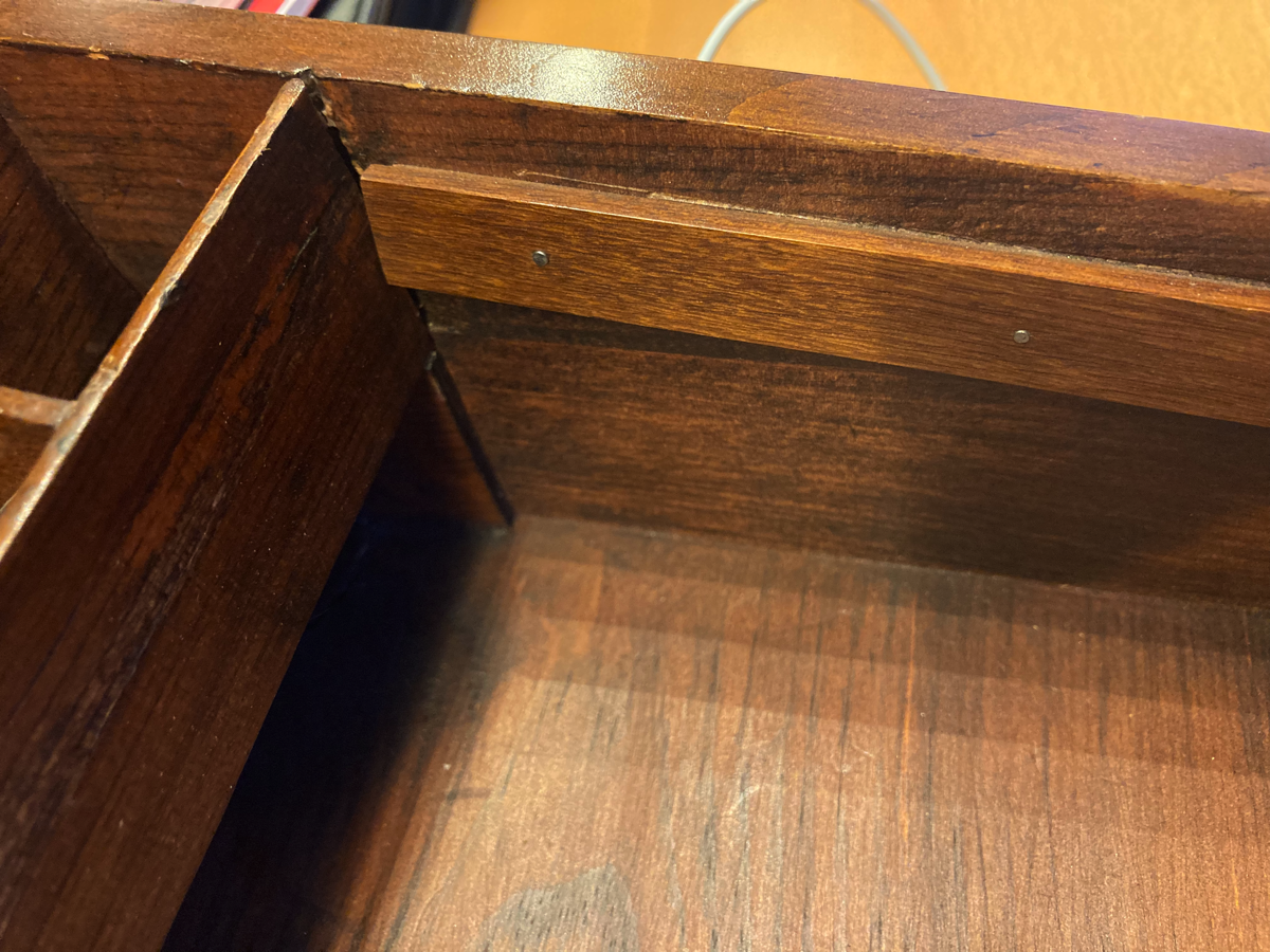 Il vero problema è dentro: i fermi del piano di scrittura sono stati aggiunti a posteriori, sono simili ma non identici (e i chiodi non hanno nulla che fare con il resto della minuteria)