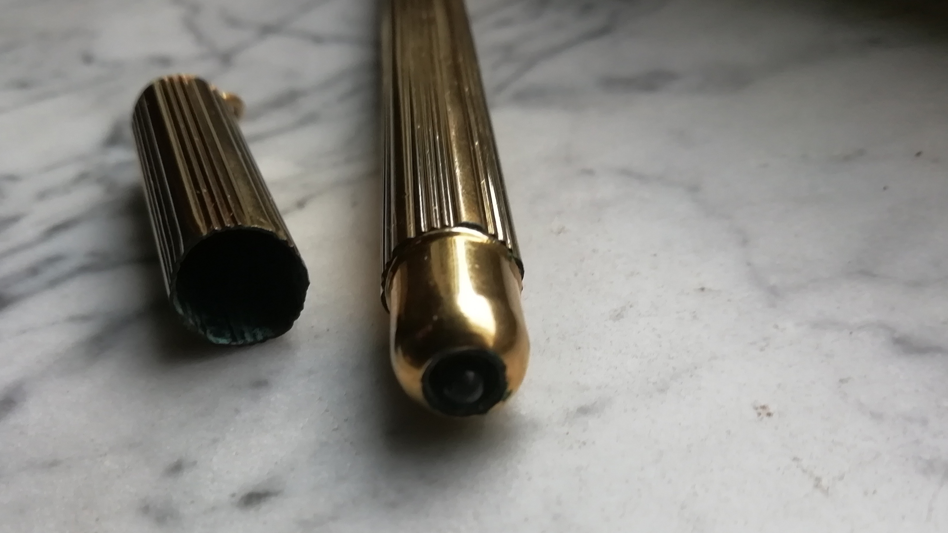 Per quanto riguarda il tuo, credo che abbia che ci sia da rivedere qualcosa: in primo luogo credo vada ripristinata la saldatura che rende solidale parte del meccanismo interno con il cilindretto dorato. Mi ha sorpreso molto che tu sia riuscita a separare il tutto: generalmente una delle estremita è fissata molto tenacemente al corpo della penna/matita. :think: