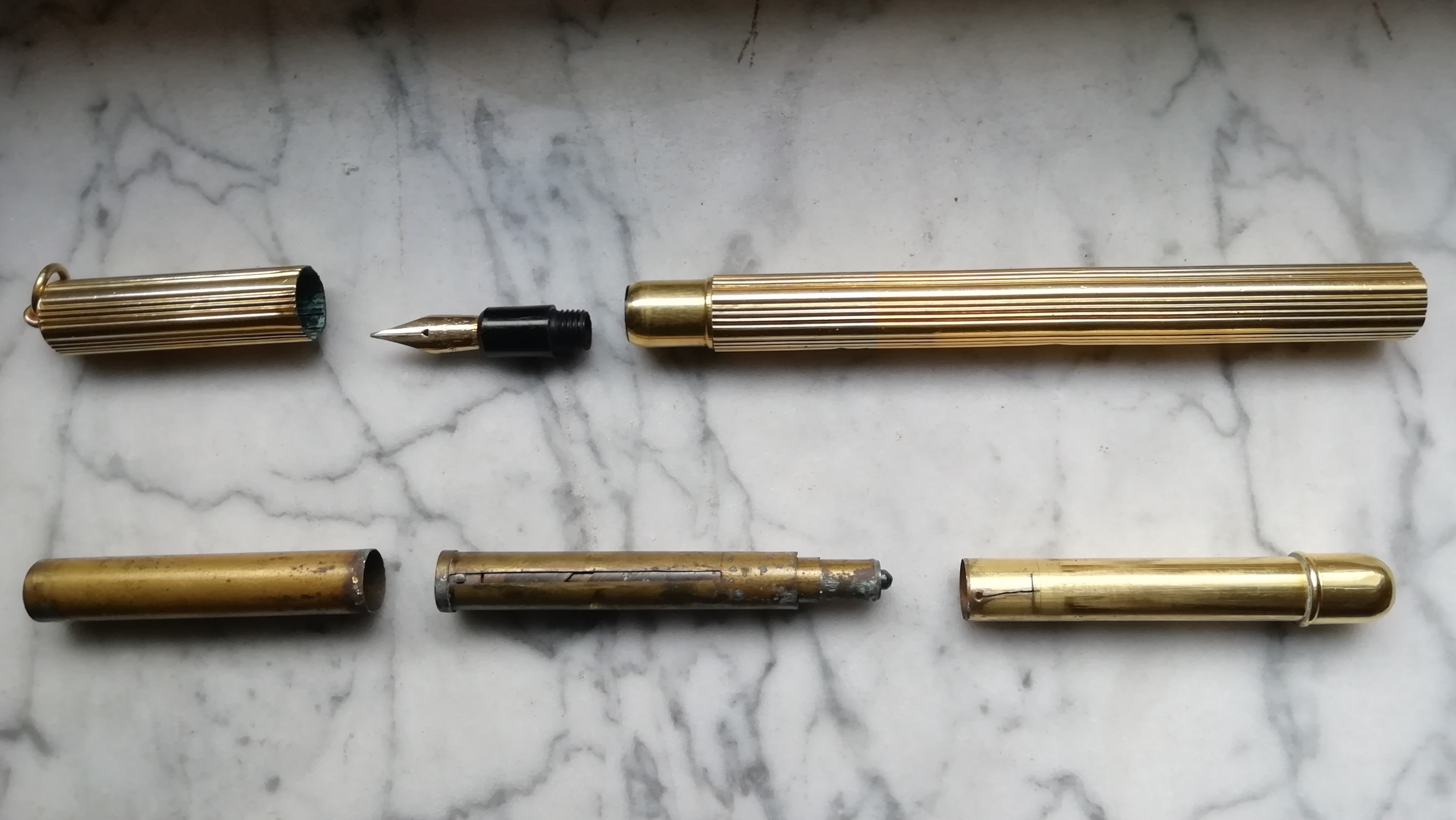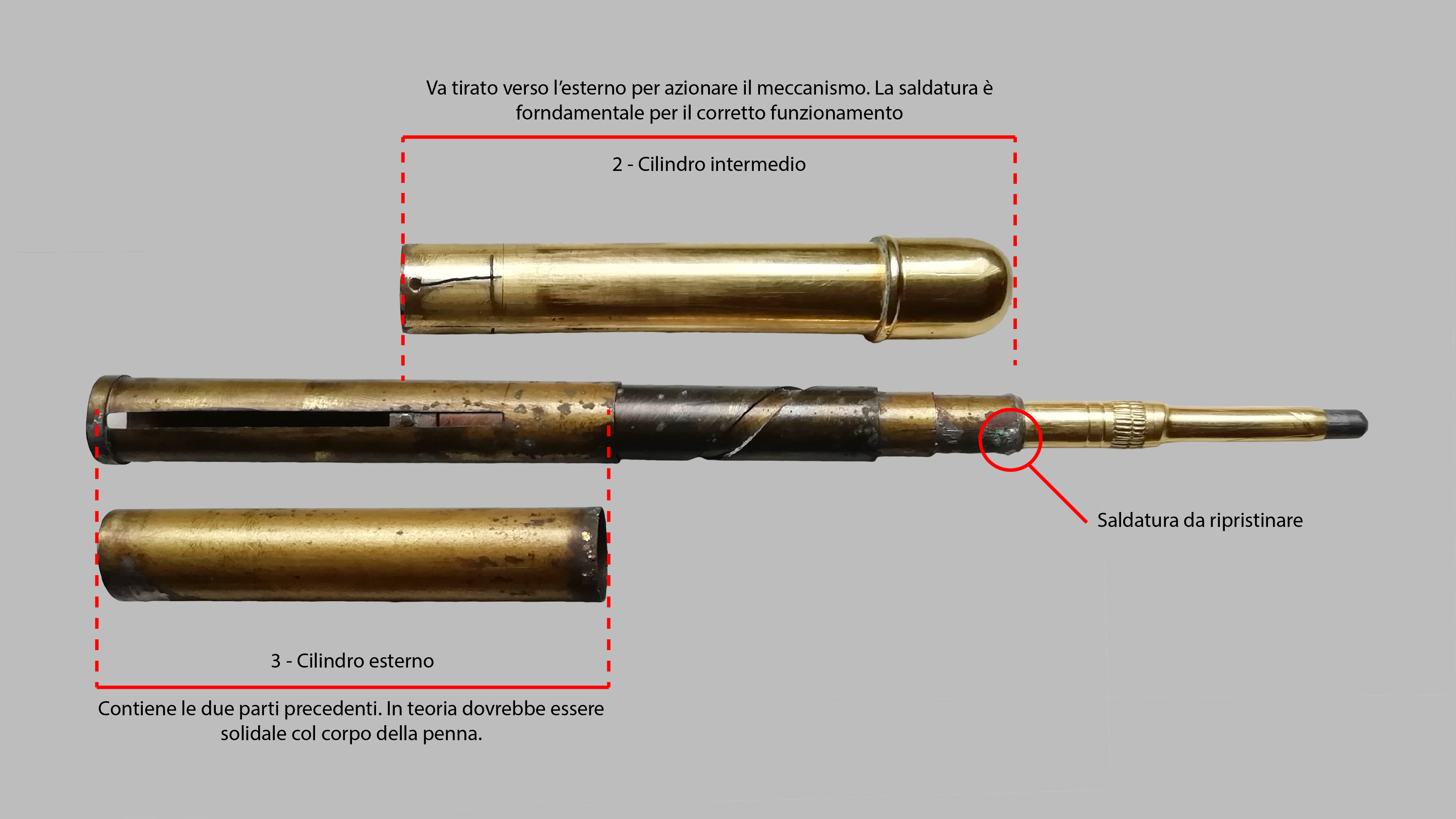 Quello che non sono riuscita a capire è come comporre tra di loro le tre parti, cioè il meccanismo telescopico, il tubo di ottone e il bussolotto forato (quello che funge da fondello alla penna).