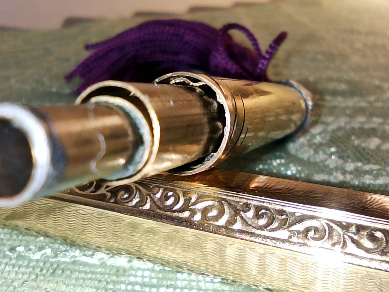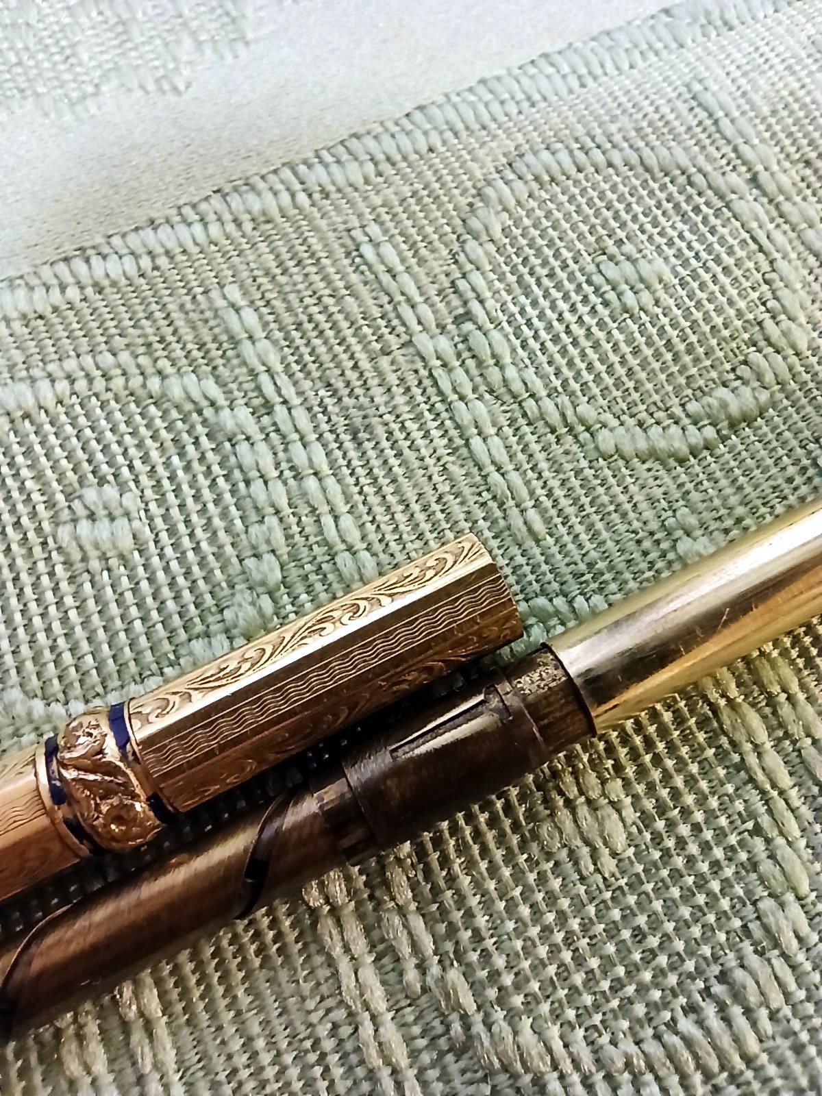 È un contagocce in combo con un portamine telescopico, laminato, probabilmente placcato oro, senza alcuna traccia di sorta di marchi o punzoni.