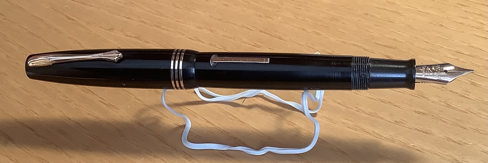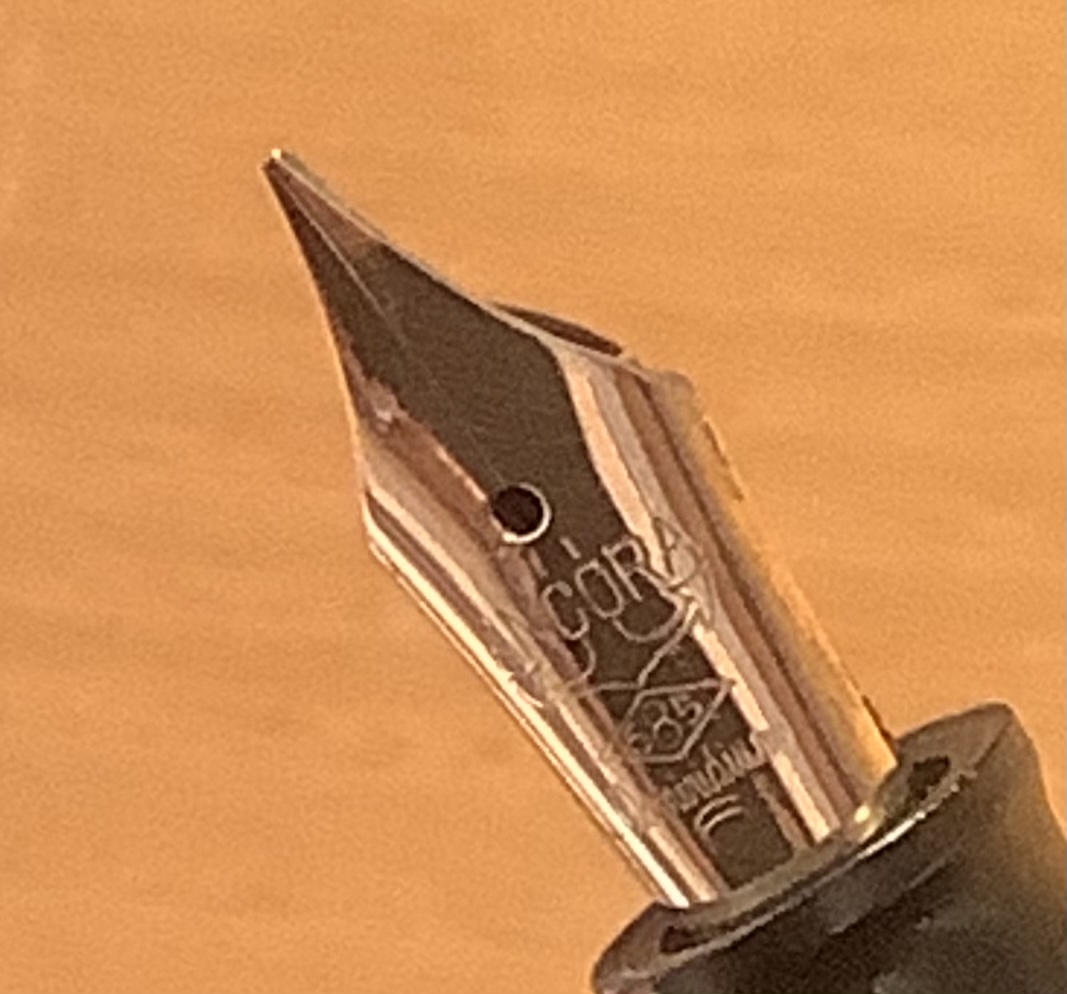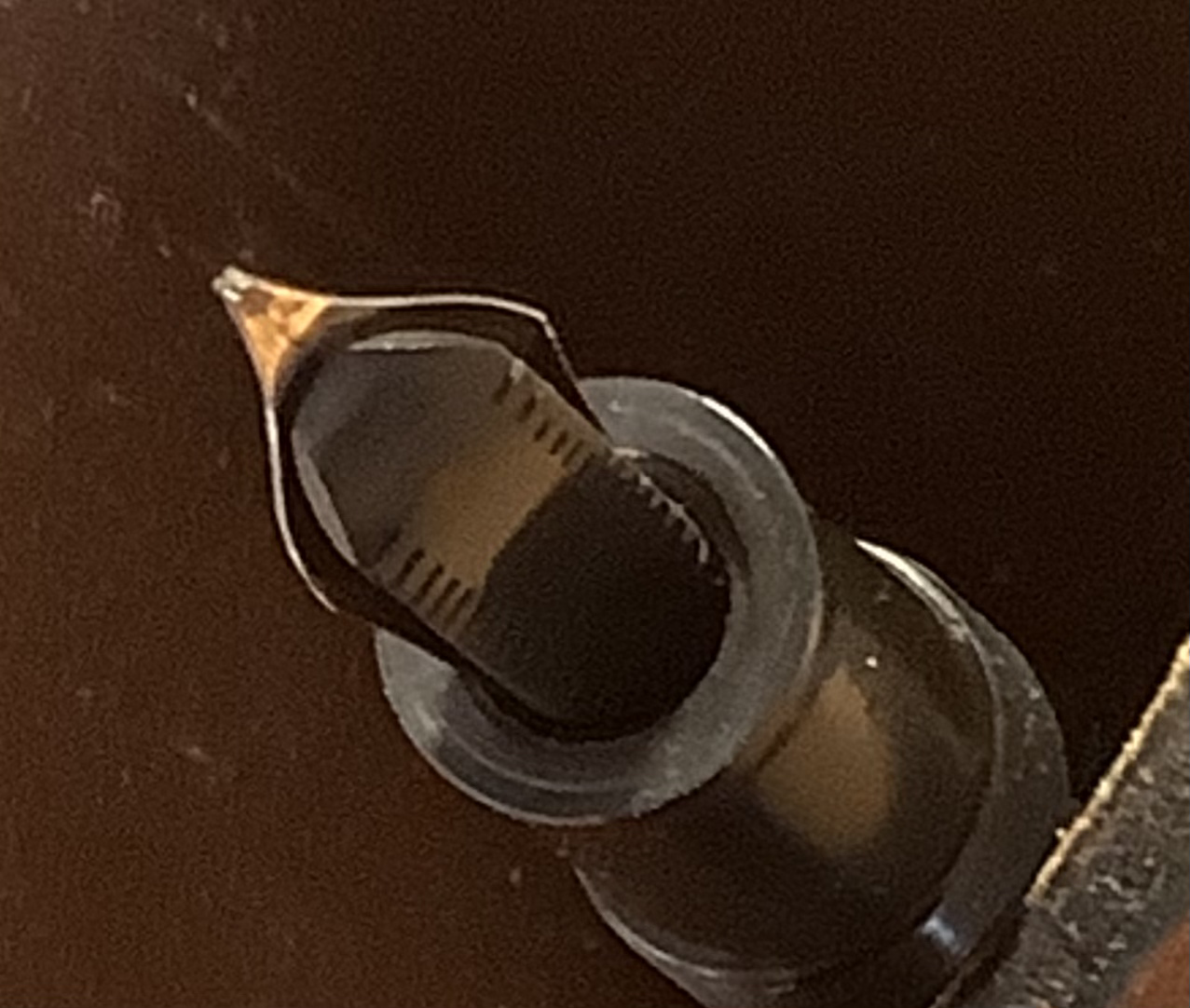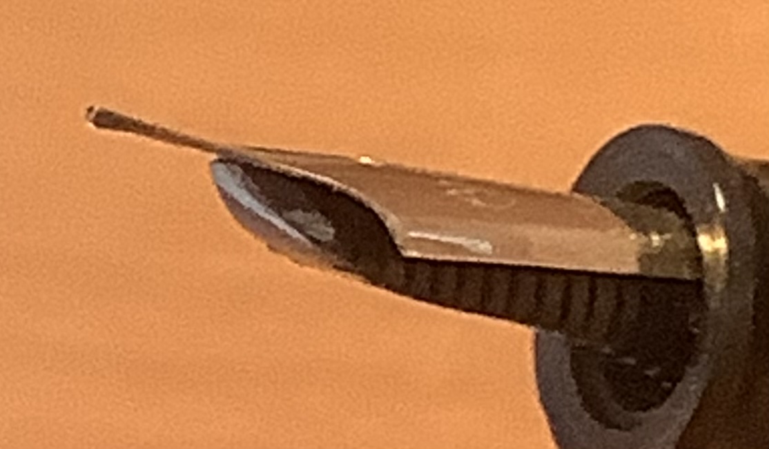 Secondo voi, da quello che si riesce a vedere e a parte il disallineamento delle punte, questo pennino è consumato, gli manca la sferetta o è nato così: tagliato o broad o simili. È moooolto flessibile, e scrive con tratto largo ovviamente ma senza grattare. Grazie!