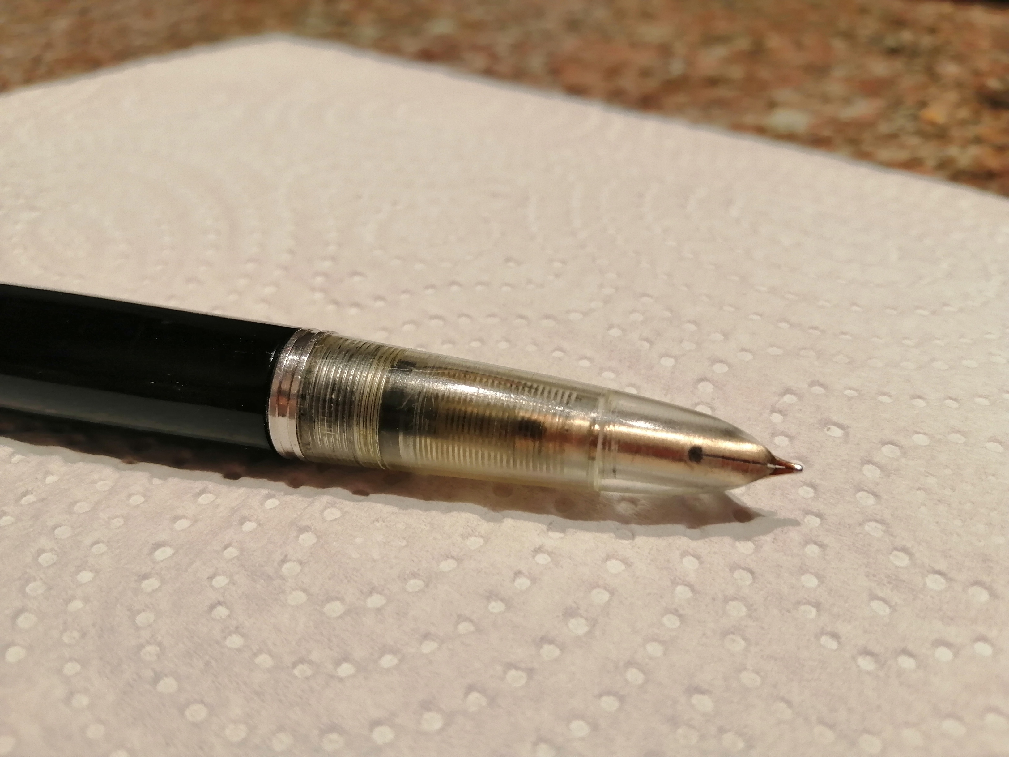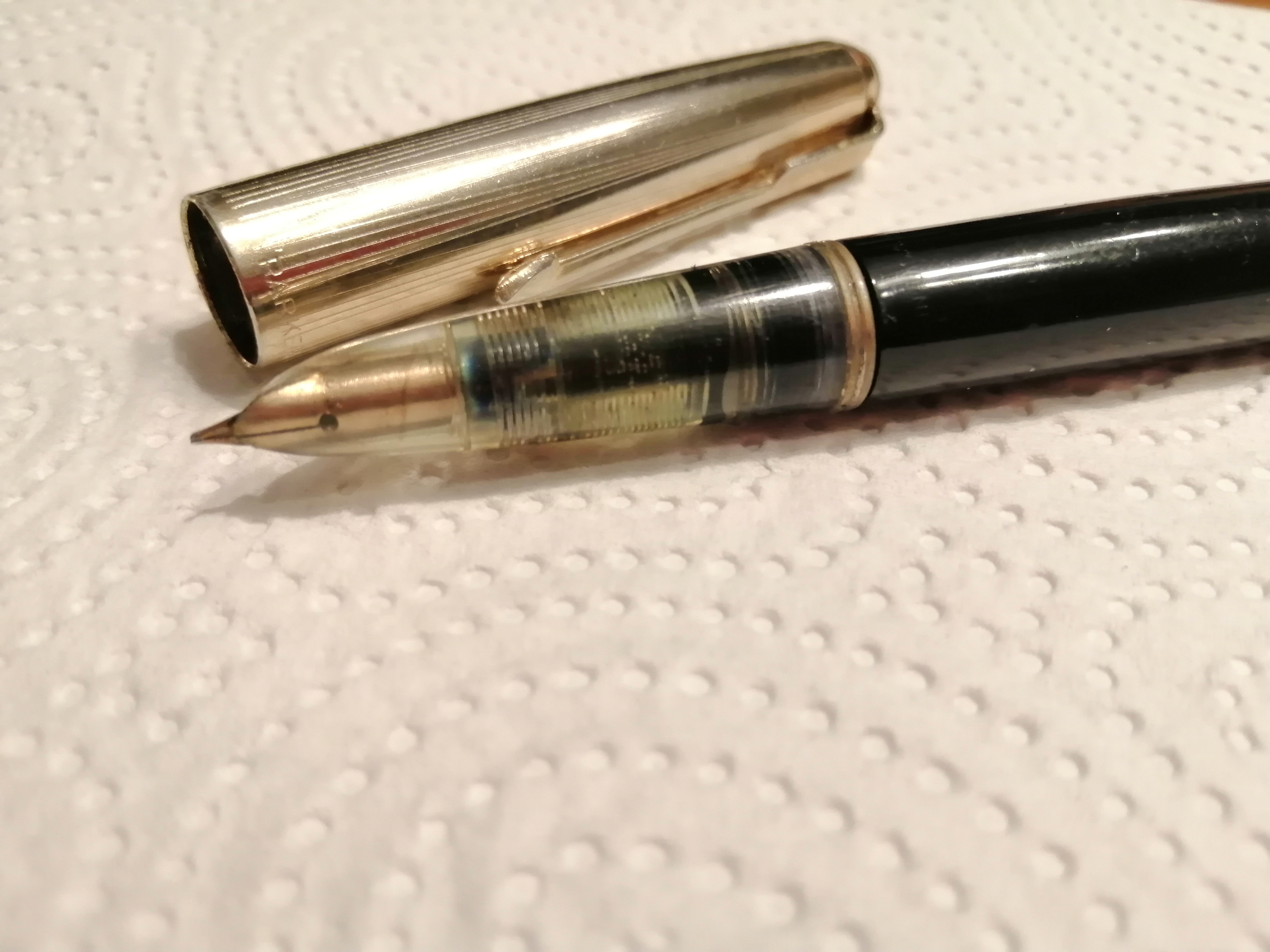 Comunque sia, ho deciso che appena ripulita la rimonterò così com'è con il suo hood trasparente, e mi godrò la visione del famoso e sofisticatissimo accumulatore Parker che cambiò la storia della stilografia mondiale