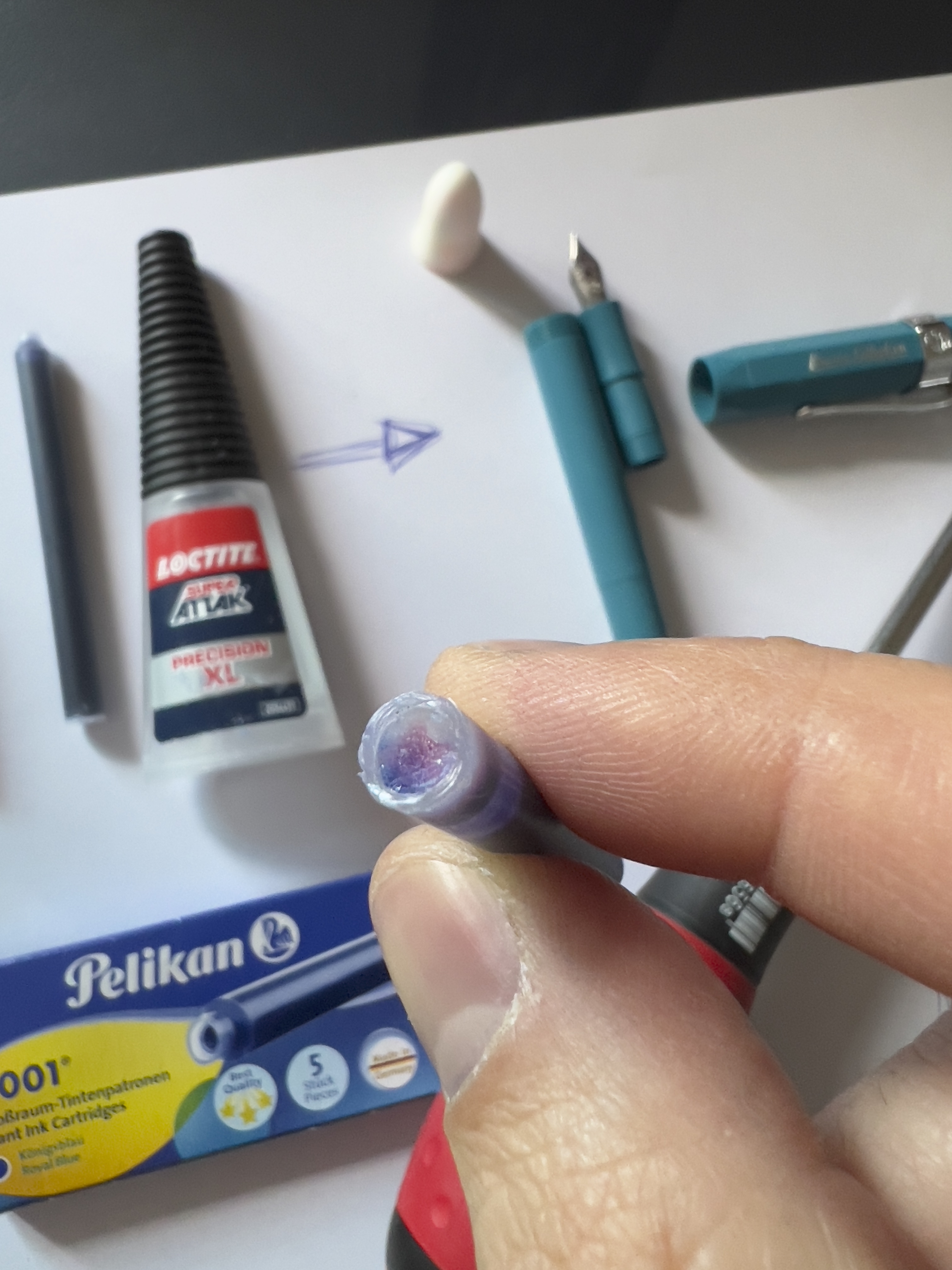 Il lavoro da fare, a dispetto di quanto necessario non è molto. Innanzitutto prendiamo la cartuccia Pelikan 4001 giant e svuotiamola. Poi tagliamola col coltellino svizzero (perché non la forbice? Perché il coltellino ben affilato non crea alcuna deformazione della plastica, la forbice sì): ho trovato dopo una serie di prove e riprove la misura più lunga possibile: 5,8cm. A questo punto, prendiamo il tappo di schiuma per le orecchie e tagliamone un piccolo quadratino, leggermente più grande del diametro del posteriore della cartuccia Pelikan e infiliamolo dentro. Attendiamo che si espanda tutto facendo attenzione a lasciare un piccolo spazio tra la sua massima espansione e la fine della cartuccia. A questo punto possiamo mettere la super attack, osservando bene che copra tutto lo spazio in modo da creare un vero e proprio tappo (non usate altre plastiche per tappare la cartuccia, non reggono. Ho provato tantissime soluzioni).