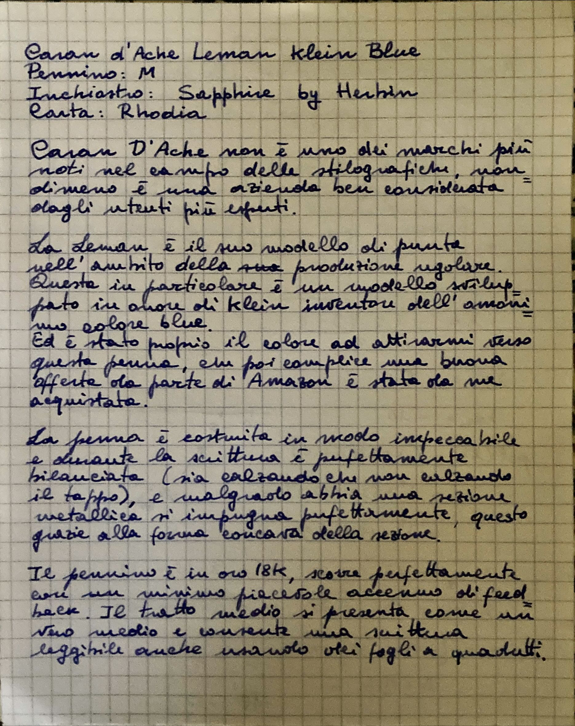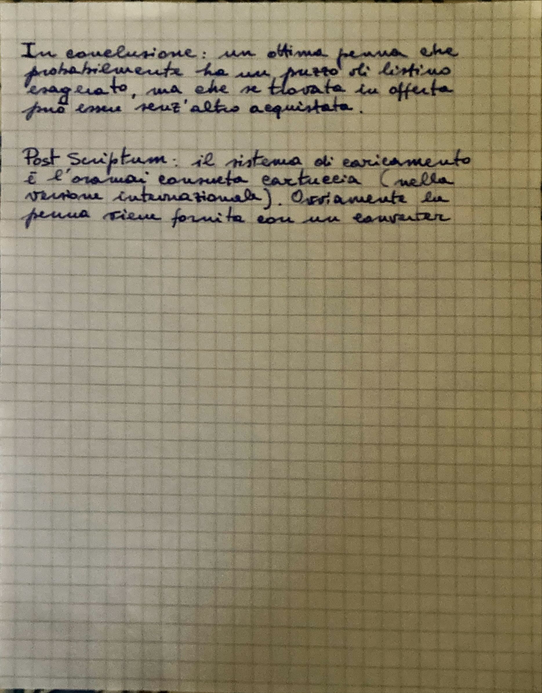 Complimenti per l’ottimo acquisito. Ho tre Léman (due roller e una stilografica, versione “Léman de nuit” con pennino M). Qualità di scrittura e costruzione ottime. Unico difetto: soggettivamente, ritengo che la penna sia un po’ corta.