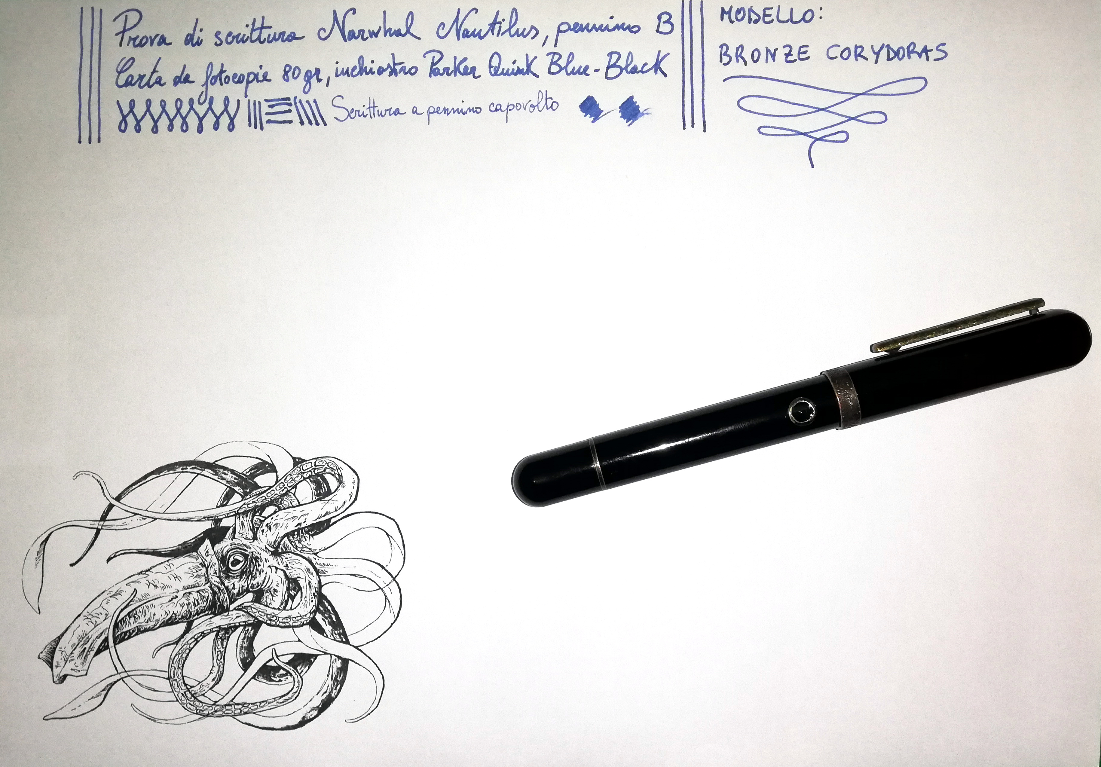 - Il design un po’ particolare di questa penna, che con gli “oblò” per il livello dell’inchiostro ricorda un po’ un sottomarino, ha inizialmente attratto la mia attenzione ed alla fine, complici anche i giudizi positivi letti in giro sulle penne di questo produttore, mi sono deciso ad acquistarla. La chiusura del tappo è a vite, e richiede ben 2 giri per essere svitato, pertanto immagino riesca a garantire una buona tenuta da gocciolamenti e/o passaggio d’aria. Il corpo della penna è cilindrico, nero lucido con finiture color bronzo accanto al meccanismo del pistone, intorno ai 3 oblò ed alla base del tappo, dove tra ghirigori marinareschi si trova scritto NARWHAL per due volte. Sulla parte alta del tappo è presente un inserto in bronzo circolare ed anche la clip è dello stesso colore.