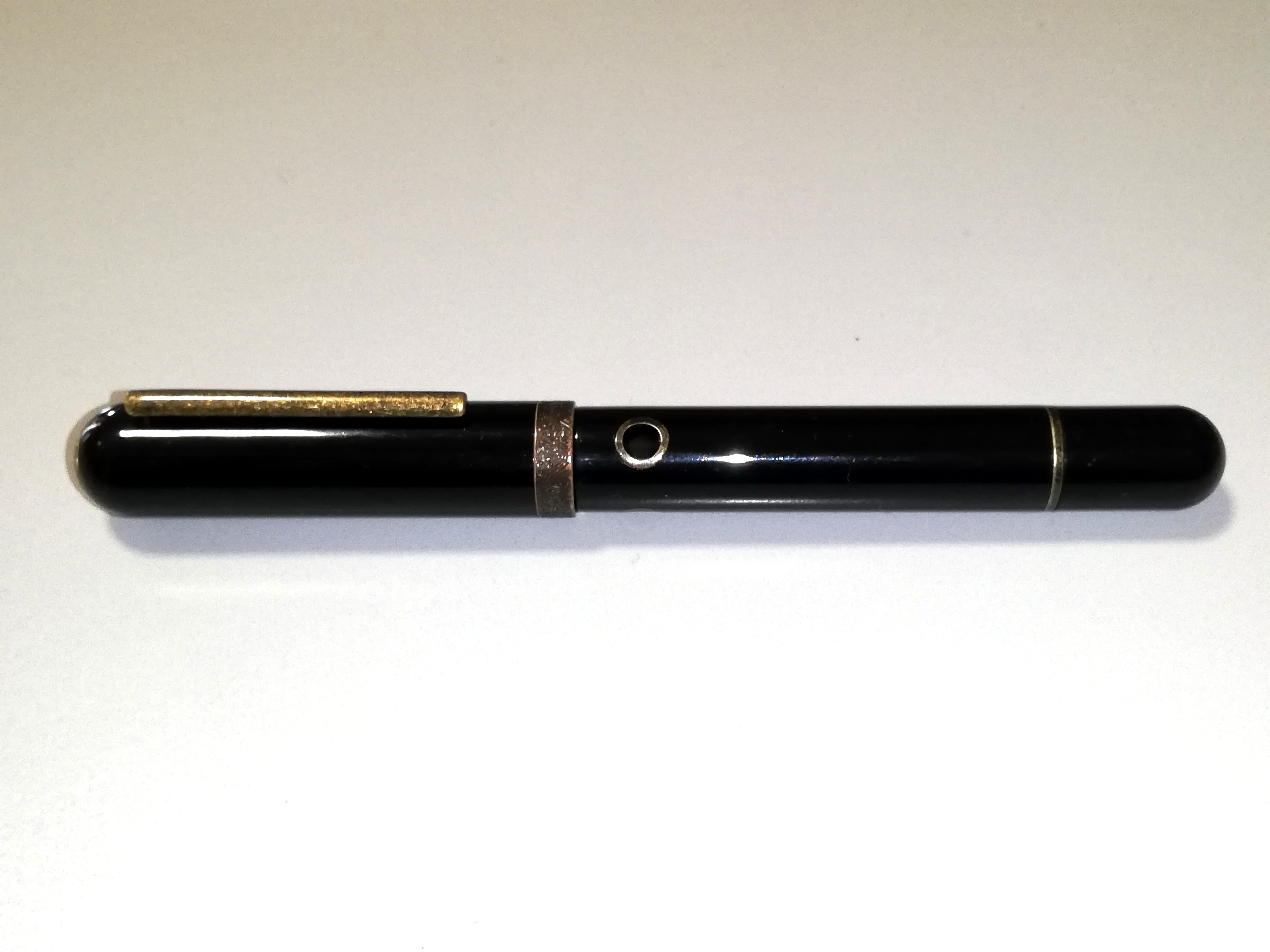 - La penna è realizzata in ebanite, e mi è sembrata piuttosto leggera. Non presenta sbavature né segni di stampo e gli inserti in bronzo sono ben definiti, con colore uniforme su tutta la penna. Incluso il tappo è lunga 14.9 cm, che diventano 13.2 cm quando il tappo è svitato, e larghezza costante pari ad 1.4 cm. La penna pesa 34,2 g (il solo tappo pesa 13 g) e dovrebbe contenere intorno ad un ml di inchiostro (carica pesa 35g esatti). L’estremità alta è arrotondata ed il tappo non può essere calzato.