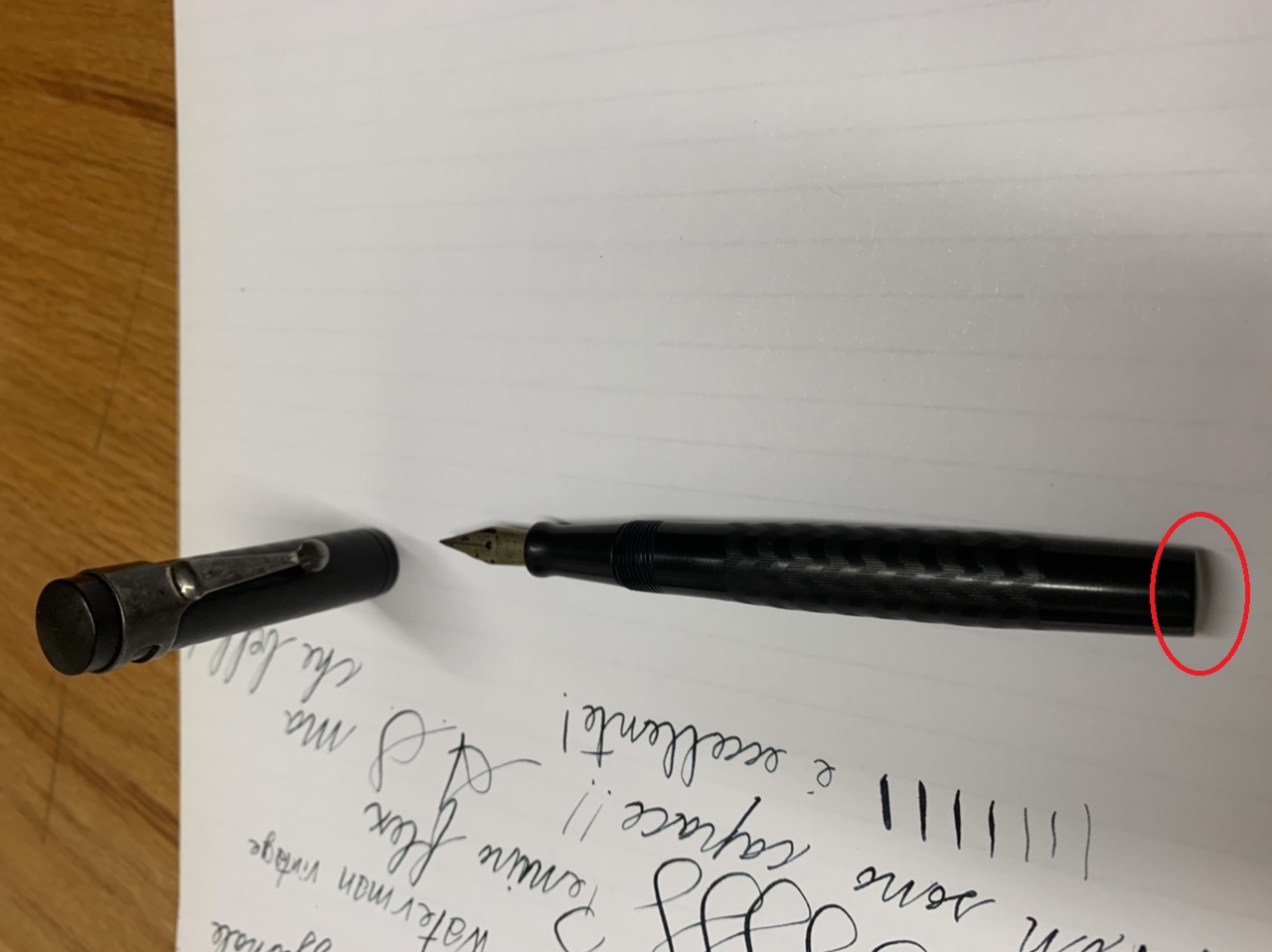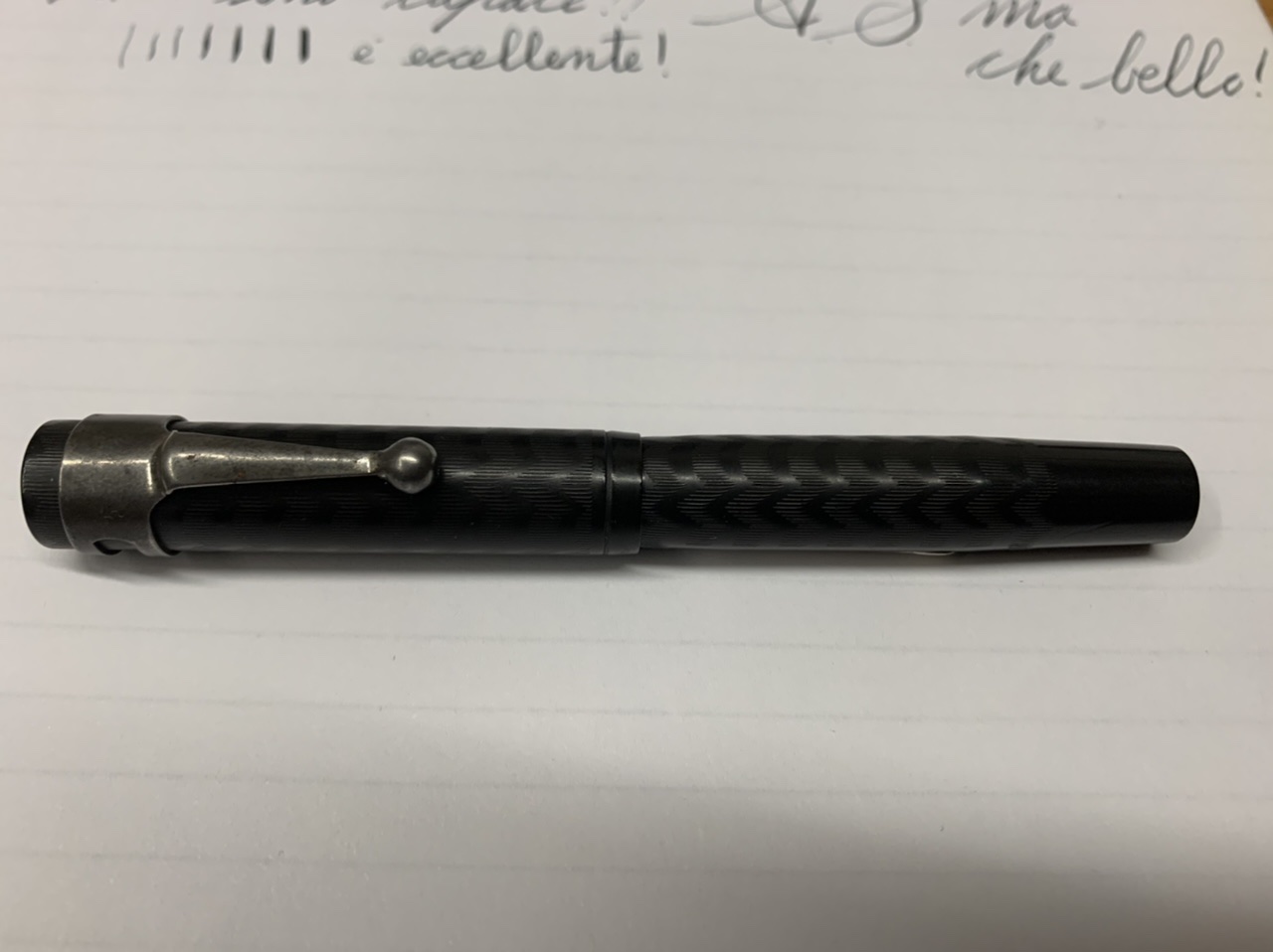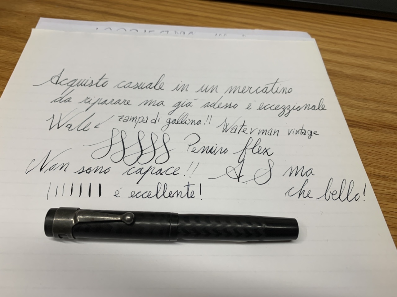 Il pennino mi sembra ben messo, dopo aver fatto un bel bagno di sola acqua alla sezione (che ha spurgato inchiostro blu) ho asciugato è fatto una prova di sola intinzione. Scrive e anche bene, oddio, LEI scrive benissimo, io ho una zampa da tirannosauro… è veramente flessibile il pennino! Molto più difficile da governare rispetto ad una stilografica moderna, ma se riesci a fare una lettera decente esce uno spettacolo!!