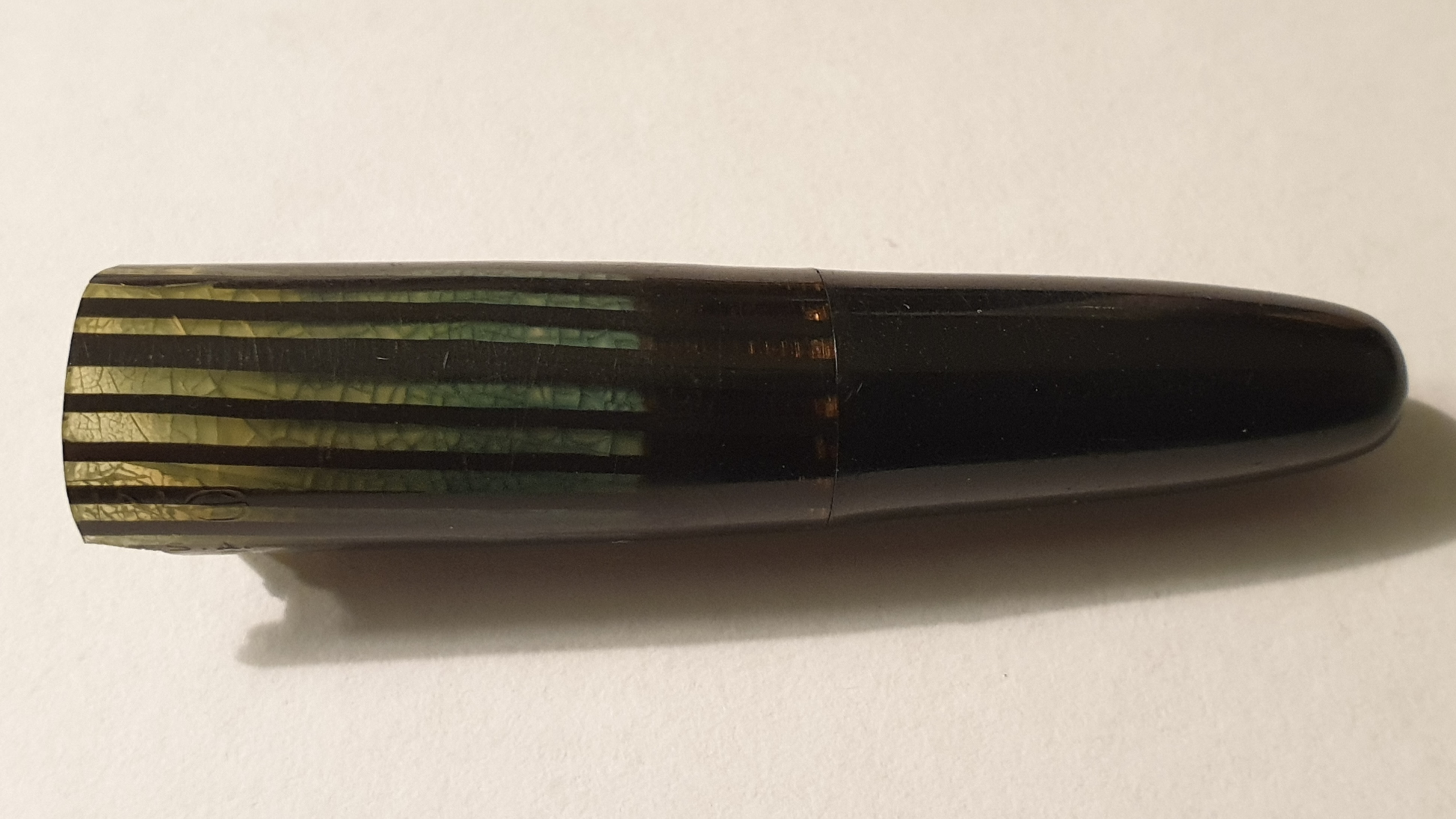Ci vorrebbe un mago! La celluloide del fusto è ormai fragilissima, per cui andrebbe trovato un fusto uguale o andrebbe ricostruito, ma sono imprese difficili. Il pennino è un altro problema, perché ha una punta spezzata e una piccola frattura vicino al foro, ma volendo spenderci un po' di soldi si può far riparare (all'estero). Personalmente lascerò i pezzi in una bustina fino a quando non mi verrà un'idea per renderli utili...