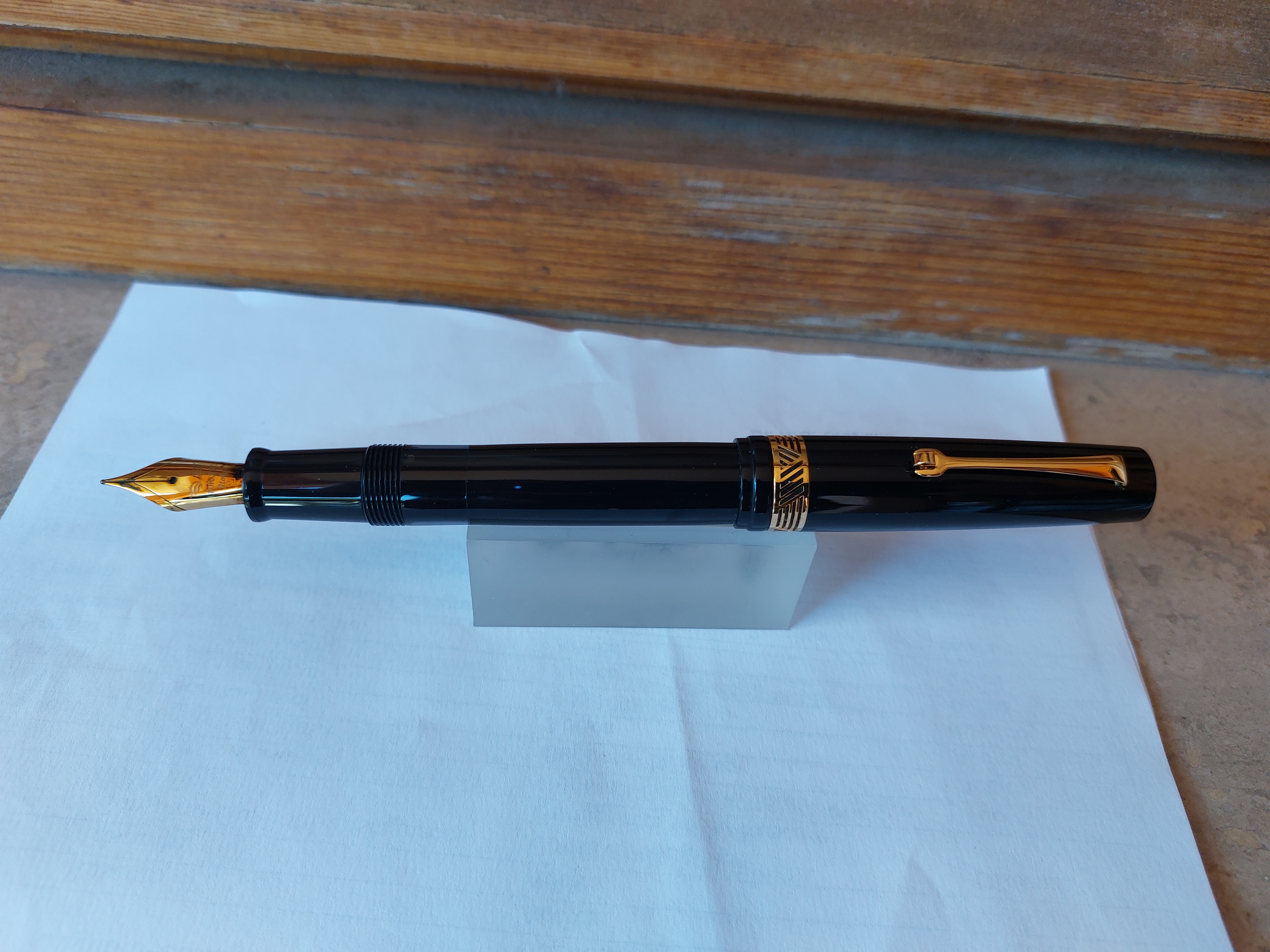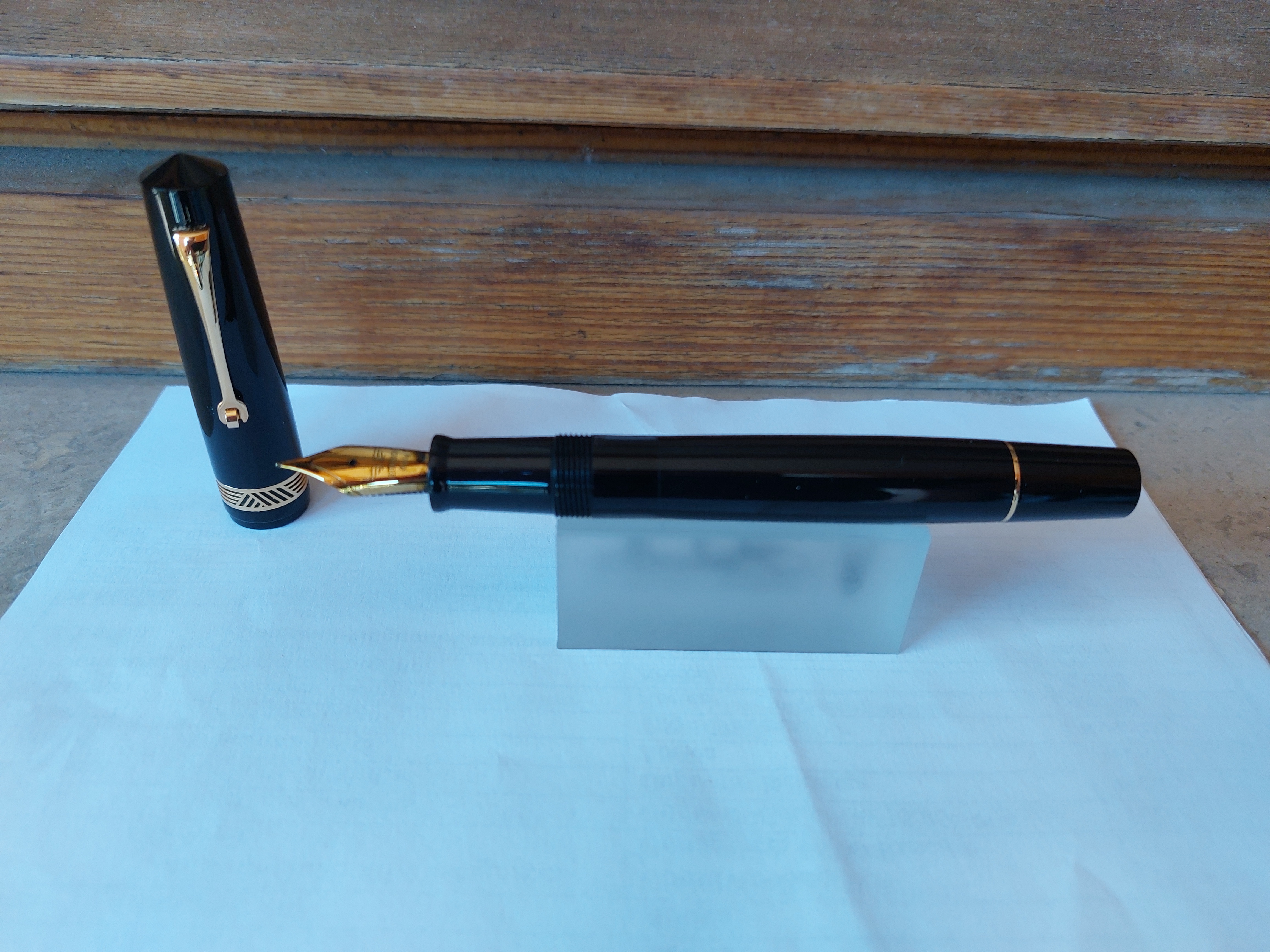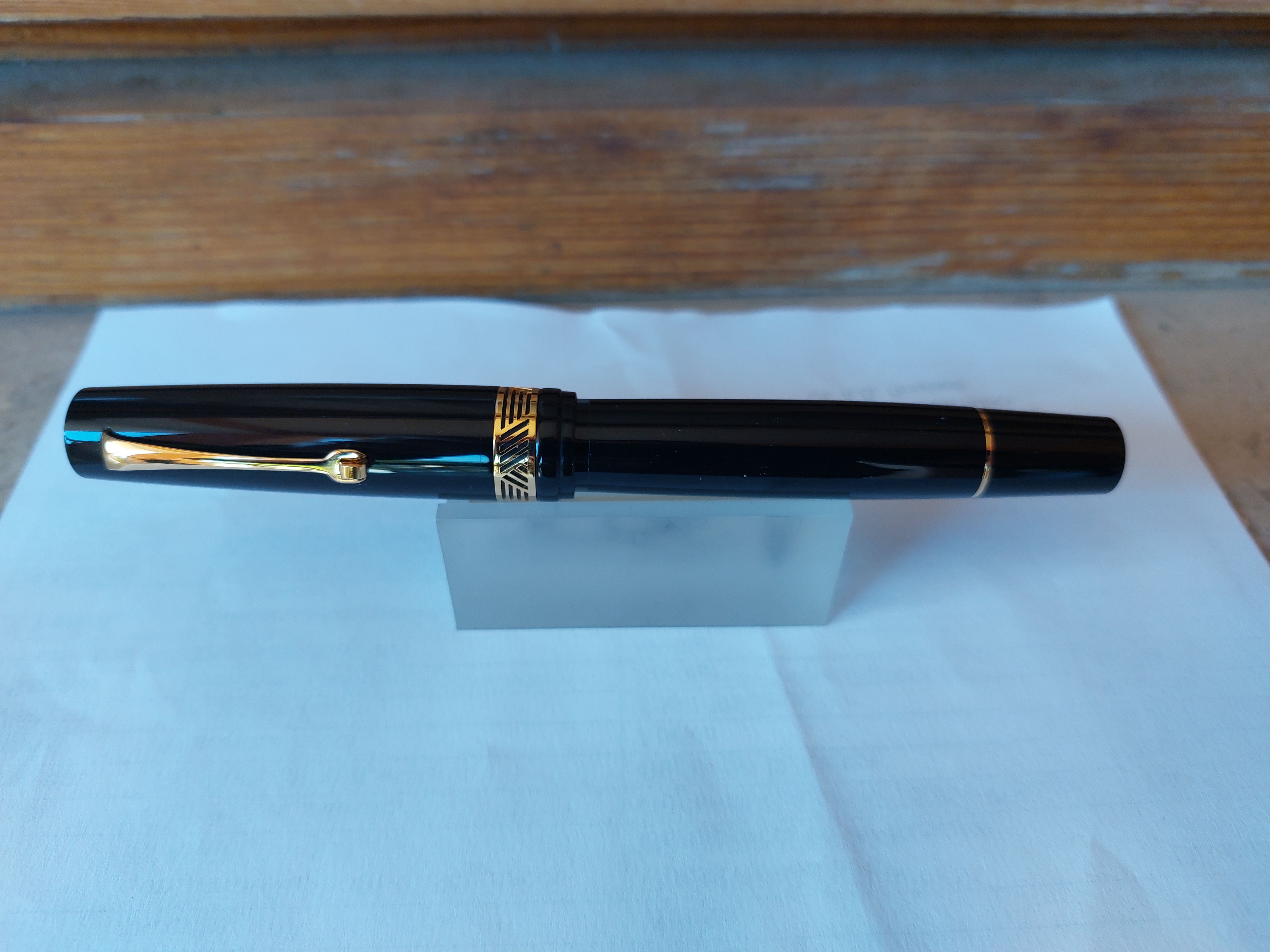 La penna si tiene agevolmente in mano, essendo abbastanza grande (ma non eccessivamente). La forma è ispirata a quella tipica degli anni '30. Verso il fondello c'è una veretta dorata. L'impugnatura, che non presenta lo scomodo e antiestetico gradino, è molto comoda e termina con la classica svasatura alla base del pennino Il pennino è a vite,; ciò rende molto comodo svitarlo per eventuali lavaggi. L'alimentatore è in ABS (da un pò di tempo la Casa li ha cambiati; credo che ora siano della Jowo). La capacità d'inchiostro garantita dal pistone è di 1,5 ml, non poco. Il cappuccio presenta una clip ad innesto con una deliziosa ruzzolina, e verso la base è dotato di una raffinata e delicata decorazione, molto elegante.
