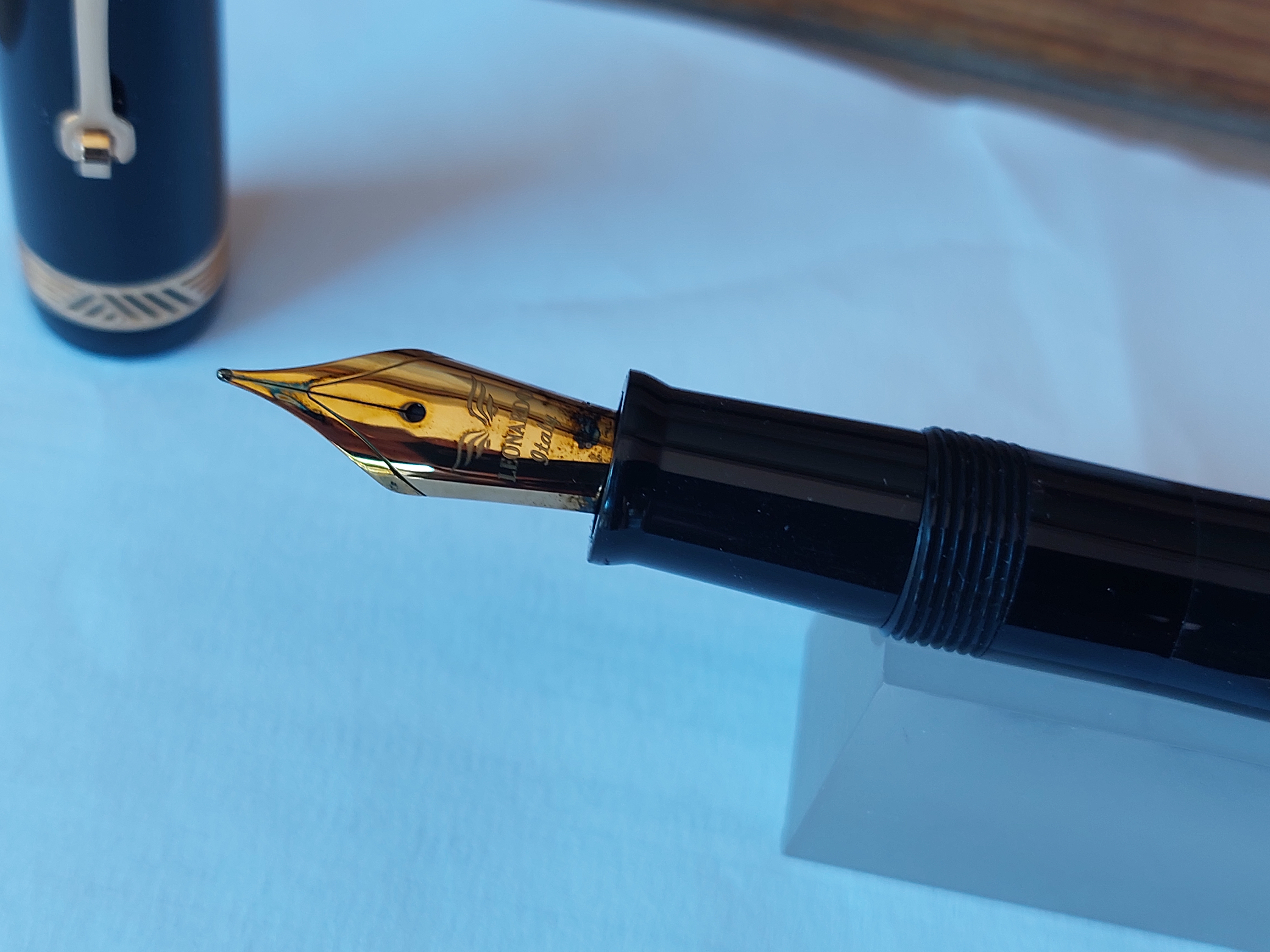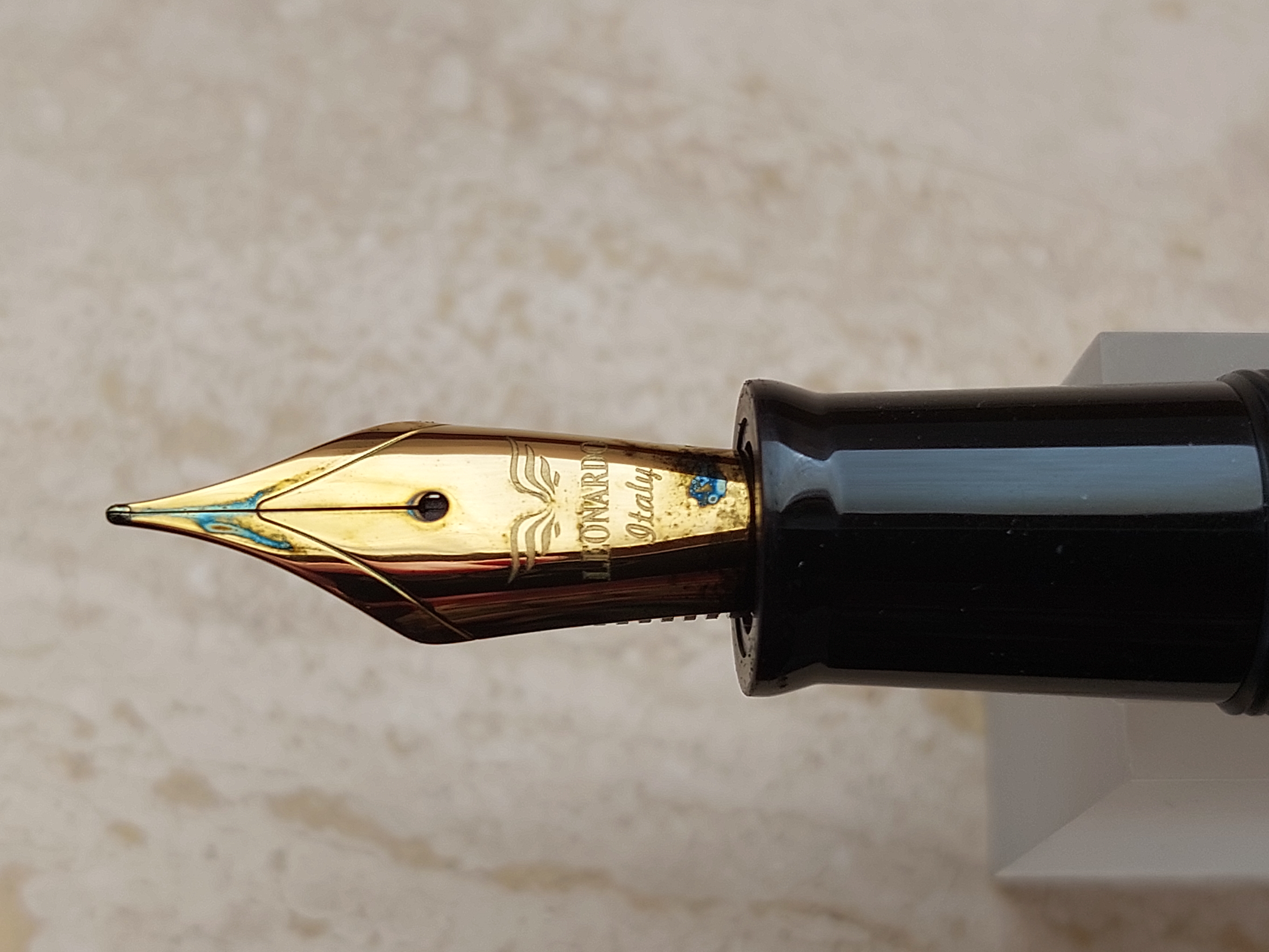 Il pennino in dotazione è in acciaio, in questo caso dorato, offerto in varie gradazioni. Con foro di sfiato circolare centrale, riporta nome e simbolo della Casa. Essendo da tempo tornato sul tratto F (sapendo anche che gli M di Leonardo sono piuttosto spessi), ho scelto proprio F.