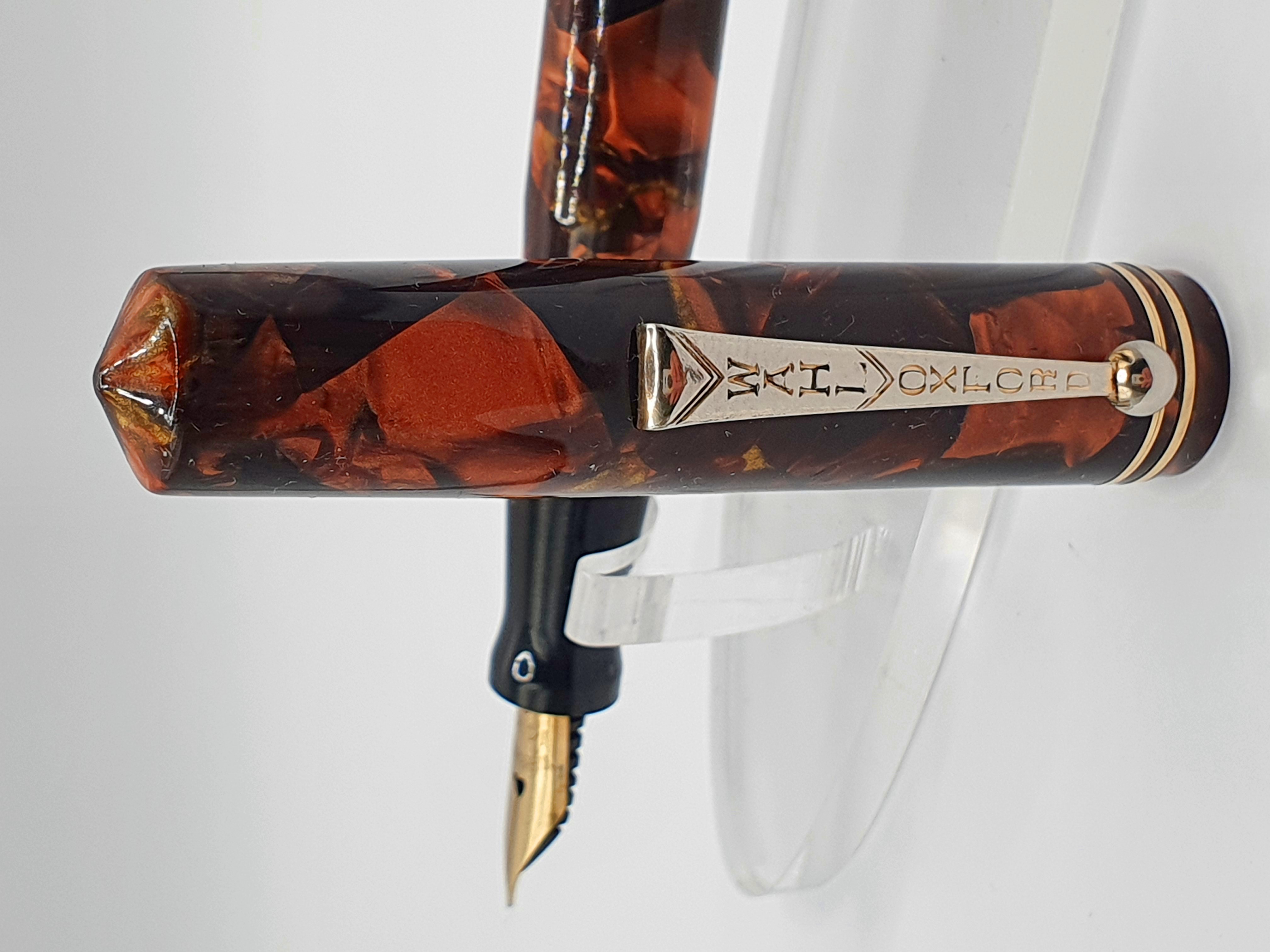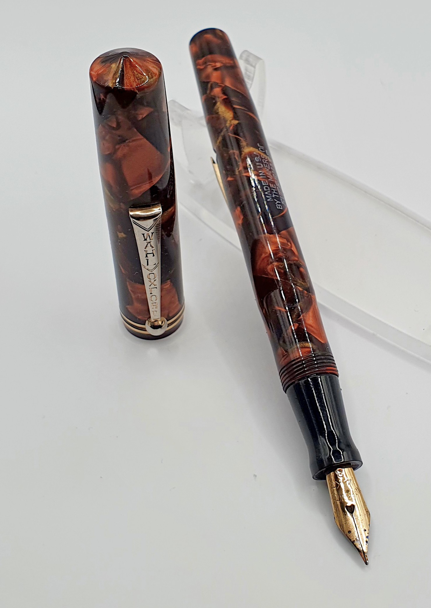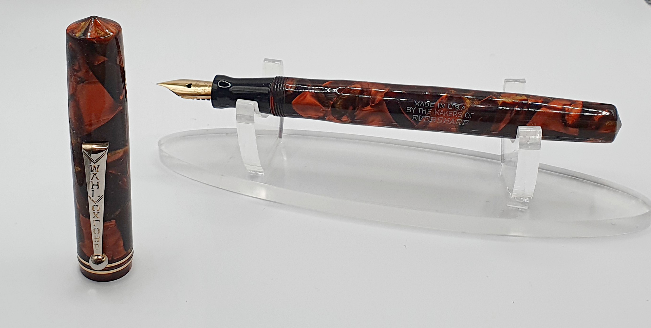 Introdotta nel 1931 e prodotta fino al 1941 in due versioni a levetta, la penna stilografica Wahl Oxford offriva un'alternativa alle più costose penne Doric ed Equi-Poised prodotte da Wahl-Eversharp. Quella che vi mostro oggi è la prima versione realizzata dal 1931 al 1936 circa distinguibile dalla versione prodotta nel quinquennio successivo sia dalle dimensioni che dal posizionamento della clip. Il modello del 1939 è basso e tozzo con la clip vicino alla parte superiore del cappuccio mentre il modello precedente è lungo, snello e la clip è posizionata più in basso sul cappuccio.