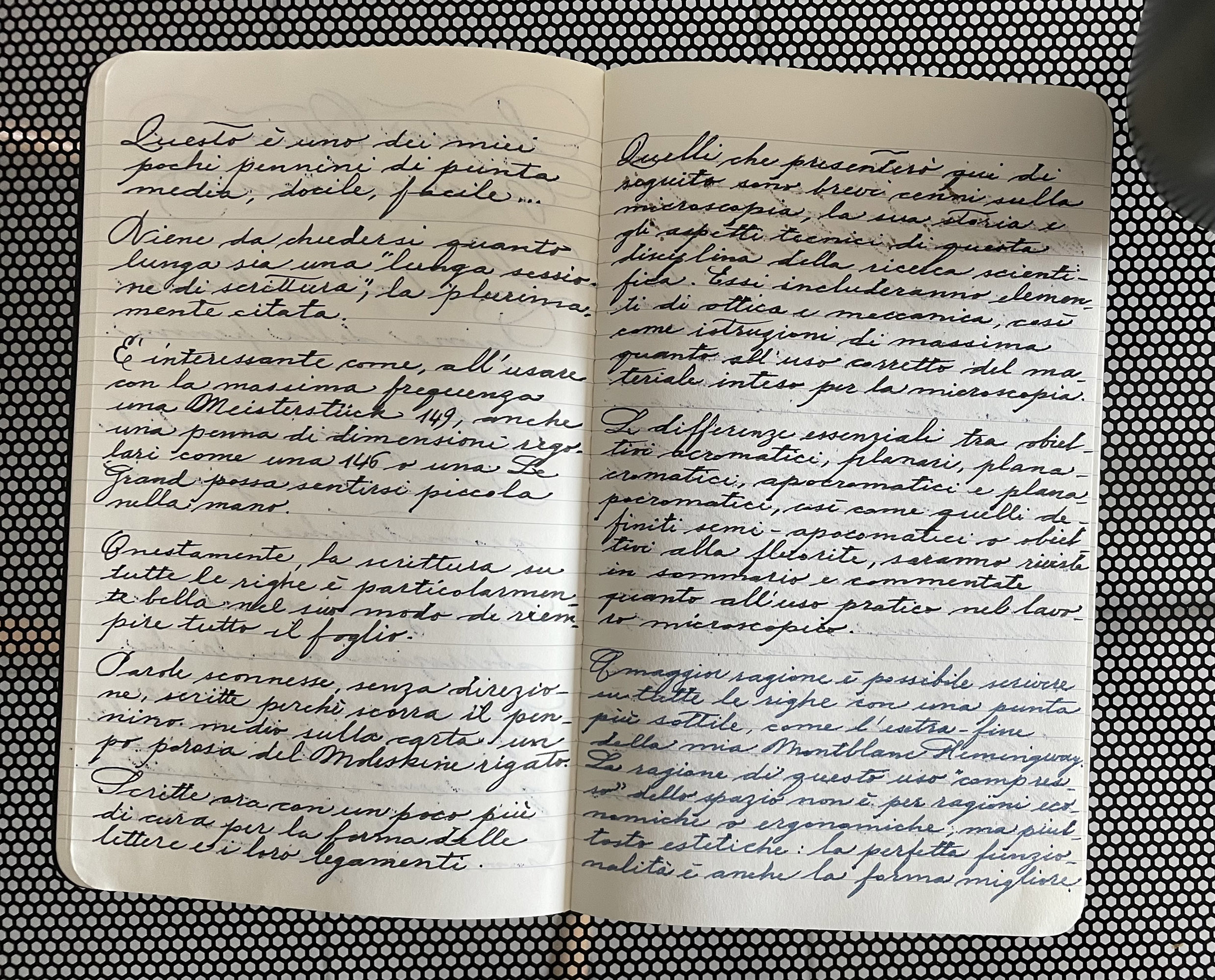 Ho fotografato i due fogli, di dimensioni differenti, con lo stesso ingrandimento, cosí che si possa notare con maggior facilità il risultato dei differenti pennini, con i loro tratti più o meno formali.