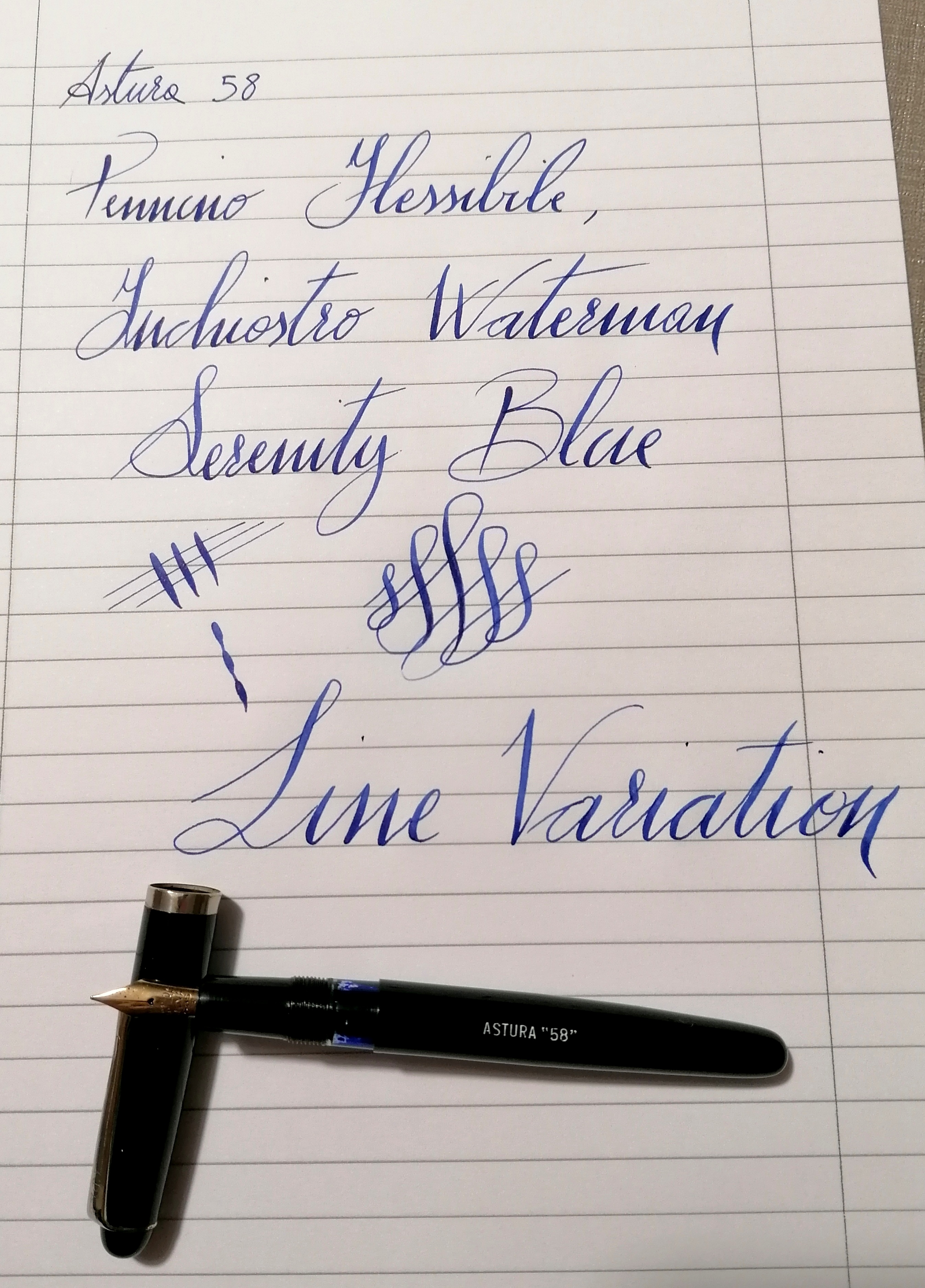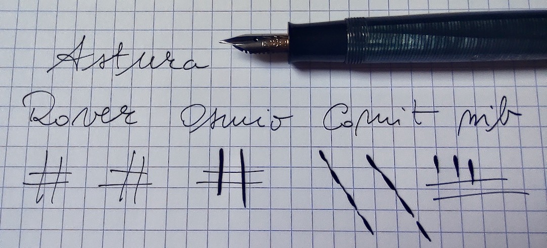 Tornando ai pennini, ho un' altra Astura senza riferimento al modello, di un bel blu carta da zucchero, che monta un Rover Comit in acciaio che presenta una buona flessibilità ed un tratto fine molto bello e scorrevole.