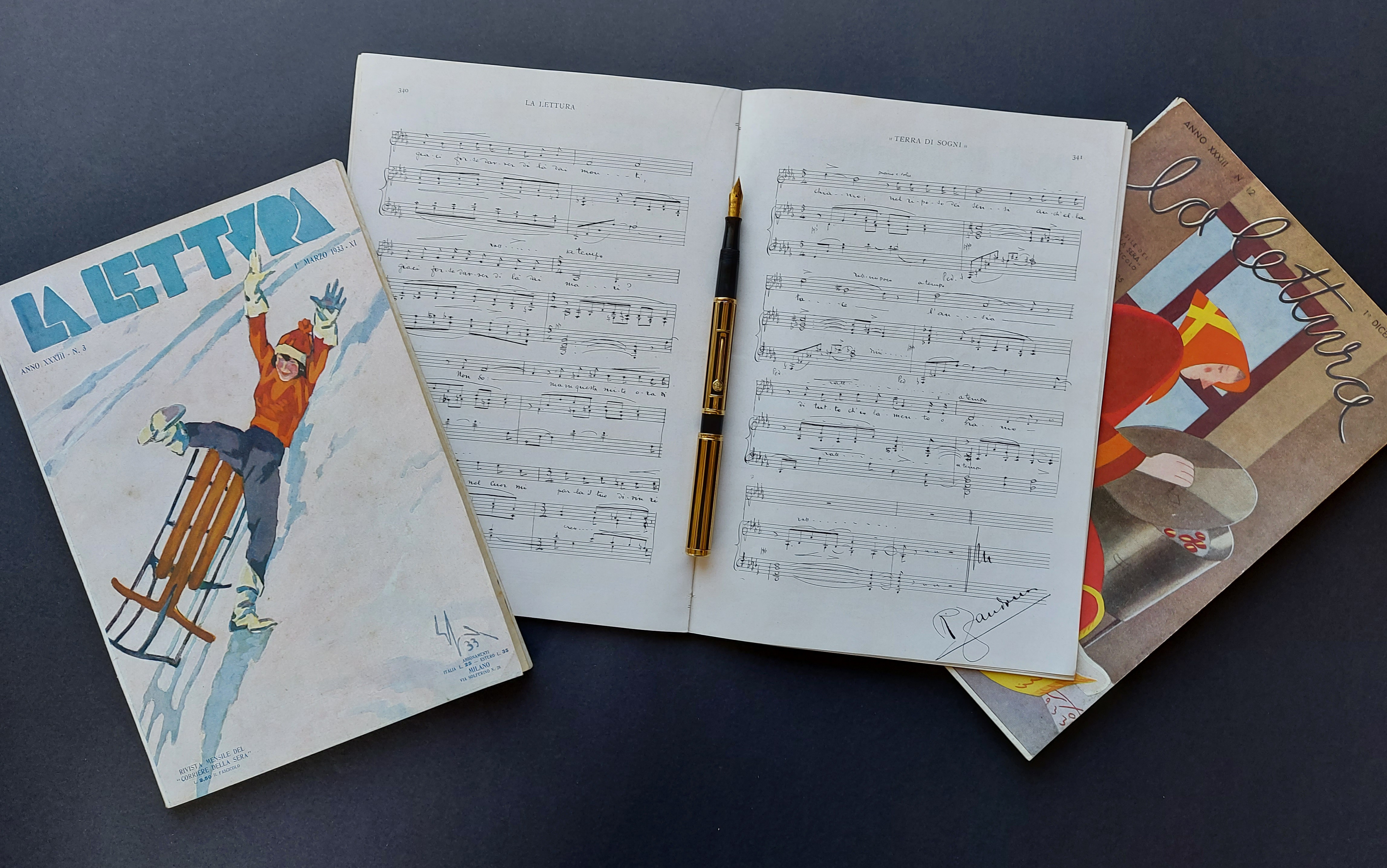 Durante la sua vita Zandonai aveva pubblicato una trentina di “liriche da camera”: nel corso dei decenni, tra quelle stampate dagli Editori musicali solo una dozzina era però rimasta continuativamente disponibile. Come si usava all’epoca, una decina di liriche fu pubblicata su rivista (proprio nelle stesse riviste in cui troviamo le pubblicità delle stilografiche! ;) ), di larga diffusione eppure destinate a scomparire rapidamente dal mercato “musicale”.