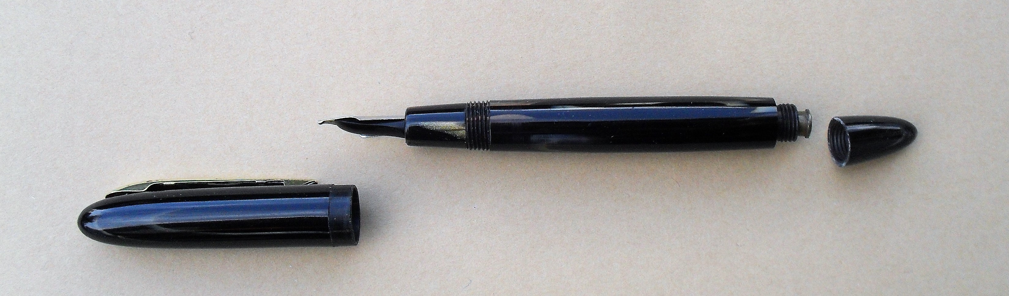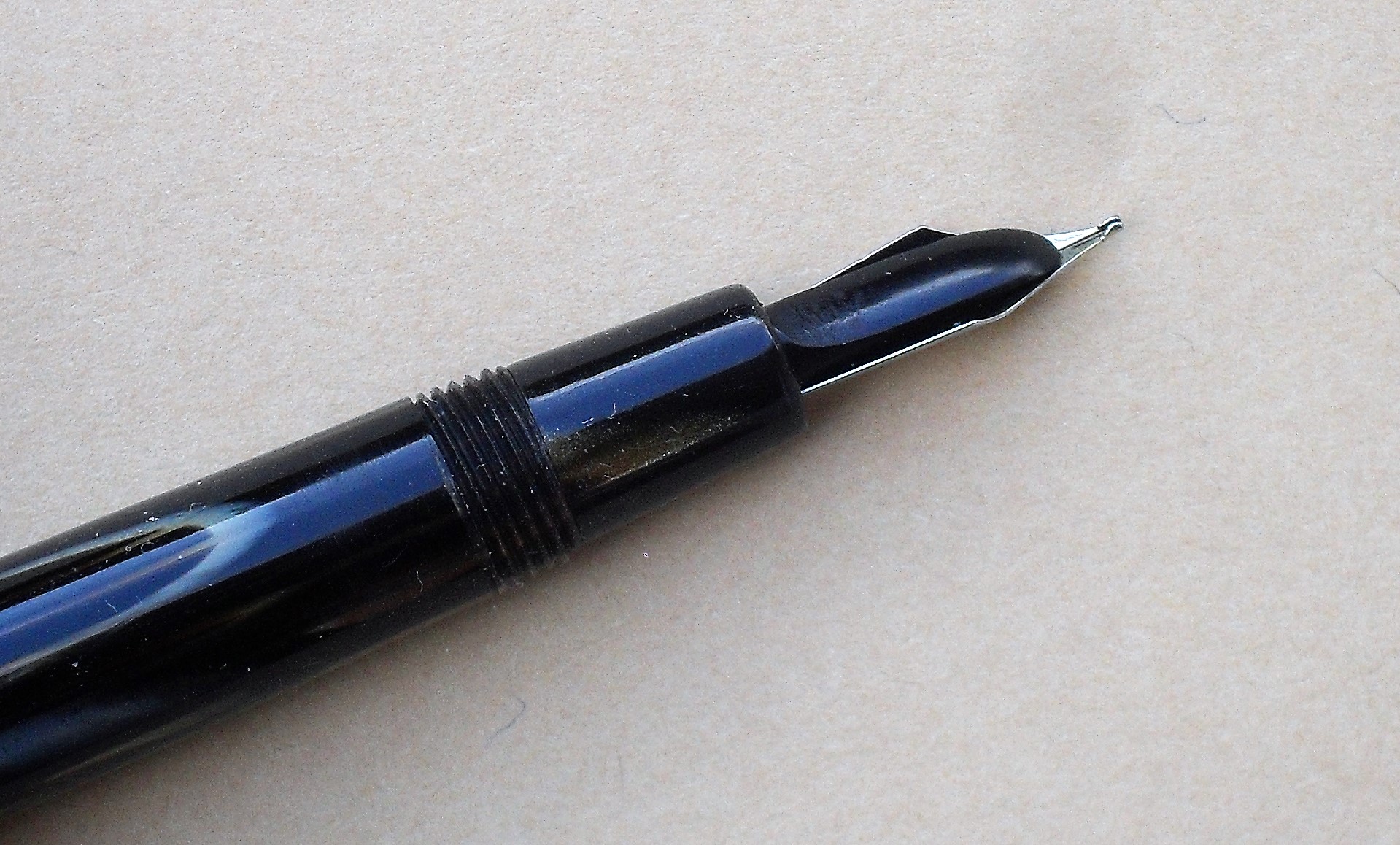 Il pennino, marcato "FC Berica", è in acciaio e, naturalmente, potrebbe trattarsi d'una sostituzione. Provato a secco, nonostante le dimensioni davvero minute, è scorrevole. Ha anche un minimo d'elasticità.