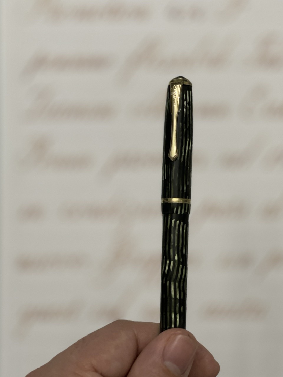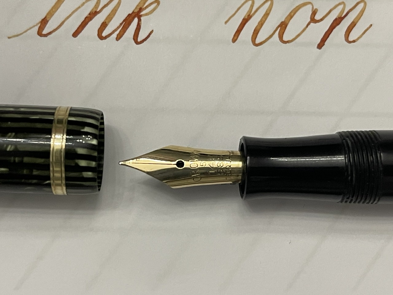 Le condizioni sono perfette, cosa che mi ha portato ad un acquisto veloce e senza troppi pensieri, nonostante non fosse esattamente quel che cercavo: avrei voluto un pennino EF o EEF, ma questa monta un F. Celluloide striata verde con alimentatore in ebanite e pennino Crown 14ct che non mostra il minimo segno del tempo.