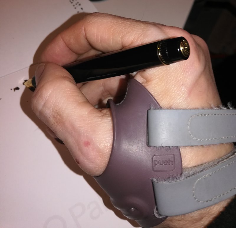 ma difatti , ogni tutore avrà sempre il difetto di impedire la chiusura tra pollice e indice lasciando uno spazio ampio e una riduzione della forza del muscolo del pollice. per questo una penna larga aiuta moltissimo , inoltre, almeno per me, la distaza pennino pollice aumenta per cui la penna viene poggiata molto piu in alto e per un banale gioco di leve il movimento del pennino cambia .
