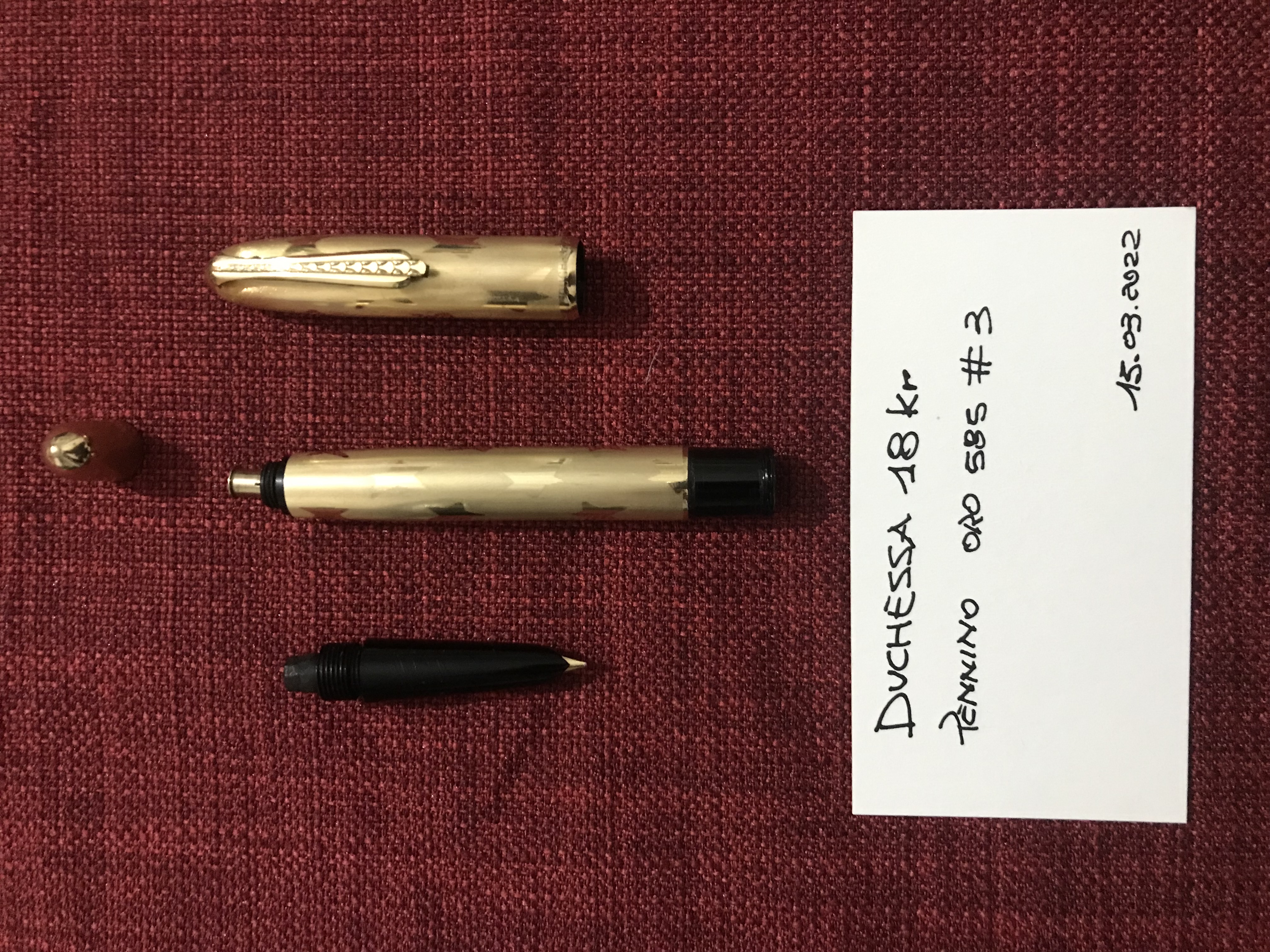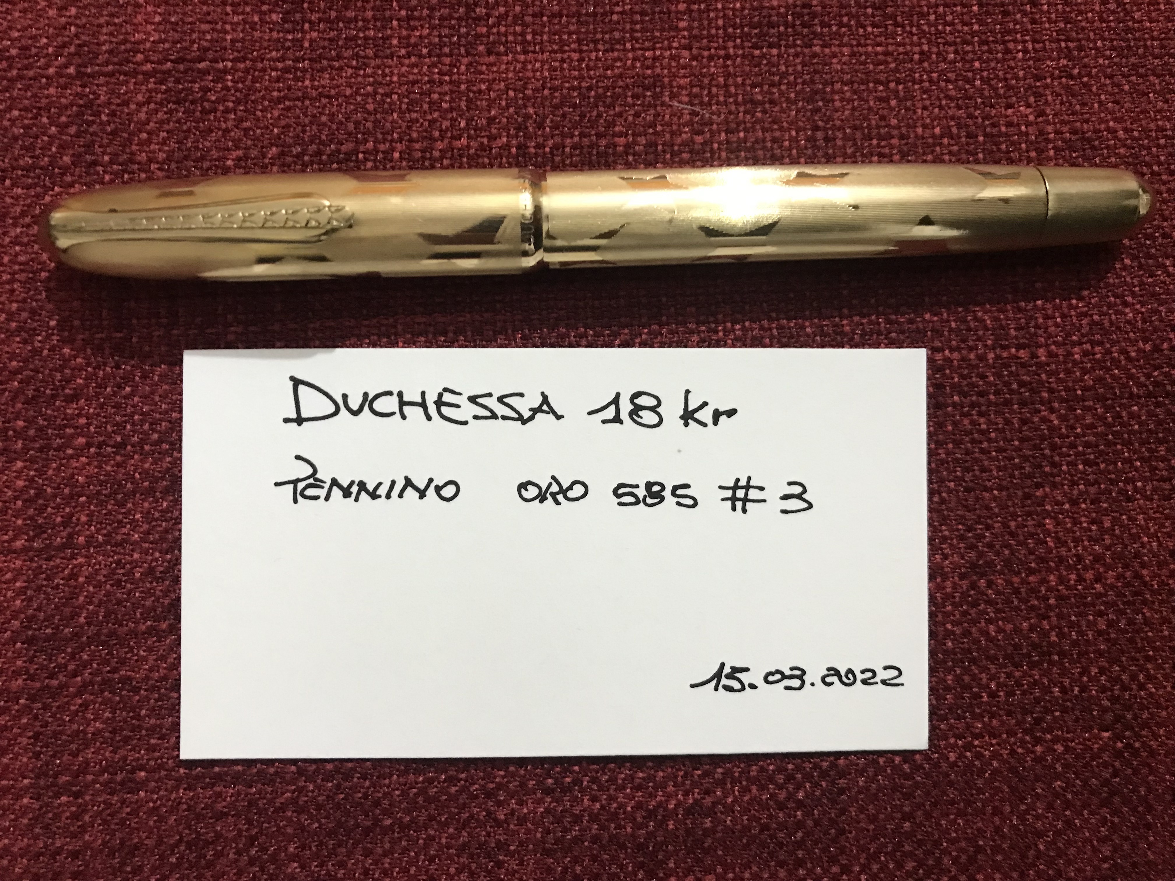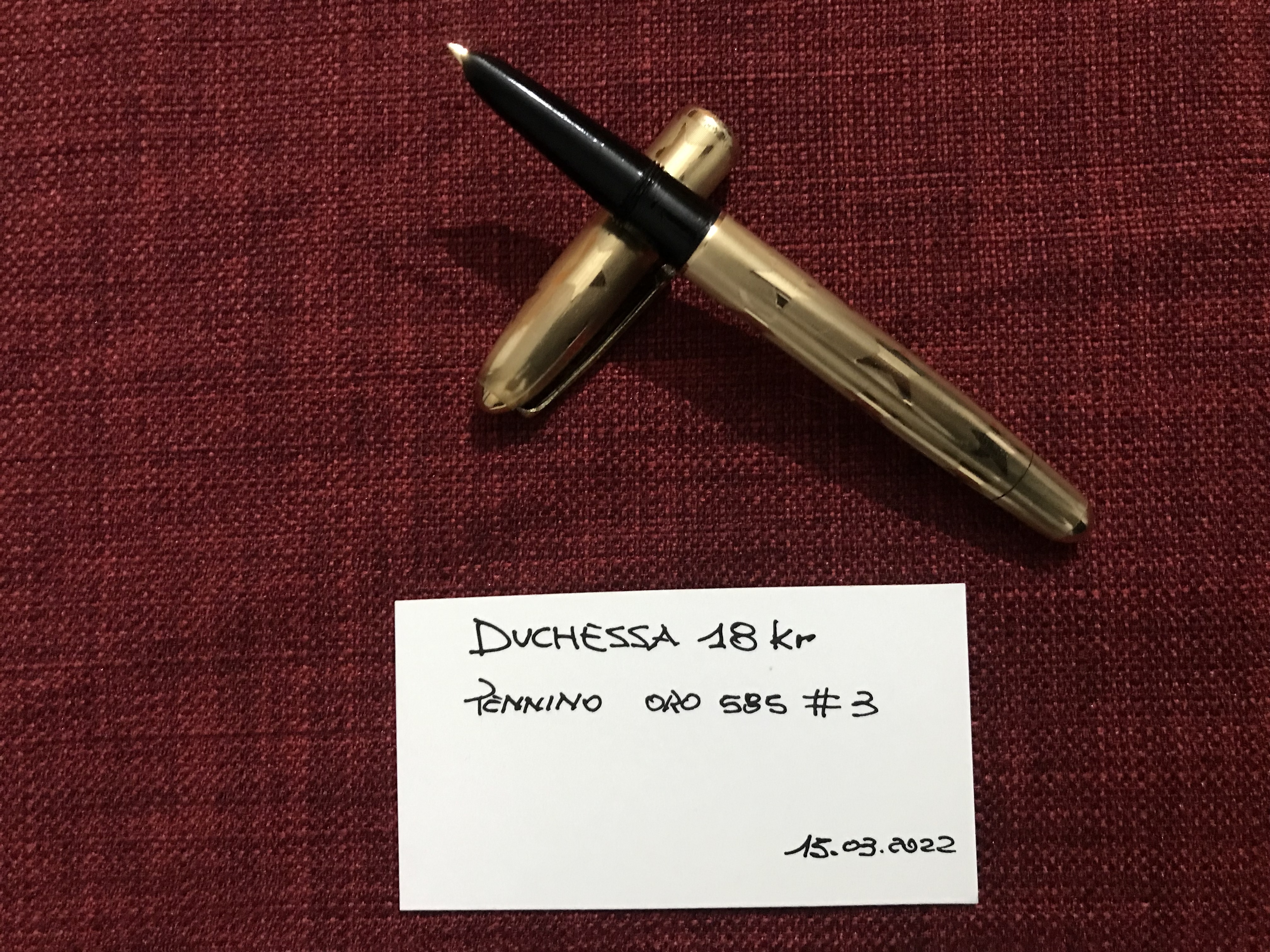 Si tratta di una Duchessa e le uniche informazioni stampate sono: “Duchessa 18Kr” nel cappuccio e “Duchessa oro 585 3” nel pennino.