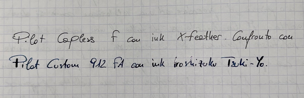 Il pennino mi sembra un po’ più “grattoso” degli altri Pilot, ma le concedo il tempo di fare un attimino di rodaggio. Il confronto nella prova qui sotto sono le primissime righe scritte con la penna nuova