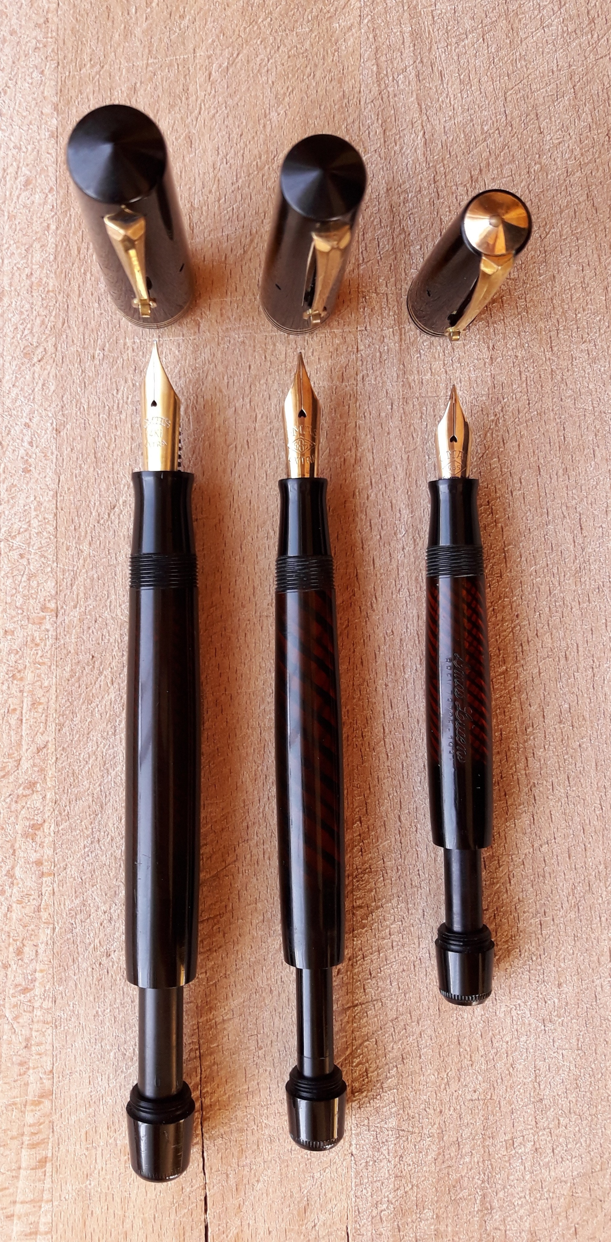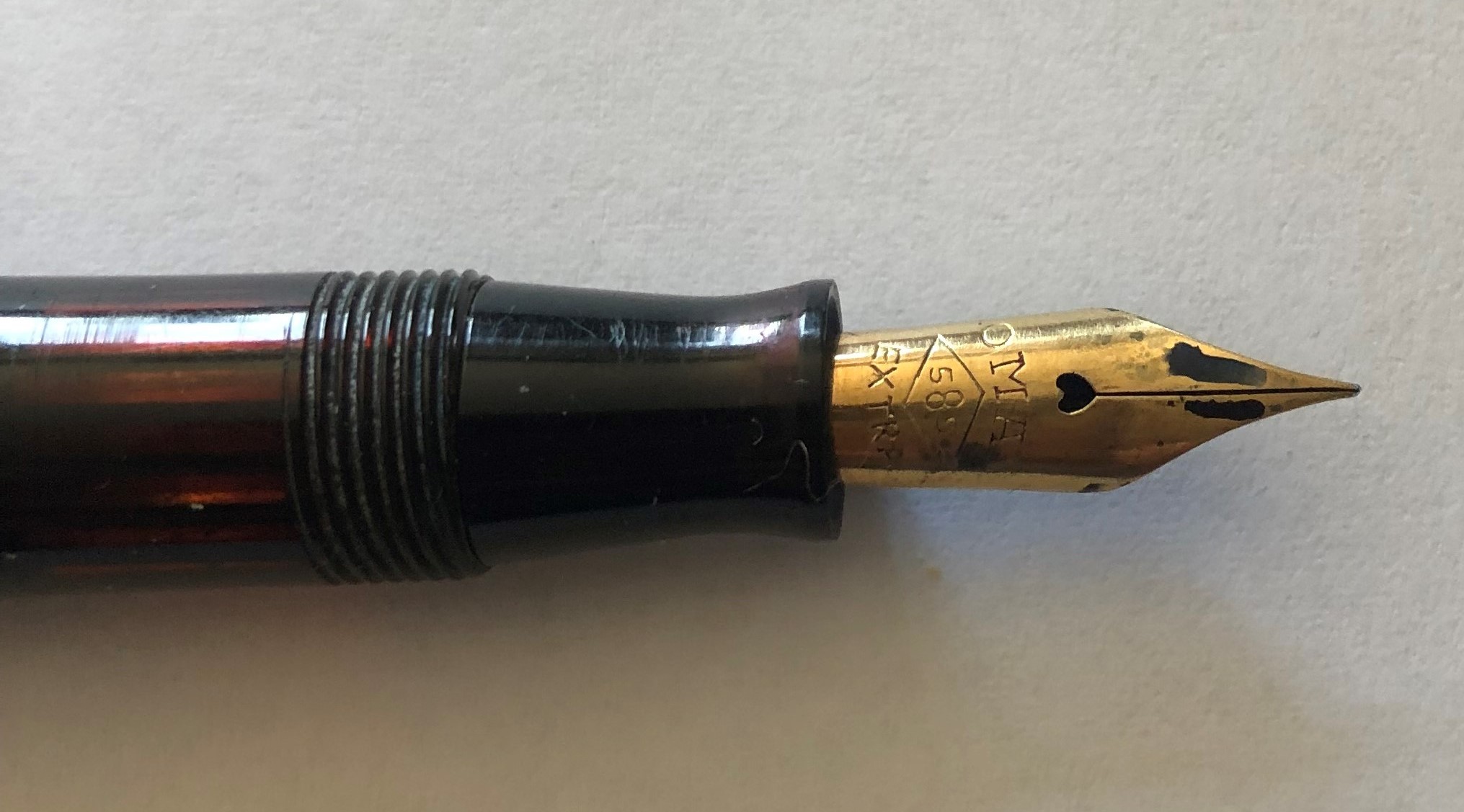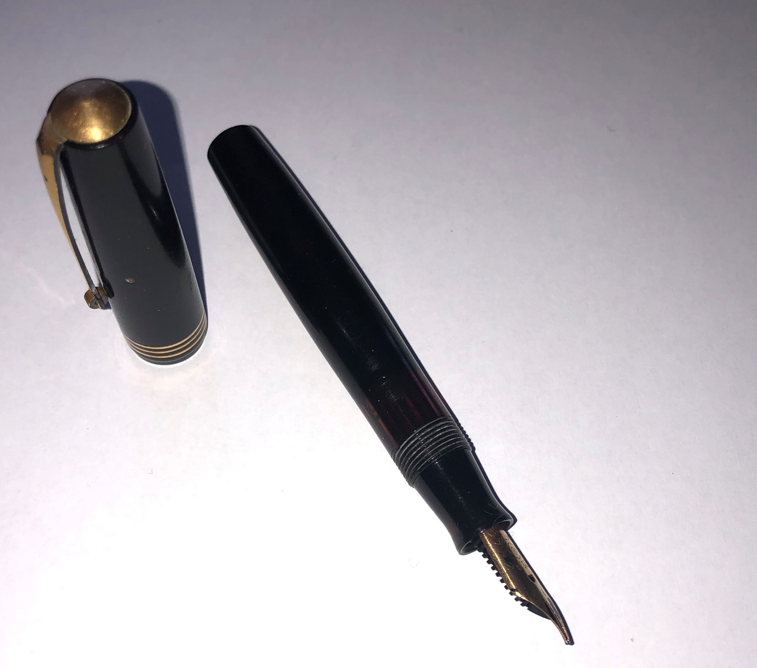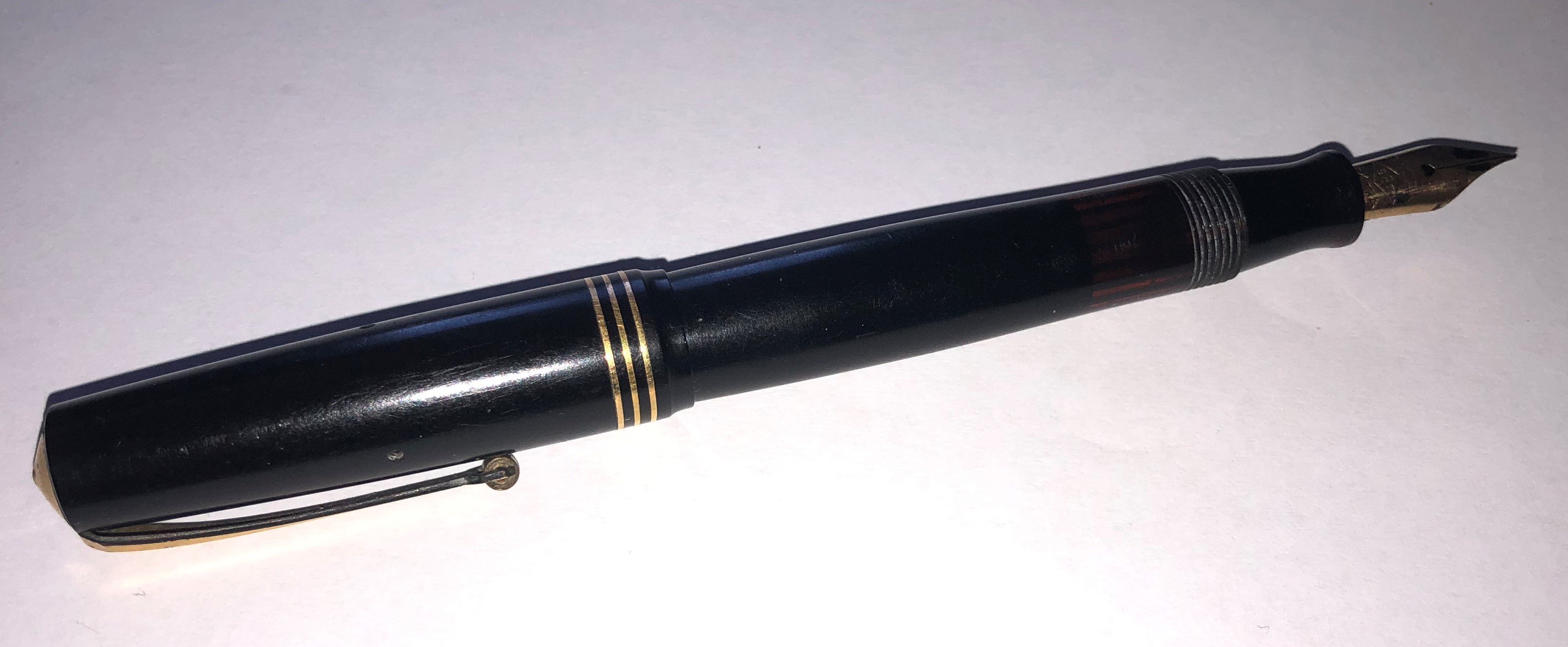 La penna mi sembra in buone condizioni. Il gruppo di scrittura si svita perfettamente dal fusto. Il pennino (meraviglioso) mi sembra integro e scorre perfettamente. Il fondello, dopo attenta pulizia, gira bene e muove perfettamente il pistone nel serbatoio della penna.