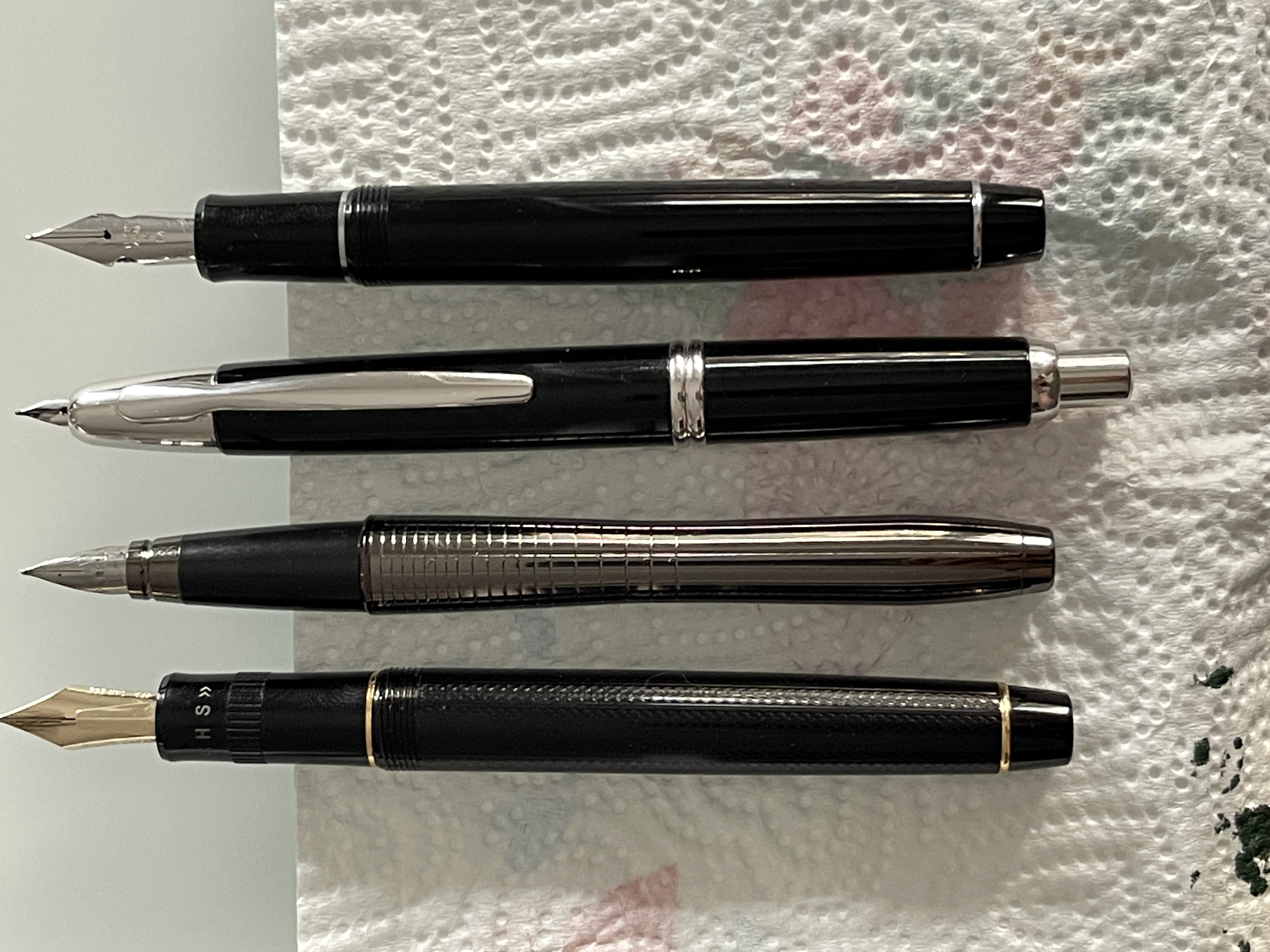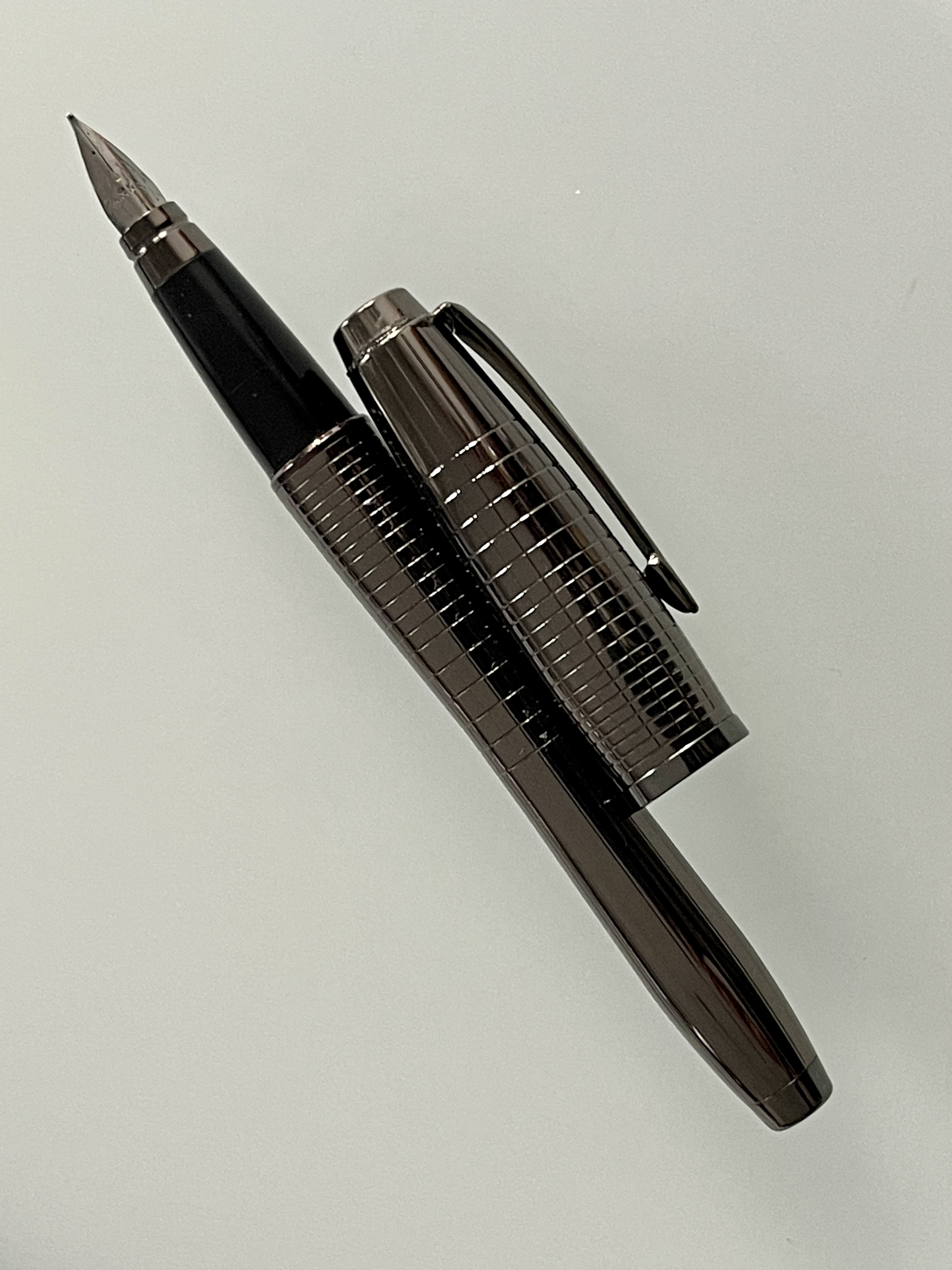 Trovata la posizione corretta per scrivere, tutto sommato la penna è piacevole. Come già scritto, sta molto bene in mano e il peso non è fastidioso. L’alimentatore ha un bel flusso abbondante che rende il pennino un F europeo, paragonabile a un Pelikan, nonostante ci abbia caricato il Diamine Green Black che conosco per essere particolarmente stitico.