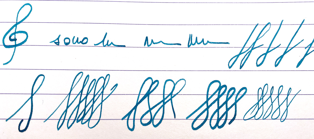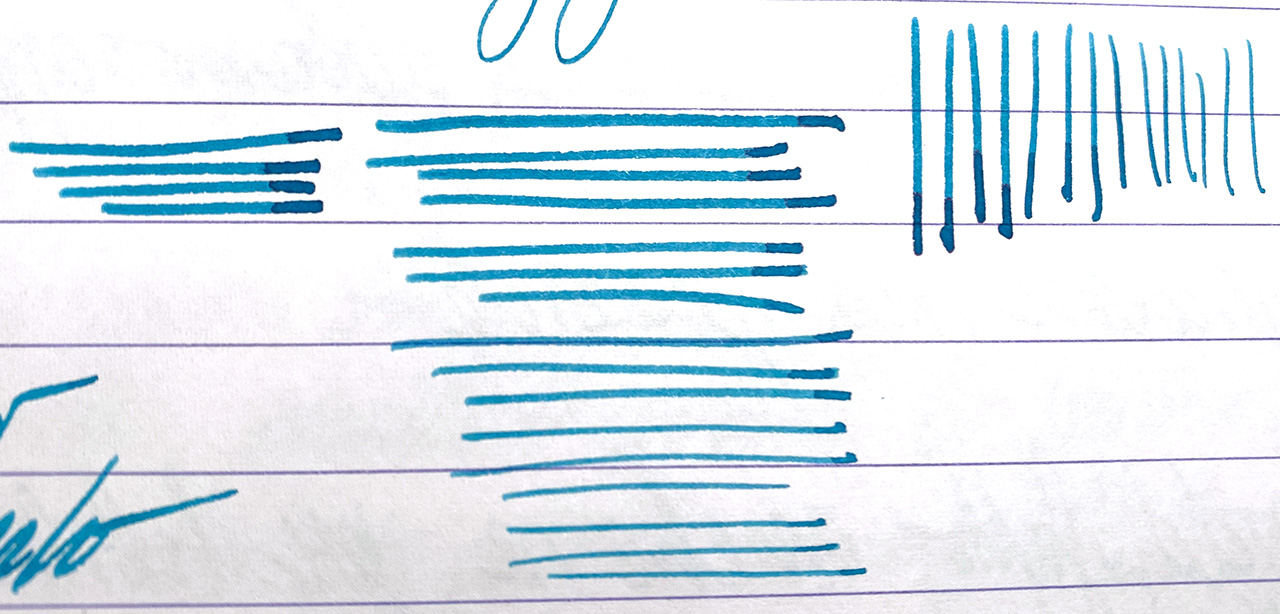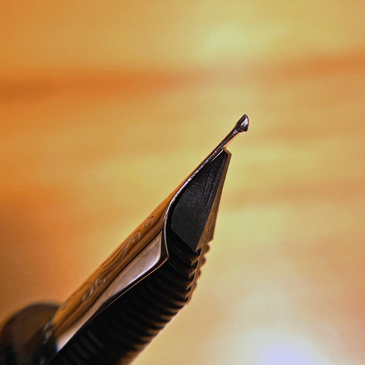 Pennino molto scorrevole con il giusto rumore, presente ma non fastidioso, quando usato di punta e dal feedback costante: si sa sempre dov’è e cosa fa anche se usato di piatto.